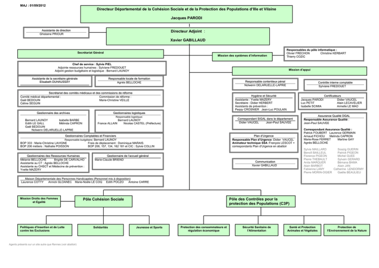 MAJ : 01/09/2012 Directeur Départemental de la Cohésion Sociale et de la Protection des Populations d’Ille et Vilaine Jacques PARODI Assistante de direction Ghislaine PRIOUR Directeur Adjoint : Xavier GABILLAUD Secrétariat Général Mission des systèmes d’information Responsables du pôle informatique : Olivier FRECHON Christine KERBART Thierry COZIC Chef de service : Sylvie PIEL Adjointe ressources humaines : Sylviane FREDOUET Adjoint gestion budgétaire et logistique : Bernard LAUNOY Assistante de la secrétaire générale Elisabeth DUHAUSSAY Mission d’appui Responsable locale de formation Agnès BELLOCHE Responsable contentieux pénal Nolwenn DELARUELLE-LAPRIE Secrétariat des comités médicaux et des commissions de réforme Comité médical départemental : Commission de réforme : Gaël BEDOUIN Marie-Christine VEILLE Céline SEGUIN Gestionnaire des archives Hygiène et Sécurité Assistante : Yvette MAZERY Secrétaire : Didier HERBERT Assistants de prévention : Peggy CROSNIER Jean-Luc POULAIN Gestionnaires logistiques Responsable logistique: Bernard LAUNOY France ALLAIN Nicolas CASTEL (Préfecture) Bernard LAUNOY Isabelle BARBE Edith LE GALL Mélinda CAPRON Gaël BEDOUIN Nolwenn DELARUELLE-LAPRIE Gestionnaires Comptables et Financiers Plan d’Urgence Responsable Plan d’Urgence :Didier VAUCEL Animateur technique SSA :François LESCOT + correspondants Plan d’Urgence en abattoir Frais de déplacement : Dominique MARAIS. BOP 206, 157, 134, 162 181 et CIC : Sylvie COLLIN Gestionnaires des Ressources Humaines Mélanie BELLOCHE Brigitte DE CARVALHO Assistante au CT : Agnès BELLOCHE Assistante au CHSCT et Médecine de prévention : Yvette MAZERY Jacques PARODI Luc PETIT Isabelle SCIMIA Correspondant SIGAL dans le département Didier VAUCEL Jean-Paul SAUVEE Responsable budgétaire: Bernard LAUNOY BOP 333 : Marie-Christine LAVIGNE BOP 206 métiers : Nathalie POISSON Contrôle interne comptable Sylviane FREDOUET Gestionnaire de l’accueil général Marie-Claude BRIEND Certificateurs Didier VAUCEL Alain LECAVELIER Armelle LE MAO Assurance Qualité DGAL Responsable Assurance Qualité : Jean-Paul SAUVEE Correspondant Assurance Qualité : Patrick FOUBERT Laurence GERMAIN Arnaud FICHOU Melinda CAPRON Marie-Rose FERRET Martine GAY Agnès BELLOCHE Sylvie MAILLARD Soazig GUERIN Benoît BAILLEUL Patrick PIGEON Florence PIGEON Michel GUEE Pierre THEBAULT Sylvain GERARD Anita MARQUER Bémana BAMA Alain BARBOT Alain JAN Fabienne LAMY Catherine LENDORMY Pierre MORIN-OGIER Gaëlle BEAULIEU Communication Xavier GABILLAUD ___Maison Départementale des Personnes Handicapées (Personnel mis à disposition) Laurence COTTY Annick GLOANEC Marie-Noële LE COQ Edith POCZO Antoine CARRE Mission Droits des Femmes et Egalité Politiques d’Insertion et de Lutte contre les Exclusions Agents présents sur un site autre que Rennes (voir abattoir) Pôle des Contrôles pour la protection des Populations (C3P) Pôle Cohésion Sociale Solidarités Jeunesse et Sports Protection des consommateurs et régulation économique Sécurité Sanitaire de l’Alimentation Santé et Protection Animales et Végétales Protection de l’Environnement de la Nature POLE COHESION SOCIALE Mission Droits des Femmes et Egalité Sonia MAGALHAES Responsable du Pôle : Anne BOESINGER Assistante administrative : Rozenn STACHOWIAK Politiques d’Insertion et de Lutte contre les Exclusions Chef de service : Jocelyne FAUCHEUX Secrétariat : Isabelle BARBE Solidarités Chef de service : Patrice BEAUX Secrétariat du service : Rozenn STACHOWIAK Unité de lutte contre les exclusions (Accueil-Hébergement-Insertion) Accompagnement des publics prioritaires Jeunesse et Sports Chef de service : Christophe FOUILLERE Secrétariat du service : Rozenn STACHOWIAK Protection de l’usager sportif Responsable de l’unité : Gilles COETMEUR Evelyne JUBEAU : Suivi administratif et financier des établissements-suivi du schéma AHI Brigitte POUREAU : Gestion des dossiers ALT-Exploitation d’enquêtes Christian BOUBEE DE GRAMONT : Logement : gestion des dossiers AGLS, FJT-gestion de dossiers de subvention divers. Coordonnateur de la mission: Patrice BEAUX Assistante administrative : Eliane BELLESSORT Ville Vie Vacances, Parcours d’Animation Sportive, mixité sociale, femmes et sport, lutte contre les discriminations, prévention des conduites à risque. Coordonnatrice de la mission: Nathalie LEROY Prérogatives des éducateurs sportifs : Didier BUET Assistante administrative : Edith LE GALL Réglementation sportive, déclaration des éducateurs et des établissements d'activités physiques et sportives, avis sur les manifestations sportives, commissions de sécurité ERP, homologation des enceintes sportives. Contentieux sportif Accès aux pratiques sportives et culturelles pour les publics prioritaires. BNSSA : Didier BUET, secrétariat : X Assistants sociaux : XX : Régulation des dispositifs d’accès aux logementsMise en œuvre du volet santé schéma-AHI-Suivi du dispositif de domiciliation, suivi du dispositif d’ALT. Rudy POQUERUSSE : Régulation des dispositifs d’hébergement et d’insertion Développement de la pratique sportive Vie associative Coordonnateur de la mission : Nicolas PARQUIC Assistante administrative : Eliane BELLESSORT Unité de la politique en faveur des populations étrangères et de la politique en faveur des personnes adultes en situation de handicap Responsable de l'unité : Pierrette VERGER Michelle KECHIDA : Gestion des dispositifs concernant les populations étrangères : Suivi administratif et financier des structures Gestion des tableaux de bord des populations accueillies Mise en œuvre de la politique en faveur des personnes en situation de handicap : AAH, commissions : Pierrette VERGER Unité de la protection sociale Responsable de l’unité : Sabine GEORGELIN Manuel JOUANNY-RAMEY : Protection des majeurs : Agrément des mandataires judiciaires. Aide sociale : gestion des dossiers des demandes d’alloc