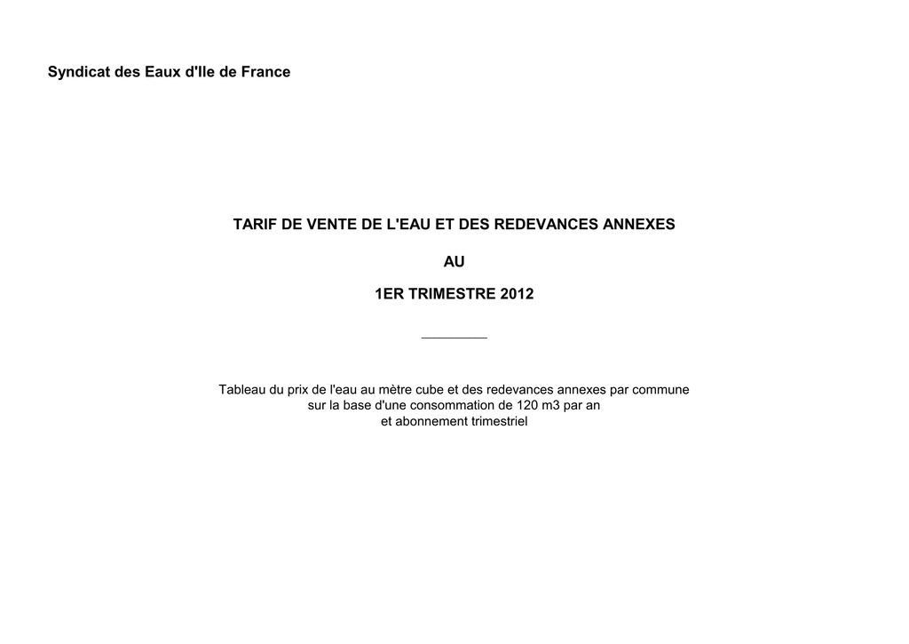 Syndicat des Eaux d'Ile de France TARIF DE VENTE DE L'EAU ET DES REDEVANCES ANNEXES AU 1ER TRIMESTRE 2012 ___________ Tableau du prix de l'eau au mètre cube et des redevances annexes par commune sur la base d'une consommation de 120 m3 par an et abonnement trimestriel FACTURATION AU METRE CUBE SUR LA BASE D'UNE CONSOMMATION DE 120 M3/AN - TARIFS EN EUROS DU 1ER TRIMESTRE 2012 Production & Distribution Eau Potable Dépt. Commune Adhérente du Syndicat d'Assainissement de Collectes et Traitement des eaux usées Total Part Délég. Abt 15 mm Production & au m3 H.T. Part SEDIF H.T. Distribution Eau Redev. Comm Redev. Synd. (Tranche H.T. au m3 (ramené Potable 1) au m3) H.T. Redev. Dép. Organismes publics et TVA Redev. Interdép. Total Collectes et Traitement des eaux usées HT Lutte contre la Pollut° (Agence de l'Eau) Modernisa Développe Préservati t° des ment des on des Réseaux Voies ressource (Agence Navigables s en eau de l'Eau) (VNF) TVA Total Organismes publics et TVA Prix du m3 Prix du m3 H.T. T.T.C. 77 Brou-sur-Chantereine Brou Chelles Vaires 0,8088 0,4500 0,1837 1,4425 T 1,0696 0,4820 1,5516 0,3990 0,3000 0,0780 0,0200 0,2362 1,0332 3,7911 4,0273 77 Chelles Brou Chelles Vaires 0,8088 0,4500 0,1837 1,4425 T 1,0696 0,4820 1,5516 0,3990 0,3000 0,0780 0,0200 0,2362 1,0332 3,7911 4,0273 77 Vaires Brou Chelles Vaires 0,8088 0,4500 0,1837 1,4425 T 1,0696 0,4820 1,5516 0,3990 0,3000 0,0780 0,0200 0,2362 1,0332 3,7911 4,0273 77 Villeparisis Villeparisis 0,8088 0,4500 0,1837 1,4425 1,4603 2,0977 0,3990 0,3000 0,0780 0,0200 0,1723 0,9693 4,3372 4,5095 78 Houilles Majoration Majoration Majoration Majoratio 0,8088 0,4500 0,1837 1,4425 0,2518 0,4820 0,7338 0,3990 0,3000 0,0780 0,0200 0,1614 0,9584 2,9733 3,1347 78 Houilles Houilles-Bezons 0,8088 0,4500 0,1837 1,4425 0,2518 0,3126 0,4820 1,0464 0,3990 0,3000 0,0780 0,0200 0,1614 0,9584 3,2859 3,4473 78 Jouy-en-Josas Vallée de la Bièvre 0,8088 0,4500 0,1837 1,4425 T 0,7710 0,3035 0,4820 1,5565 0,3990 0,3000 0,0780 0,0200 0,2153 1,0123 3,7960 4,0113 78 Loges-en-Josas Vallée de la Bièvre 0,8088 0,4500 0,1837 1,4425 T 0,5904 0,3035 0,4820 1,3759 0,3990 0,3000 0,0780 0,0200 0,2027 0,9997 3,6154 3,8181 78 Mesnil-le Roi (Le) Sartrouville - Mesnil le Roi 0,8088 0,4500 0,1837 1,4425 T 0,7248 0,1800 0,4820 1,3868 0,3990 0,3000 0,0780 0,0200 0,2247 1,0217 3,6263 3,8510 78 Sartrouville 0,8088 0,4500 0,1837 1,4425 T 0,8200 0,4820 1,3020 0,3990 0,3000 0,0780 0,0200 0,2188 1,0158 3,5415 3,7603 78 Sartrouville Sartrouville - Mesnil le Roi 0,8088 0,4500 0,1837 1,4425 T 0,8200 0,1800 0,4820 1,4820 0,3990 0,3000 0,0780 0,0200 0,2314 1,0284 3,7215 3,9529 78 Sartrouville Val Notre Dame 0,8088 0,4500 0,1837 1,4425 T 0,8200 0,2600 0,4820 1,5620 0,3990 0,3000 0,0780 0,0200 0,2188 1,0158 3,8015 4,0203 78 Vélizy Vallée du Ru de Marivel 0,8088 0,4500 0,1837 1,4425 0,2150 0,4826 0,4820 1,1796 0,3990 0,3000 0,0780 0,0200 0,1952 0,9922 3,4191 3,6143 78 Vélizy Vallée de la Bièvre 0,8088 0,4500 0,1837 1,4425 0,2150 0,3035 0,4820 1,0005 0,3990 0,3000 0,0780 0,0200 0,1614 0,9584 3,2400 3,4014 78 Viroflay Vallée du Ru de Marivel 0,8088 0,4500 0,1837 1,4425 0,4248 T 0,4826 0,4820 1,3894 0,3990 0,3000 0,0780 0,0200 0,1952 0,9922 3,6289 3,8241 91 Athis-Mons Vallée de l'Orge Majoration Majoration Majoratio 0,8088 0,4500 0,1837 1,4425 T 0,5195 T 0,7247 1,2442 0,3990 0,3000 0,0780 0,0200 0,2147 1,0117 3,4837 3,6984 91 Bièvres Vallée de la Bièvre 0,8088 0,4500 0,1837 1,4425 T 0,7607 0,3035 0,4820 1,5462 0,3990 0,3000 0,0780 0,0200 0,2146 1,0116 3,7857 4,0003 91 Igny Vallée de la Bièvre 0,8088 0,4500 0,1837 1,4425 T 0,9098 0,3035 0,4820 1,6953 0,3990 0,3000 0,0780 0,0200 0,2251 1,0221 3,9348 4,1599 91 Juvisy Vallée de l'Orge 0,8088 0,4500 0,1837 1,4425 T 0,5062 1,2309 0,3990 0,3000 0,0780 0,0200 0,2138 1,0108 3,4704 3,6842 91 Massy Vallée de la Bièvre 0,8088 0,4500 0,1837 1,4425 T 0,2565 0,3035 0,4820 1,0420 0,3990 0,3000 0,0780 0,0200 0,1793 0,9763 3,2815 3,4608 91 Palaiseau Vallée de la Bièvre 0,8088 0,4500 0,1837 1,4425 0,5010 0,3035 0,4820 1,2865 0,3990 0,3000 0,0780 0,0200 0,1614 0,9584 3,5260 3,6874 91 Palaiseau Vallée de l'Yvette 0,8088 0,4500 0,1837 1,4425 0,5010 0,5722 0,4820 1,5552 0,3990 0,3000 0,0780 0,0200 0,2014 0,9984 3,7947 3,9961 91 Verrières-le-Buisson Vallée de la Bièvre 0,8088 0,4500 0,1837 1,4425 T 0,3408 0,3035 0,4820 1,1263 0,3990 0,3000 0,0780 0,0200 0,1852 0,9822 3,3658 3,5510 91 Wissous 0,8088 0,4500 0,1837 1,4425 T 0,3408 0,4820 0,8228 0,3990 0,3000 0,0780 0,0200 0,1852 0,9822 3,0623 3,2475 T T T T T T 0,6374 0,7247 La taxe de modernisation des réseaux et les redevances (à l'exception des communales et syndicales d 'assainissement qui ne sont pas précédées par la lettre T) sont soumises à un taux de TVA de 7%; les autres composantes supportent un taux de 5,5 % FACTURATION AU METRE CUBE SUR LA BASE D'UNE CONSOMMATION DE 120 M3/AN - TARIFS EN EUROS DU 1ER TRIMESTRE 2012 Production & Distribution Eau Potable Dépt. Commune Adhérente du Syndicat d'Assainissement de Collectes et Traitement des eaux usées Total Part Délég. Abt 15 mm Production & au m3 H.T. Part SEDIF H.T. Distribution Eau Redev. Comm Redev. Synd. (Tranche H.T. au m3 (ramené Potable 1) au m3) H.T. Redev. Dép. Redev. Interdép. Lutte contre la Pollut° (Agence de l'Eau) Modernisa Développe Préservati t° des ment des on des Réseaux Voies ressource (Agence Navigables s en eau de l'Eau) (VNF) TVA Total Organismes publics et TVA Prix du m3 Prix du m3 H.T. T.T.C. 92 Antony 0,8088 0,4500 0,1837 1,4425 0,3408 0,5237 0,8100 1,6745 0,3990 0,3000 0,0780 0,0200 0,2449 1,0419 3,9140 4,1589 92 Bagneux 0,8088 0,4500 0,1837 1,4425 0,3000 0,5237 0,8100 1,6337 0,3990 0,3000 0,0780 0,0200 0,2210 1,0180 3,8732 4,0942 92 Boulogne-Billancourt 0,8088 0,4500 0,1837 1,4425 0,1640 0,5237 0,8100 1,4977 0,3990 0,3000 0,0780 0,0200 0,2210 1,0180 3,7372 3,9582 92 Bourg-La-Reine 0,8088 0,4500 0,1837 1,4425 T 0,3408 0,5237 0,8100 1,6745 0,3990 0,3000 0,0780 0,0200 0,2449 1,0419 3,9140 4,1