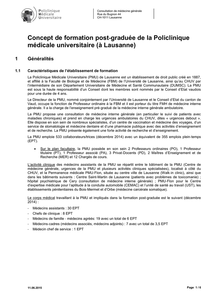 Consultation de médecine générale Rue du Bugnon 44 CH-1011 Lausanne Concept de formation post‐graduée de la Policlinique médicale universitaire (à Lausanne) 1 Généralités 1.1 Caractéristiques de l’établissement de formation La Policlinique Médicale Universitaire (PMU) de Lausanne est un établissement de droit public créé en 1887, et affilié à la Faculté de Biologie et de Médecine (FBM) de l’Université de Lausanne, ainsi qu’au CHUV par l’intermédiaire de son Département Universitaire de Médecine et Santé Communautaire (DUMSC). La PMU est sous la haute responsabilité d’un Conseil dont les membres sont nommés par le Conseil d’Etat vaudois pour une durée de 4 ans. Le Directeur de la PMU, nommé conjointement par l’Université de Lausanne et le Conseil d’Etat du canton de Vaud, occupe la fonction de Professeur ordinaire à la FBM et il est porteur du titre FMH de médecine interne générale. Il a la charge de l’enseignement pré-gradué de la médecine interne générale ambulatoire. La PMU propose une consultation de médecine interne générale (en particulier le suivi de patients avec maladies chroniques) et prend en charge les urgences ambulatoires du CHUV, dites « urgences debout ». Elle dispose en son sein de nombreux spécialistes, d’un centre de vaccination et médecine des voyages, d’un service de stomatologie et médecine dentaire et d’une pharmacie publique avec des activités d’enseignement et de recherche. La PMU présente également une forte activité de recherche et d’enseignement. La PMU emploie 533 collaborateurs/trices (décembre 2014) avec un équivalent de 355 emplois plein‐temps (EPT). • Sur le plan facultaire, la PMU possède en son sein 2 Professeurs ordinaires (PO), 1 Professeur titulaire (PT), 1 Professeur associé (PA), 3 Privat‐Docents (PD), 2 Maîtres d’Enseignement et de Recherche (MER) et 12 Chargés de cours. L’activité clinique des médecins assistants de la PMU se répartit entre le bâtiment de la PMU (Centre de médecine générale, urgences de la PMU et plusieurs activités cliniques spécialisées), localisé à côté du CHUV, et la Permanence médicale PMU‐Flon, située au centre ville de Lausanne (Walk‐in clinic), ainsi que dans les bâtiments suivants : Centre Saint‐Martin de Lausanne (patients avec problèmes de toxicomanie) ; hôpital psychiatrique de Cery (consultation de médecine interne générale) ; PMU‐Flon pour le Centre d’expertise médicale pour l’aptitude à la conduite automobile (CEMAC) et l’unité de santé au travail (UST), les établissements pénitentiaires du Bois‐Mermet et d’Orbe (médecine carcérale somatique). Le corps médical travaillant à la PMU et impliqués dans la formation post‐graduée est le suivant (décembre 2014) : ‐ ‐ ‐ ‐ ‐ Médecins assistants : 30 EPT Chefs de clinique : 8 EPT Médecins de famille ‐ médecins agréés: 19 avec un total de 6 EPT Médecins‐cadres (médecins associés, médecins adjoints) : 7 avec un total de 3,5 EPT Médecin chef de service : 1 EPT 11.06.2015 Page 1 / 6 Consultation de médecine générale Rue du Bugnon 44 CH-1011 Lausanne Lien avec le Département de médecine interne du CHUV : les médecins‐assistants de la PMU peuvent solliciter l’avis des médecins spécialistes des services de cardiologie, angiologie, pneumologie, gastroentérologie, hématologie, immuno‐allergologie, gériatrie et endocrinologie - diabétologie ‐ métabolisme, dont les activités ambulatoires sont réalisées dans le bâtiment de la PMU. En outre, chaque année, entre 8 et 10 médecins‐assistants du service de médecine interne du CHUV (resp. Prof Gérard Waeber) effectuent une rotation à la PMU (6 mois si travail à 100%, 12 mois si travail à 50%) ; le choix de ces médecins est du ressort du Prof. Gérard Waeber. Lien avec les médecins de famille : les médecins‐assistants de la PMU bénéficient chaque 2 mois d’une demi‐journée de conseils pratiques par un médecin de famille. Lors de l’activité à la Permanence PMU‐Flon, ils sont supervisés par des médecins de famille. La PMU est partenaire des programmes « Cursus romand de médecine générale » et « Assistanat au cabinet médical ‐ Canton de Vaud », dont elle assume la responsabilité administrative. Lien avec la psychiatrie : la PMU possède en son sein une équipe de psychiatrie de liaison (médecin psychiatre FMH avec statut de médecin‐cadre, un chef de clinique, un médecin‐assistant en formation de psychiatrie) qui assume, conjointement avec le médecin assistant de la PMU, la prise en charge des patients avec problème psychiatrique et qui participe à l’enseignement de la psychiatrie ambulatoire, la relation médecin‐patient et les groupes Balint. Lien avec d’autres professionnels de santé de la PMU : les médecins‐assistants de la PMU ont également la possibilité d’interagir avec les pharmaciens de la pharmacie publique de la PMU et les médecins dentistes du service de stomatologie et médecine dentaire, ainsi qu’avec les diététiciennes et infirmières de diabétologie, du centre de soin ambulatoire (CSA), du centre de vaccinations et médecine des voyages (CVMV), et les infirmières de pratique avancée du Centre de soins infirmiers (CSI), du Point santé EPFL et de la consultation anonyme VIH. Conditions de travail : La PMU bénéficie d’une infrastructure où chaque poste de travail est informatisé; la grande majorité des médecins assistants travaillent dans des cabinets individuels, permettant ainsi de reproduire des conditions de travail qui seront les leurs lorsqu’ils seront installés en médecine ambulatoire libérale. Les médecins‐assistants sont regroupés en petites unités de 5‐6 assistants, supervisés généralement par 3 chefs de cliniques. Chaque médecin assistant a accès à un dossier patient informatisé et aux examens radiologiques digitalisés, ainsi qu