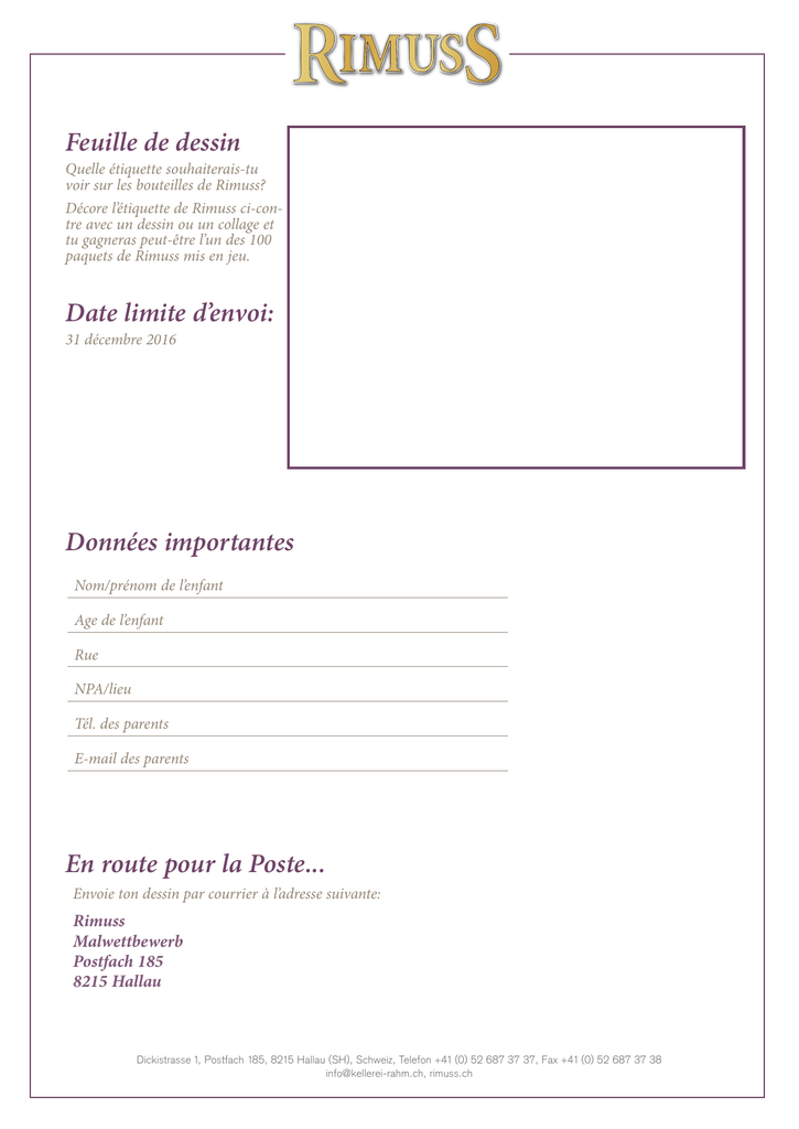 Feuille de dessin Quelle étiquette souhaiterais-tu voir sur les bouteilles de Rimuss? Décore l’étiquette de Rimuss ci-contre avec un dessin ou un collage et tu gagneras peut-être l’un des 100 paquets de Rimuss mis en jeu. Date limite d’envoi: 31 décembre 2016 Données importantes Nom/prénom de l’enfant Age de l’enfant Rue NPA/lieu Tél. des parents E-mail des parents En route pour la Poste... Envoie ton dessin par courrier à l’adresse suivante: Rimuss Malwettbewerb Postfach 185 8215 Hallau Dickistrasse 1, Postfach 185, 8215 Hallau (SH), Schweiz, Telefon +41 (0) 52 687 37 37, Fax +41 (0) 52 687 37 38 [email protected], rimuss.ch