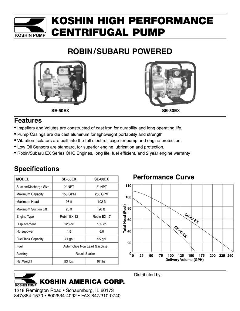 KOSHIN HIGH PERFORMANCE CENTRIFUGAL PUMP ROBIN / SUBARU POWERED SE-50EX SE-80EX Features • Impellers and Volutes are constructed of cast iron for durability and long operating life. • Pump Casings are die cast aluminum for lightweight portability and strength • Vibration Isolators are built into the full steel roll cage for pump and engine protection. • Low Oil Sensors are standard, for superior engine lubrication and protection. • Robin/Subaru EX Series OHC Engines, long life, fuel efficient, and 2 year engine warranty Specifications SE-50EX SE-80EX 2" NPT 3" NPT 158 GPM 256 GPM Maximum Head 98 ft 102 ft Maximum Suction Lift 26 ft 26 ft Engine Type Robin EX 13 Robin EX 17 Displacement 126 cc 169 cc 4.5 6.0 Fuel Tank Capacity .71 gal. .95 gal. Fuel Automotive Non Lead Gasoline Suction/Discharge Size Maximum Capacity Horsepower Performance Curve 110 100 Total Head (Feet) MODEL 80 SE -80 EX 60 SE -5 0 40 EX 20 Net Weight 0 Recoil Starter Starting 53 lbs. 0 25 50 75 67 lbs. Distributed by: KOSHIN AMERICA CORP. 1218 Remington Road • Schaumburg, IL 60173 847/884-1570 • 800/634-4092 • FAX 847/310-0740 100 125 150 175 Delivery Volume (GPH) 200 225 250