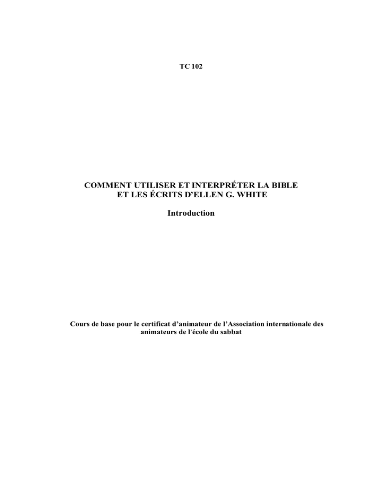 TC 102 COMMENT UTILISER ET INTERPRÉTER LA BIBLE ET LES ÉCRITS D’ELLEN G. WHITE Introduction Cours de base pour le certificat d’animateur de l’Association internationale des animateurs de l’école du sabbat La mission d’un animateur de l'Ecole du sabbat des adultes est fondée sur trois piliers: être, connaitre et faire ● « Être » signifie qu'un animateur de l’Ecole du sabbat des adultes doit avoir une expérience chrétienne solide et appréciable et être prêt à servir de guide spirituel pour sa classe. ● « Connaître » signifie qu'un animateur de l'école du sabbat doit savoir ce que dit la Bible et avoir une connaissance importante de l'histoire biblique, des doctrines et des enseignements, et savoir comment étudier et interpréter les Écritures. ● « Faire » signifie qu'un animateur de l'école du sabbat doit avoir une connaissance des méthodologies d’enseignement et être prêt à investir le temps et l'énergie nécessaires pour bien se préparer et mener une classe de l’école du sabbat. Ce cours, Comment utiliser et étudier la Bible et les écrits d'Ellen G. White, est une classe de «connaissance ». Il décrit les principes essentiels d'interprétation de la Bible et se concentre sur certaines questions d'interprétation qui sont particulièrement pertinentes pour les animateurs de l’école du sabbat des adventistes du septième jour et les membres de la classe. Il examine également les principes pour l'étude et l'interprétation des écrits d'Ellen G. White Le processus de l'interprétation biblique est appelée herméneutique. Ce terme vient du mot grec hermeneuō, qui signifie « traduire » ou « interpréter ». L’herméneutique biblique est l'étude des principes d'interprétation des livres de la Bible. La Bible est très précise lorsqu'elle affirme: « Et nous tenons pour d'autant plus certaine la parole prophétique à laquelle vous faites bien de prêter attention comme à une lampe qui brille dans un lieu obscur, jusqu'à ce que le jour commence à poindre, et que l'étoile du matin se lève dans vos cœurs. Avant tout, sachez qu'aucune prophétie de l'Écriture ne peut être l'objet d'interprétation particulière, car ce n'est nullement par une volonté humaine qu'une prophétie n’a jamais été présentée, mais c'est poussé par le Saint-Esprit que des hommes ont parlé de la part de Dieu. » (2 Pierre, 1:19-21, COL). Un animateur de l'école du sabbat doit connaître les bons principes d'interprétation biblique. Si ceuxci ne sont pas respectés, toutes sortes de choses étranges peuvent faire surface dans les classes d'école du sabbat. La même chose est vraie à propos de l'utilisation de traductions de la Bible. Les traducteurs suivent certains principes, en fonction de leur philosophie de la traduction. Le module 2 décrit ces principes et donne des lignes directrices sur l'utilisation des différentes traductions. Certains points de vue sur la façon d'interpréter la Bible et les écrits d'Ellen G. White sont souvent pris pour acquis, sans aucun examen délibéré, par les adventistes du septième jour. Certaines de ces perceptions sont exactes et d'autres non. L’animateur de l’école du sabbat et les membres de la classe doivent s'assurer que les principes qu'ils utilisent sont valides et exacts. La partie 2 étudie les principes d'interprétation des écrits d'Ellen G. White. Les adventistes du septième jour croient qu'Ellen White avait le don de prophétie et par conséquent les mêmes principes d'interprétation applicables aux Écritures s'appliquent aussi à ses écrits. Certains de ces mêmes points de vue sur l'interprétation biblique sont pris pour acquis pour l'interprétation des écrits d'Ellen White, et, quand ils sont erronés, ils causent les mêmes fausses interprétations. Comme dans l'étude de l'interprétation de la Bible elle-même, ces points de vue doivent être clarifiés afin de s'assurer qu'ils sont valides et exacts. Les livres cités comme ressources dans la bibliographie sont utiles pour une étude plus approfondie. Un mot de prudence cependant. Beaucoup de livres écrits sur ce sujet, par des auteurs évangéliques admettent deux points de vue qui ne sont pas acceptés par les adventistes du septième jour. La première, dite l’inspiration « plénière verbale » sera examinée en détail dans ce cours. La deuxième connue sous le nom de « dispensationalisme », souvent appelé l’« enlèvement secret » ou « futurisme ». L'acceptation de ces points de vue n'annule pas la valeur de l'information contenue dans ces livres sur l'herméneutique, mais vous devez les lire avec les yeux ouverts, en particulier dans les sections traitant de l'interprétation de la prophétie. Description de la classe Fiche de progrès de l’étudiant. À la fin de ce guide d'étude, vous trouverez une fiche de progrès de l’étudiant. C'est le dossier que vous remettrez à ceux qui tiennent les registres afin que vous puissiez recevoir votre certificat d’achèvement du cours. ● Si vous étudiez ce cours à partir d’une édition imprimée, vous devez remplir la carte de performance et la faire signer par la personne en charge des animateurs de l’école du Sabbat dans votre église / district ou par votre pasteur. ● Si vous étudiez avec un instructeur, demandez à cette personne de signer votre fiche de performance. Manuel. Il n'y a pas manuel pour cette classe. Le guide d'étude ainsi que les lectures complémentaires constituent votre manuel. Le Handbook for Bible Study, de Lee J. Gugliotto est un ouvrage de référence exceptionnel pour une étude plus approfondie; c’est un guide pour comprendre l'enseignement et la prédication de la Parole de Dieu. (Hagerstown, Md.: Review and Herald Publishing Association, 1995). Ce livre pénètre profondément les sujets étudiés dans cette classe et est un ajout précieux à la bibliothèque de l’animateur de l'école du sabbat. Com