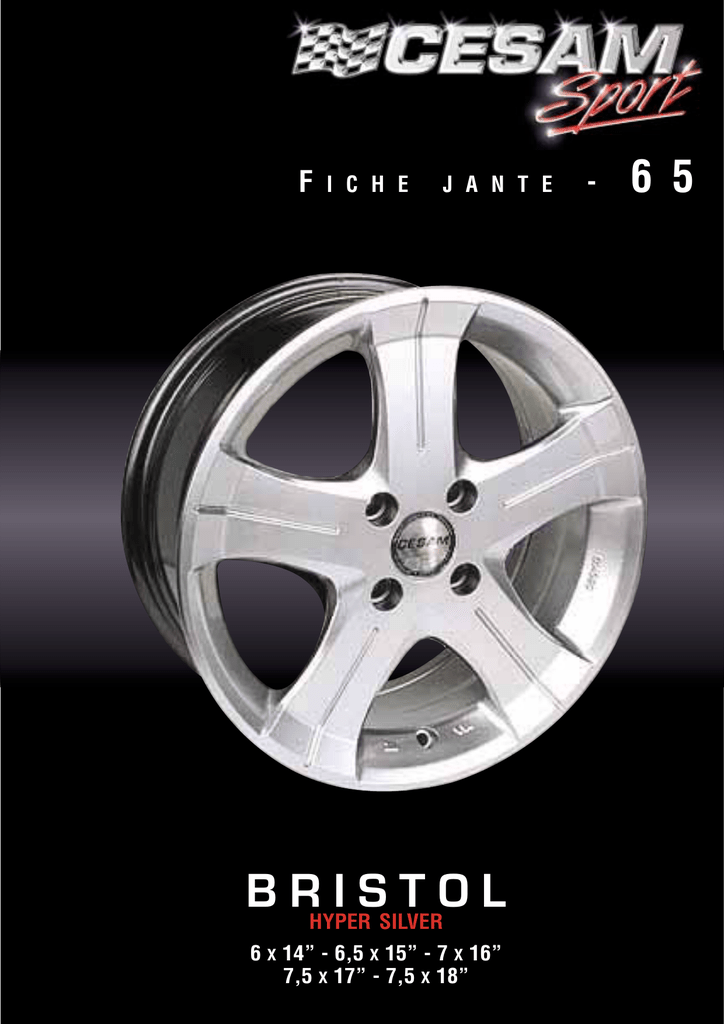 F I C H E J A N T E BRISTOL HYPER SILVER 6 X 14” - 6,5 X 15” - 7 X 16” 7,5 X 17” - 7,5 X 18” - 6 5 CESAM SPORT - BRISTOL HYPER SILVER Références Affectations Entraxes Déports Alésages 6,0 X 14" BRI43508HS LADA / ALFA / LANCIA / FIAT / SEAT IBIZA I BRI43505HS JAPONNAISE / CORENNE / OPEL / SEAT / VW / ROVER PEUGEOT 107 / CITROEN C1 / TOYOTA BRI41501HS PEUGEOT (SAUF 107/206) / CITROEN (SAUF C1,C2,C3) BRI43501HS FORD / MAZDA BRI42601HS PEUGEOT 206 / CITROEN C2,C3 4 X 098 4 X 100 35 35 73.0 73.0 4 X 108 4 X 108 4 X 108 15 35 26 65.0 73.0 65.0 4 X 098 4 X 100 35 35 73.0 73.0 4 X 108 4 X 108 4 X 108 4 X 114 15 26 35 35 65.0 65.0 73.0 73.0 5 X 100 5 X 108 35 35 73.0 73.0 5 X 110 5 X 112 5 X 114 38 35 35 73.0 73.0 73.0 4 X 098 35 73.0 4 X 100 35 73.0 4 X 108 4 X 108 4 X 108 5 X 100 5 X 112 15 26 35 35 35 65.0 65.0 73.0 73.0 73.0 4 X 098 4 X 100 35 35 73.0 73.0 4 X 108 4 X 108 4 X 108 5 X 100 15 26 35 35 65.0 65.0 73.0 73.0 5 X 108 5 X 112 42 35 73.0 73.0 5 X 112 42 73.0 5 X 120 35 72.6 4 X 100 4 X 108 4 X 108 5 X 100 5 X 112 35 15 26 35 35 73.0 65.0 65.0 73.0 73.0 Affectations données à titre indicatif, hors montage spécifique. Infomations non contractuelles, sauf erreur ou omission, sous réserve de modifications techniques. 6,5 X 15" BRI53508HS ALFA / LANCIA / LADA / FIAT BRI53505HS DAEWOO / DAIHATSU / HONDA / HYUNDAI / KIA / MAZDA / MINI / VW / NISSAN / OPEL PROTON / RENAULT ROVER / SEAT / SUZUKI / TOYOTA / CITROEN C1 / PEUGEOT 107 / MITSUBISHI BRI51501HS CITROEN (SAUF C1, C2 , C3, C4) / PEUGEOT (SAUF 107, 206, 307) BRI52601HS CITROEN C2, C3 , C4 / PEUGEOT 206, 307 BRI53501HS FORD / MAZDA / AUDI 80 BRI53514HS DAEWOO / HONDA / HYUNDAI / KIA / MITSUBISHI / NISSAN / ROVER SMART / SUZUKI / VOLVO BRI53509HS AUDI / CHRYSLER / PLYMOUTH / ROVER / SEAT / SKODA / TOYOTA / VW BRI53507HS ALFA 166 / FORD (FOCUS, MONDEO) / PEUGEOT 605 RENAULT / VOLVO / CITROEN (XM, C6) BRI53811HS OPEL / SAAB BRI53510HS AUDI / SKODA / VW / MERCEDES (SAUF CLASSE A) BRI53515HS DAEWOO / HONDA / HYUNDAI / MAZDA / MITSUBISHI NISSAN / PLYMOUTH / TOYOTA 7,0 X 16" BRI63508HS ALFA / FIAT / LANCIA / LADA / DAEWOO / DAIHATSU / HONDA / HYUNDAI RENAULT / KIA / MAZDA BRI63505HS MITSUBISHI / NISSAN / OPEL / PROTON / ROVER / SUZUKI / TOYOTA VW / PEUGEOT 107 / CITROEN C1 BRI61501HS CITROEN (SAUF C1, C2 , C3, C4) / PEUGEOT (SAUF 107, 206, 307) BRI62601HS CITROEN C2, C3 , C4 / PEUGEOT 206, 307 BRI63501HS FORD / MAZDA / AUDI 80 BRI63509HS ROVER / SEAT / SKODA / TOYOTA / VW BRI63510HS AUDI / MERCEDES / VW 7,5 X 17" BRI73508HS ALFA / LANCIA / FIAT / LADA BRI73505HS HONDA / HYUNDAI / KIA / MAZDA / NISSAN / OPEL / RENAULT / ROVER SUZUKI / TOYOTA / VW BRI71501HS CITROEN (SAUF C1, C2 , C3, C4) / PEUGEOT (SAUF 107, 206, 307) BRI72601HS CITROEN C2, C3, C4 / PEUGEOT 206, 307 BRI73501HS FORD / AUDI 80 BRI73509HS AUDI / CHEVROLET / CHRYSLER / PLYMOUTH / ROVER / SEAT SKODA / TOYOTA / VW BRI74207HS PEUGEOT 407 / RENAULT LAGUNA II / FORD MONDEO III BRI73510HS AUDI / FORD GALAXY / MERCEDES (SAUF CLASSE A/B) / SEAT SKODA / VW BRI74210HS AUDI / FORD GALAXY / MERCEDES (SAUF CLASSE A/B) / SEAT SKODA / VW BRI73512HS BMW SÉRIE 1 / SÉRIE 3 / Z3 / Z4 7,5 X 18" BRI83505HS BRI81501HS BRI82601HS BRI83509HS BRI83510HS MITSUBISHI / OPEL / RENAULT CITROEN ( SAUF C1, C2, C3, C4) / PEUGEOT (SAUF 107, 206, 307) CITROEN C2, C3, C4 / PEUGEOT 206, 307 AUDI / CHRYSLER / ROVER / SEAT / SKODA / TOYOTA / VW AUDI / FORD GALAXY / MERCEDES (SAUF CLASSE A/B) / SEAT SKODA / VW SAUF NOUVEAU CHASSIS