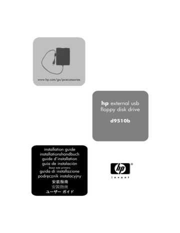 www.hp.com/go/pcaccessories hp external usb floppy disk drive d9510b installation guide installationshandbuch guide d’installation guía de instalación léase este primero guida di installazione podrcznik instalacyjny Notice The information contained in this document is subject to change without notice. Hewlett-Packard makes no warranty of any kind with regard to this material, including, but not limited to, the implied warranties of merchantability and fitness for a particular purpose. Hewlett-Packard shall not be liable for errors contained herein or for incidental or consequential damages in connection with the furnishing, performance, or use of this material. This document contains proprietary information that is protected by copyright. All rights are reserved. No part of this document may be photocopied, reproduced, or translated to another language without the prior written consent of Hewlett-Packard Company. Adobe®, Acrobat ® and Acrobat ® Reader™are trademarks or registered trademarks of Adobe Systems Incorporated. Microsoft®, MS-DOS®, Windows® and Windows NT® are U.S registered trademarks of Microsoft Corporation. Hinweis Änderungen vorbehalten. Hewlett-Packard übernimmt keinerlei Verantwortung für den Inhalt dieser Dokumentation und schließt insbesondere direkte und indirekte Verantwortung für die Marktgängigkeit oder die Eignung für bestimmte Einsatzzwecke aus. HewlettPackard haftet nicht für irgendwelche Fehler und mittelbare oder unmittelbare Schäden im Zusammenhang mit der Lieferung, Funktionsfähigkeit oder Verwendung dieses Geräts. Die in diesem Dokument beschriebenen Informationen sind geistiges Eigentum von Hewlett-Packard und urheberrechtlich geschützt. Alle Rechte vorbehalten. Vervielfältigung, Bearbeitung oder Übersetzung dieser Programme ist eben-falls nur nach vorheriger schriftlicher Genehmigung durch Hewlett-Packard gestattet. Adobe®, Acrobat ® und Acrobat ® Reader™ sind Warenzeichen oder eingetragene Warenzeichen von Adobe Systems Incorporated. Microsoft®, MS-DOS®, Windows® und Windows NT® sind in den USA eingetragene Warenzeichen der Microsoft Corporation. Avertissement Les informations contenues dans ce document peuvent être modifiées sans préavis. Hewlett-Packard ne donne aucune garantie de quelque sorte que ce soit concernant, sans que ce soit limitatif, les garanties implicites de qualité commerciale de ce matériel, ou la bonne adaptation de celui-ci à un usage particulier. Hewlett-Packard n’est pas responsable des erreurs pouvant apparaître dans ce manuel et n’est pas non plus responsable des dommages directs ou indirects résultant de l’équipement, des performances et de l’utilisation de ce matériel. Les informations contenues dans ce document sont la propriété de Hewlett-Packard et sont protégées par les lois relatives au copyright. Tous droits réservés. Toute photocopie, reproduction ou traduction dans toute autre langue sont interdites, sauf accord préalable et écrit de Hewlett-Packard. Adobe®, Acrobat ® et Acrobat ® Reader™ sont des marques commerciales ou des marques déposées de Adobe Systems Incorporated. Microsoft®, MS-DOS®, Windows® et Windows NT® sont des marques déposées aux Etats-Unis de Microsoft Corporation. Aviso La información contenida en este documento está sujeta a modificación sin previo aviso. Hewlett-Packard no ofrece garantía alguna con respecto a este material, incluyendo, aunque sin limitarse a, las garantías implícitas de comerciabilidad e idoneidad para fines específicos. Hewlett-Packard no se hace responsable de los errores que pueda contener este documento ni de los daños accidentales o circunstanciales derivados del suministro, interpretación o uso de este material. Este documento contiene información propiedad de HP que se encuentra protegida por copyright. Reservados todos los derechos. Se prohibe la copia, reproducción o traducción a otro idioma de cualquier parte de este documento sin el consentimiento previo y por escrito de Hewlett-Packard Company. Adobe®, Acrobat ® y Acrobat ® Reader™ son marcas comerciales o marcas comerciales registradas de Adobe Systems Incorporated. Microsoft®, MS-DOS®, Windows® y Windows NT® son marcas comerciales registradas en EE.UU. de Microsoft Corporation. Avviso Le informazioni contenute in questo documento sono soggette a modifica senza preavviso. Hewlett-Packard non rilascia garanzie di alcun tipo su questo materiale, incluse le garanzie implicite di commerciabilità e idoneità a scopi particolari. Hewlett-Packard declina ogni responsabilità di eventuali errori contenuti in questo documento e dei danni accidentali o conseguenti alla fornitura, alle prestazioni o all’uso di questo materiale. Hewlett-Packard non sarà inoltre ritenuta responsabile dell’affidabilità e dell’uso del proprio software su apparecchiature di altra marca. Questo documento contiene informazioni riservate protette da copyright. Tutti i diritti sono riservati. Nessuna parte di questo documento può essere fotocopiata, riprodotta o tradotta in altra lingua senza consenso scritto di Hewlett-Packard Company. Adobe®, Acrobat ® e Acrobat ® Reader™ sono marchi depositati di Adobe Systems Incorporated. Microsoft®, MS-DOS®, Windows® e Windows NT® sono marchi depositati negli Stati Uniti di Microsoft Corporation. Uwagi Firma Hewlett-Packard zastrzega sobie prawo wprowadzania bez uprzedzenia zmian w opisanym w tym dokumencie sprzęcie i oprogramowaniu. Hewlett-Packard nie udziela żadnych gwarancji odnośnie zawartej w tym materiale treści, w tym również, ale nie wyłącznie, gwarancji domniemanych co do jej wartości rynkowej lub przydatności do określonych celów. Firma Hewlett-Packard nie odpowiada za błędy, które mogą wystąpić w przedstawianym materiale, jak również za szkody pośrednio lub bezpośrednio związane z wykorzystaniem zawartych w nim informacji. Materiał zawarty w tym dokumencie jest chroni