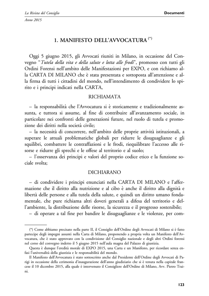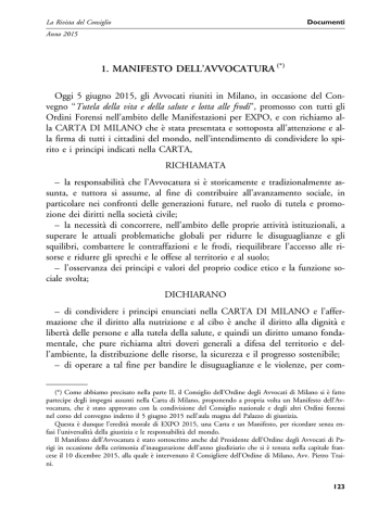 La Rivista del Consiglio Documenti Anno 2015 1. MANIFESTO DELL’AVVOCATURA (*) Oggi 5 giugno 2015, gli Avvocati riuniti in Milano, in occasione del Convegno ‘‘Tutela della vita e della salute e lotta alle frodi’’, promosso con tutti gli Ordini Forensi nell’ambito delle Manifestazioni per EXPO, e con richiamo alla CARTA DI MILANO che è stata presentata e sottoposta all’attenzione e alla firma di tutti i cittadini del mondo, nell’intendimento di condividere lo spirito e i principi indicati nella CARTA, RICHIAMATA – la responsabilità che l’Avvocatura si è storicamente e tradizionalmente assunta, e tuttora si assume, al fine di contribuire all’avanzamento sociale, in particolare nei confronti delle generazioni future, nel ruolo di tutela e promozione dei diritti nella società civile; – la necessità di concorrere, nell’ambito delle proprie attività istituzionali, a superare le attuali problematiche globali per ridurre le disuguaglianze e gli squilibri, combattere le contraffazioni e le frodi, riequilibrare l’accesso alle risorse e ridurre gli sprechi e le offese al territorio e al suolo; – l’osservanza dei principi e valori del proprio codice etico e la funzione sociale svolta; DICHIARANO – di condividere i principi enunciati nella CARTA DI MILANO e l’affermazione che il diritto alla nutrizione e al cibo è anche il diritto alla dignità e libertà delle persone e alla tutela della salute, e quindi un diritto umano fondamentale, che pure richiama altri doveri generali a difesa del territorio e dell’ambiente, la distribuzione delle risorse, la sicurezza e il progresso sostenibile; – di operare a tal fine per bandire le disuguaglianze e le violenze, per com(*) Come abbiamo precisato nella parte II, il Consiglio dell’Ordine degli Avvocati di Milano si è fatto partecipe degli impegni assunti nella Carta di Milano, proponendo a propria volta un Manifesto dell’Avvocatura, che è stato approvato con la condivisione del Consiglio nazionale e degli altri Ordini forensi nel corso del convegno indetto il 5 giugno 2015 nell’aula magna del Palazzo di giustizia. Questa è dunque l’eredità morale di EXPO 2015, una Carta e un Manifesto, per ricordare senza enfasi l’universalità della giustizia e le responsabilità del mondo. Il Manifesto dell’Avvocatura è stato sottoscritto anche dal Presidente dell’Ordine degli Avvocati di Parigi in occasione della cerimonia d’inaugurazione dell’anno giudiziario che si è tenuta nella capitale francese il 10 dicembre 2015, alla quale è intervenuto il Consigliere dell’Ordine di Milano, Avv. Pietro Traini. 123 La Rivista del Consiglio Documenti Anno 2015 battere le contraffazioni e le frodi, per riconoscere i valori e gli ideali, per rispettare la legge, l’etica e il diritto degli altri; E SI IMPEGNANO in ogni sede, nazionale, europea e internazionale, – a sostenere e dare effettivo riconoscimento a tali fondamentali diritti e a difenderli in ogni circostanza, rappresentando anche o contribuendo a rappresentare le istanze della società civile nei dibattiti e nei processi di formazione delle politiche pubbliche; – a raccogliere le istanze dei cittadini, interloquendo con le istituzioni per realizzare le legittime domande proposte e per contrastare le sempre ripetute violazioni, contraffazioni e frodi; – a incidere sulle cause che portano alla violazione dei diritti, promuovendo l’educazione alla legalità e coinvolgendo i saperi e i valori di tutte le professioni; – a tradurre in azioni concrete, in diritti spendibili, in affermazioni di responsabilità i principi fondamentali che toccano la vita, la salute e la dignità delle persone. Milano, 5 giugno 2015 Consiglio Nazionale Forense Il Presidente Avv. Andrea Mascherin Consiglio dell’Ordine Avvocati di Milano Il Presidente vv. Remo Danovi Di seguito proponiamo le versioni in francese e in inglese del Manifesto, sottoscritte dagli Ordini stranieri. Manifeste du Barreau Aujourd’hui 5 juin 2015, les avocats qui participent à la conférence de Milan intitulée ‘‘Protection de la vie et de la santé et lutte aux fraudes’’, parrainée par toutes les associations d’avocats qui ont pris part aux événements d’Expo, faisant aussi appel à la Charte de Milan qui a été présentée et soumise à l’attention et à la signature de tous les citoyens du monde, dans l’intention de partager l’esprit et les principes énoncés dans la Charte 124 La Rivista del Consiglio Documenti Anno 2015 EN RAISON DE – la responsabilité que le Barreau a historiquement et traditionnellement assumé et prends en charge encore aujourd’hui, afin de contribuer à l’avancement de la vie sociale, en particulier envers les générations futures, avec le but de protéger et promouvoir les droits de la société civile; – la nécessité de contribuer, au sein de leurs activités institutionnelles, afin de surmonter les défis mondiaux actuels visant à réduire les inégalités et les déséquilibres, combattre la contrefaçon et la fraude, équilibrer l’accès aux ressources et réduire les déchets, ainsi que les infractions contre le territoire et le sol; – la considération des principes et des valeurs du code de l’éthique et de la fonction sociale; DECLARENT – de partager les principes de la CHARTE DE MILAN ainsi que la conviction que le droit à l’alimentation et à la nutrition est aussi un droit à la dignité et à la liberté des individus et à la protection de la santé, et donc droit humain fondamental, qui implique également d’autres fonctions générales pour protéger le territoire et l’environnement, la répartition des ressources, la sécurité et le progrès durable; – de s’engager afin d’interdire l’inégalité et la violence, combattre la contrefaçon et la fraude, pour reconnaı̂tre les valeurs et les idéaux, faire appliquer la loi, l’éthique et les droits d’autrui; ET S’ENGAGENT a tout niveau natio