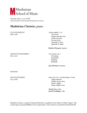 Thursday, May 14, 2015 | 8 PM THE SOLOMON GADLES MIKOWSKI RECITAL HALL Madeleine Christie, piano CLAUDE DEBUSSY (1862–1918) Ariettes oubliées, L. 60 C’est l’extase Il pleure dans mon coeur L’ombre des arbres Chevaux de bois Aquarelles I. Green Aquarelles II. Spleen Matilyn Obregón, Soprano ARNOLD SCHOENBERG (1874–1951) Vier Lieder, Op. 2 Erwartung Jesus Bettelt Erhebung Waldsonne Jana McIntyre, Soprano Intermission FRANZ SCHUBERT (1797–1828) Piano Trio No. 1 in B-flat Major, D. 898 Allegro moderato Andante un poco mosso Scherzo–Allegro Rondo–Allegro vivace Kyulee Seo, violin, Jacob Nordlinger, cello Madeleine Christie, a student of Kenneth Merrill is a candidate for the Master of Music Degree. This recital is given in partial fulfillment of its requirements. This recital was coached by Kenneth Merrill. C'est l'extase langoureuse, C'est la fatigue amoureuse, C'est tous les frissons des bois Parmi l'étreinte des brises, C'est vers les ramures grises Le choeur des petites voix. O le frêle et frais murmure! Cela gazouille et susurre, Cela ressemble au cri doux Que l'herbe agitée expire... Tu dirais, sous l'eau qui vire, Le roulis sourd des cailloux. Cette âme qui se lamente En cette plainte dormante C'est la nôtre, n'est-ce pas? La mienne, dis, et la tienne, Dont s'exhale l'humble antienne Par ce tiède soir, tout bas? It is the languorous ecstasy, It is the fatigue after love, It is all the rustling of the wood, In the embrace of breezes; It is near the gray branches: A chorus of tiny voices. Oh, what a frail and fresh murmur! It babbles and whispers, It resembles the soft noise That waving grass exhales. You might say it were, under the bending stream, The muffled sound of rolling pebbles. This soul, which laments And this dormant moan, It is ours, is it not? Is it not mine? -- tell me -- and yours, Whose humble anthem we breathe On this mild evening, so very quietly? Il pleure dans mon cœur Comme il pleut sur la ville; Quelle est cette langueur Qui pénètre mon cœur ? Ô bruit doux de la pluie, Par terre et sur les toits! Pour un cœur qui s'ennuie, Ô le bruit de la pluie! Il pleure sans raison Dans ce cœur qui s'écœure. Quoi! nulle trahison ? ... Ce deuil est sans raison. C'est bien la pire peine, De ne savoir pourquoi Sans amour et sans haine Mon cœur a tant de peine! There is weeping in my heart like the rain falling on the town. What is this languor that pervades my heart? Oh the patter of the rain on the ground and the roofs! For a heart growing weary oh the sound of the rain! There is weeping without cause in this disheartened heart. What! No betrayal? There's no reason for this grief. Truly the worst pain is not knowing why, without love or hatred, my heart feels so much pain. L'ombre des arbres dans la rivière embrumée Meurt comme de la fumée, Tandis qu'en l'air, parmi les ramures réelles, Se plaignent les tourterelles. Combien, ô voyageur, ce paysage blême Te mira blême toi-même, Et que tristes pleuraient dans les hautes feuillées, Tes espérances noyées. The shadow of the trees in the misty river fades and dies like smoke; while above, among the real branches, the doves are lamenting. Oh traveler, how well this pale landscape mirrored your pallid self! And how sadly, in the high foliage, your hopes were weeping, your hopes that are drowned. Tournez, tournez, bons chevaux de bois, Tournez cent tours, tournez mille tours, Tournez souvent et tournez toujours, Tournez, tournez au son des hautbois. L'enfant tout rouge et la mère blanche, Le gars en noir et la fille en rose, L'une à la chose et l'autre à la pose, Chacun se paie un sou de dimanche. Tournez, tournez, chevaux de leur cœur, Tandis qu'autour de tous vos tournois Clignote l'œil du filou sournois, Tournez au son du piston vainqueur ! C'est étonnant comme ça vous soûle D'aller ainsi dans ce cirque bête Bien dans le ventre et mal dans la tête, Du mal en masse et du bien en foule. Tournez, dadas, sans qu'il soit besoin D'user jamais de nuls éperons Pour commander à vos galops ronds Tournez, tournez, sans espoir de foin. Et dépêchez, chevaux de leur âme Déjà voici que sonne à la soupe La nuit qui tombe et chasse la troupe De gais buveurs que leur soif affame. Tournez, tournez ! Le ciel en velours D'astres en or se vêt lentement. L'église tinte un glas tristement. Tournez au son joyeux des tambours ! Turn, turn, good horses of wood, turn a hundred turns, turn a thousand turns, turn often and turn always, turn, turn to the sound of the oboes. The red-faced child and pale mother, the boy in black and the girl in pink, the one pursuing and the other posing, each getting a penny's worth of Sunday fun. Turn, turn, horses of their hearts, while all around your turning squints the sly pickpocket's eye – turn to the sound of the victorious cornet. It is astonishing how it intoxicates you to go around this way in a stupid circle, nothing in your tummy and an ache in your head, very sick and having lots of fun. Turn, wooden horses, with no need ever to use spurs to command you to gallop around, turn, turn, with no hope for hay. And hurry, horses of their souls— hear the supper bell already, the night that is falling and chasing the troop of merry drinkers, famished by their thirst. Turn, turn! The velvet sky is slowly clothed with golden stars. The church bell tolls sadly. Turn, to the happy sound of drums. Green Voici des fruits, des fleurs, des feuilles et des branches Et puis voici mon cœur qui ne bat que pour vous. Ne le déchirez pas avec vos deux mains blanches Et qu'à vos yeux si beaux l'humble présent soit doux. J'arrive tout couvert encore de rosée Que le vent du matin vient glacer à mon front. Souffrez que ma fatigue, à vos pieds reposée, Rêve des chers instants qui la délasseront. Sur votre jeune sein laissez rouler ma tête Toute sonore encore de vos derniers baisers ; Laissez-la s'apaiser de la bonne tempête, Et que je dorme un peu puisque vous reposez.