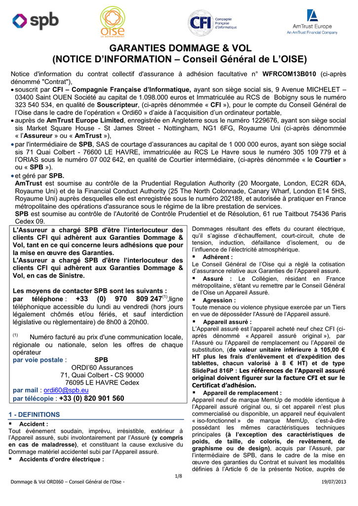 GARANTIES DOMMAGE & VOL (NOTICE D’INFORMATION – Conseil Général de L’OISE) Notice d'information du contrat collectif d'assurance à adhésion facultative n° WFRCOM13B010 (ci-après dénommé "Contrat"), souscrit par CFI – Compagnie Française d’Informatique, ayant son siège social sis, 9 Avenue MICHELET – 03400 Saint OUEN Société au capital de 1.098.000 euros et Immatriculée au RCS de Bobigny sous le numéro 323 540 534, en qualité de Souscripteur, (ci-après dénommée « CFI »), pour le compte du Conseil Général de l’Oise dans le cadre de l’opération « Ordi60 » d’aide à l’acquisition d’un ordinateur portable, auprès de AmTrust Europe Limited, enregistrée en Angleterre sous le numéro 1229676, ayant son siège social sis Market Square House - St James Street - Nottingham, NG1 6FG, Royaume Uni (ci-après dénommée « l’Assureur » ou « AmTrust »), par l'intermédiaire de SPB, SAS de courtage d’assurances au capital de 1 000 000 euros, ayant son siège social sis 71 Quai Colbert - 76600 LE HAVRE, immatriculée au RCS Le Havre sous le numéro 305 109 779 et à l’ORIAS sous le numéro 07 002 642, en qualité de Courtier intermédiaire, (ci-après dénommée « le Courtier » ou « SPB »). et géré par SPB. AmTrust est soumise au contrôle de la Prudential Regulation Authority (20 Moorgate, London, EC2R 6DA, Royaume Uni) et de la Financial Conduct Authority (25 The North Colonnade, Canary Wharf, London E14 5HS, Royaume Uni) auprès desquelles elle est enregistrée sous le numéro 202189, et autorisée à pratiquer en France métropolitaine des opérations d'assurance sous le régime de la libre prestation de services. SPB est soumise au contrôle de l'Autorité de Contrôle Prudentiel et de Résolution, 61 rue Taitbout 75436 Paris Cedex 09. L'Assureur a chargé SPB d'être l’interlocuteur des Dommages résultant des effets du courant électrique, clients CFI qui adhèrent aux Garanties Dommage & qu’il s’agisse d’échauffement, court-circuit, chute de Vol, tant en ce qui concerne leurs adhésions que pour tension, induction, défaillance d’isolement, ou de l’influence de l’électricité atmosphérique. la mise en œuvre des Garanties. Adhérent : L'Assureur a chargé SPB d'être l’interlocuteur des Le Conseil Général de l’Oise qui a réglé la cotisation clients CFI qui adhèrent aux Garanties Dommage & d’assurance relative aux Garanties de l’Appareil assuré. Vol, en cas de Sinistre. Assuré : Le Collégien, résidant en France Les moyens de contacter SPB sont les suivants : par téléphone : +33 (0) 970 809 247(1),ligne téléphonique accessible du lundi au vendredi (hors jours légalement chômés et/ou fériés, et sauf interdiction législative ou règlementaire) de 8h00 à 20h00. (1) Numéro facturé au prix d'une communication locale, régionale ou nationale, selon les offres de chaque opérateur par voie postale : SPB ORDI’60 Assurances 71, Quai Colbert - CS 90000 76095 LE HAVRE Cedex par mail : [email protected] par télécopie : +33 (0) 820 901 560 1 - DEFINITIONS Accident : Tout événement soudain, imprévu, irrésistible, extérieur à l’Appareil assuré, subi involontairement par l’Assuré (y compris en cas de maladresse), et constituant la cause exclusive du Dommage matériel accidentel subi par l’Appareil assuré. Accidents d’ordre électrique : métropolitaine, s'étant vu remettre par le Conseil Général de l’Oise un Appareil Assuré. Agression : Toute menace ou violence physique exercée par un Tiers en vue de déposséder l'Assuré de l’Appareil assuré. Appareil assuré : L’Appareil assuré est l’appareil acheté neuf chez CFI (ciaprès dénommé « Appareil assuré original »), par l’Assuré ou l’Appareil de remplacement ou l’Appareil de substitution, (de valeur unitaire inférieure à 105,00 € HT plus les frais d’enlèvement et d’expédition des tablettes, chacun valorisé à 8 € HT) et de type SlidePad 816P : Les références de l’Appareil assuré original doivent figurer sur la facture CFI et sur le Certificat d’adhésion. Appareil de remplacement : Appareil neuf de marque MemUp de modèle identique à l’Appareil assuré original ou, si cet appareil n’est plus commercialisé ou disponible, un appareil neuf équivalent « iso-fonctionnel » de marque MemUp, c’est-à-dire possédant les mêmes caractéristiques techniques principales (à l’exception des caractéristiques de poids, de taille, de coloris, de revêtement, de graphisme ou de design), acquis par l’Assuré, par l’intermédiaire de SPB, dans le cadre de la mise en œuvre des garanties du Contrat et suivant les modalités définies à l’Article 6 de la présente Notice, auprès de 1/8 Dommage & Vol ORDI60 – Conseil Général de l’Oise - 19/07/2013 CFI, dans les mêmes conditions d’acquisition que l’Appareil assuré d’origine. La valeur de l’Appareil de remplacement ne pourra cependant pas dépasser la Valeur de remplacement (voir définition). Appareil de substitution : Appareil fourni par CFI suite à la mise en jeu de la garantie contractuelle MemUp ou des garanties légales en vigueur. Certificat d’adhésion : Document remis à l’Adhérent, par SPB, dans le cas d’une adhésion au Contrat chez CFI. Certificat d'assurance : Document émis par le conseil général de l’Oise et adressé à l'Assuré ou par ses Parents ou Tuteurs si l'Assuré est mineur, consécutivement à la remise du Pack Ordi’60, sur lequel figure : - Le nom et les coordonnées de l'Assuré, - Le n° de série de l'Appareil assuré, - La date de retrait de l'Appareil assuré. Les Certificats d'Assurance feront l'objet d'un envoi hebdomadaire d'un fichier récapitulatif du conseil général de l’Oise à SPB afin de pouvoir valider l'éligibilité des Assurés lors d'un appel à la hot-line de SPB. Déchéance : Sanction consistant à priver l’Assuré, dans la limite de l’article L.113-2 du Co