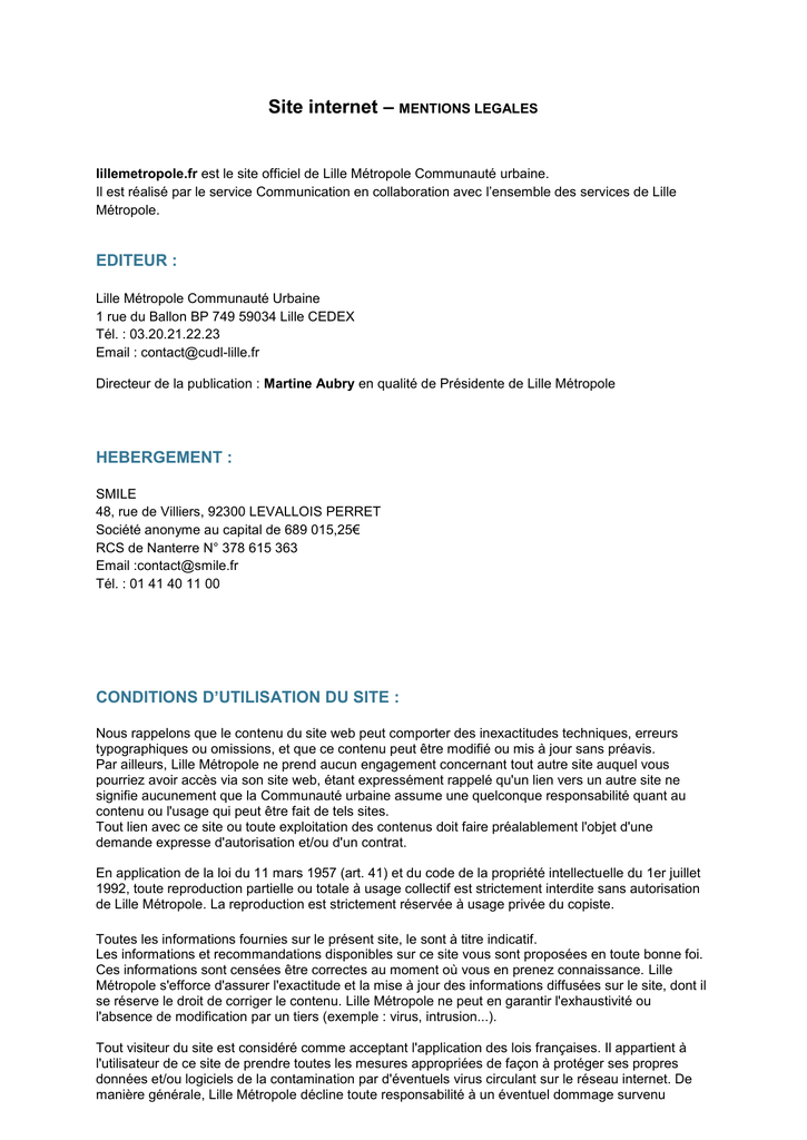 Site internet – MENTIONS LEGALES lillemetropole.fr est le site officiel de Lille Métropole Communauté urbaine. Il est réalisé par le service Communication en collaboration avec l’ensemble des services de Lille Métropole. EDITEUR : Lille Métropole Communauté Urbaine 1 rue du Ballon BP 749 59034 Lille CEDEX Tél. : 03.20.21.22.23 Email : [email protected] Directeur de la publication : Martine Aubry en qualité de Présidente de Lille Métropole HEBERGEMENT : SMILE 48, rue de Villiers, 92300 LEVALLOIS PERRET Société anonyme au capital de 689 015,25€ RCS de Nanterre N° 378 615 363 Email :[email protected] Tél. : 01 41 40 11 00 CONDITIONS D’UTILISATION DU SITE : Nous rappelons que le contenu du site web peut comporter des inexactitudes techniques, erreurs typographiques ou omissions, et que ce contenu peut être modifié ou mis à jour sans préavis. Par ailleurs, Lille Métropole ne prend aucun engagement concernant tout autre site auquel vous pourriez avoir accès via son site web, étant expressément rappelé qu'un lien vers un autre site ne signifie aucunement que la Communauté urbaine assume une quelconque responsabilité quant au contenu ou l'usage qui peut être fait de tels sites. Tout lien avec ce site ou toute exploitation des contenus doit faire préalablement l'objet d'une demande expresse d'autorisation et/ou d'un contrat. En application de la loi du 11 mars 1957 (art. 41) et du code de la propriété intellectuelle du 1er juillet 1992, toute reproduction partielle ou totale à usage collectif est strictement interdite sans autorisation de Lille Métropole. La reproduction est strictement réservée à usage privée du copiste. Toutes les informations fournies sur le présent site, le sont à titre indicatif. Les informations et recommandations disponibles sur ce site vous sont proposées en toute bonne foi. Ces informations sont censées être correctes au moment où vous en prenez connaissance. Lille Métropole s'efforce d'assurer l'exactitude et la mise à jour des informations diffusées sur le site, dont il se réserve le droit de corriger le contenu. Lille Métropole ne peut en garantir l'exhaustivité ou l'absence de modification par un tiers (exemple : virus, intrusion...). Tout visiteur du site est considéré comme acceptant l'application des lois françaises. Il appartient à l'utilisateur de ce site de prendre toutes les mesures appropriées de façon à protéger ses propres données et/ou logiciels de la contamination par d'éventuels virus circulant sur le réseau internet. De manière générale, Lille Métropole décline toute responsabilité à un éventuel dommage survenu pendant la consultation du présent site. Lille Métropole se réserve le droit de modifier ou de corriger, à tout moment et ce sans préavis, le contenu de son site internet et ne peut être tenue pour responsable des conséquences éventuelles de ces modifications. L’ensemble des messages qui nous sont adressés via le formulaire de contact sont gérés et diffusés par le service Courrier de Lille Métropole. Il se charge de les transmettre au service concerné afin qu’une réponse soit adressée dans les meilleurs délais. Tous les éléments du site, notamment images, logos, graphisme, mise en forme du contenu, etc. font également l’objet d’un droit de propriété intellectuelle de Lille Métropole au titre du droit d’auteur sur ces éléments ou sur le site en tant qu’œuvre d’auteur ou en tant que base de données. Les usages autorisés des textes présentés sur le site sont les suivants : reproduction strictement réservée à l’usage privé du copiste et non destinée à une utilisation collective ; reproduction, diffusion ou représentation à des fins d’information professionnelle sur support non numérique, à la condition expresse de ne pas modifier les œuvres et de mentionner la source et les auteurs ; les courtes citations des textes présents sur le site sont licites, dans la mesure om ils s’intègrent dans une œuvre nouvelle, à la condition expresse de ne pas modifier les œuvres citées, de les délimiter formellement (guillemets de citation ou typographie distinctive) et de mentionner la source et les auteurs. Toute autre ex CREDITS PHOTOS : Responsable unité audivisuelle : Erika Lainé Photographes : Vincent Lecigne, Pascaline Chombart, Max Lerouge DROITS D'AUTEUR - Copyright : Tous droits réservés à Lille Métropole L'ensemble des éléments le composant tels que, à titre indicatif, la dénomination, le logo, les dessins, photos, animations, les documents téléchargeables et tout autre document sont la propriété exclusive de Lille Métropole. Le site lillemetropole.fr est une œuvre de l'esprit protégé par la législation en vigueur et à l'étranger par les conventions internationales en vigueur sur le droit d'auteur. A cet effet, toute représentation, reproduction, modification, utilisation commerciale ainsi que tout transfert vers un autre site et/ou quel que soit le support sont interdits sauf autorisation expresse et écrite du responsable de la publication. Seule une utilisation à des fins strictement personnelles est autorisée. La violation de l'un des droits d'auteur de l'œuvre est un délit de contrefaçon. DONNEES PERSONNELLES : Le site www.lillemetropole.fr est déclaré à la Commission Nationale Informatique et Libertés (CNIL) sous le N° XXX. Les données vous concernant (newsletter ou formulaire de contact) sont strictement confidentielles et ne peuvent être communiquées à un tiers. En application de la loi nº 78-17 du 6 janvier 1978 relative à l'informatique, aux fichiers et aux libertés, vous disposez des droits d'opposition (art. 26 de la loi), d'accès (art. 34 à 38 de la loi) et de rectification (art. 36 de la loi) des données vous concernant. Ainsi, vous pouvez exiger une mise à jour ou que nous supprimions les informations vous concernant qui sont inexactes, incomplètes, équivoqu