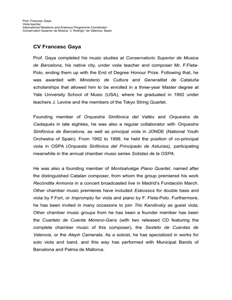 Prof. Francesc Gaya Viola teacher International Relations and Erasmus Programme Coordinator Conservatori Superior de Música “J. Rodrigo” de Valencia, Spain CV Francesc Gaya Prof. Gaya completed his music studies at Conservatorio Superior de Musica de Barcelona, his native city, under viola teacher and composer Mr. F.FletaPolo, ending them up with the End of Degree Honour Prize. Following that, he was awarded with Ministerio de Cultura and Generalitat de Cataluña scholarships that allowed him to be enrolled in a three-year Master degree at Yale University School of Music (USA), where he graduated in 1992 under teachers J. Levine and the members of the Tokyo String Quartet. Founding member of Orquestra Simfònica del Vallès and Orquestra de Cadaqués in late eighties, he was also a regular collaborator with Orquestra Simfònica de Barcelona, as well as principal viola in JONDE (National Youth Orchestra of Spain). From 1992 to 1999, he held the position of co-principal viola in OSPA (Orquesta Sinfónica del Principado de Asturias), participating meanwhile in the annual chamber music series Solistas de la OSPA. He was also a founding member of Montsalvatge Piano Quartet, named after the distinguished Catalan composer, from whom the group premiered his work Recóndita Armonía in a concert broadcasted live in Madrid’s Fundación March. Other chamber music premieres have included Esbossos for double bass and viola by F.Fort, or Impromptu for viola and piano by F. Fleta-Polo. Furthermore, he has been invited in many occasions to join Trio Kandinsky as guest viola. Other chamber music groups from he has been a founder member has been the Cuarteto de Cuerda Moreno-Gans (with two released CD featuring the complete chamber music of this composer), the Sexteto de Cuerdas de Valencia, or the Aleph Camerata. As a soloist, he has specialized in works for solo viola and band, and this way has performed with Municipal Bands of Barcelona and Palma de Mallorca. He resides currently in Valencia where, from 1999, is teaching viola and orchestral repertoire in Conservatori Superior de Música “Joaquín Rodrigo”. He has been since invited to give masterclasses at many conservatories and youth orchestras throughout Spain, and also in Italy through the Erasmus Programme. He held also the position of associate viola teacher at Conservatori Superior de les Illes Balears between 2006 y 2013. He appears regularly with pianist Isabel Félix, having offered different recitals. Always concerned about pedagogical improvement, he has attended Suzuki and other string teaching approaches. He has also followed Improvisation courses with professor Emilio Molina and is successfully applying its principles in his teaching; he has synthesized them in a lecture (“Harmony in the string instruments’ class”) that he has been invited to talk to several times. Likewise, he has been coordinator of a seminar featuring “Unificating criteria towards curricula in the viola area”. He is presently finishing Third Cycle studies at Universitat Politècnica de València. Other interests in the musical world have led prof. Gaya to other projects. Therefore, he has lately become International Relations and Erasmus Programme Coordinator of his conservatory. He has been in charge of more than 100 mobilities and also has signed a similar number of new InterInstitutional Agreements with partner institutions Also, from 2013 he participates in a NGO in El Salvador, in a project called “Violence prevention through musical and cultural activities”, sponsored by the World Bank, with Fundación Edytra, Ministerio de Educación de El Salvador and Universidad Don Bosco as partners. Knowledge of languages: - Catalan and Spanish: mother tongue - English: certificate C2 - French: no official certificate, knowledge equivalent to B1 CV Francesc Gaya Prof. Gaya termine ses études musicales au Conservatorio Superior de Música de Barcelona, sa ville natale, dans la classe de F. Fleta-Polo, altiste et compositeur, où il obtient un Prix d´Honneur, degré supérieur. Grâce à des bourses d’ études du "Ministerio de Cultura" et de la "Generalitat de Cataluña", il se perfectionne ensuite avec J. Levine (altiste) et les membres du Quatuor à Cordes de Tokio à la "Yale University School of Music" (États-Unis) où il fait un "Master of music" de trois ans. Il obtient son diplôme en 1992. À la fin des années 80 il fonde l’ Orquestra Simfònica del Vallès et l’ Orquestra de Cadaqués. Paralèllement il joue régulièrement avec l’ Orquestra Simfònica de Barcelona, et occupe le poste d' alto solo de la JONDE (Orchestre National des Jeunes d'Espagne). De 1992 à 1999, il est altiste co-soliste de la OSPA (Orquesta Sinfónica del Principado de Asturias), ce qui lui permet de participer aux saisons annuelles de musique de chambre des Solistas de la OSPA. Il est aussi membre fondateur du Montsalvatge Piano Quartet, qui emprunte le nom du célèbre compositeur catalan, et feront la première d'une de ses œuvres, "Recóndita Armonía", dans un concert émis en direct à la Fundación March de Madrid. Francesc Gaya participe également à la première de "Esbossos" pour contrebasse et viola de F.Fort, et "Impromptu" pour viola et piano de F. Fleta-Polo. Par ailleurs, il est souvent invité à jouer avec le Trio Kandinsky. ll est également membre fondateur d'autres groupes comme le Cuarteto de Cuerda Moreno-Gans, (duquel il a enregistré l’oeuvre complète de musique de chambre), le Sexteto de Cuerdas de Valencia, et Aleph Camerata. En tant que soliste, il s'est spécialisé dans le répertoire pour alto et bande, et s'est produit respectivement avec les Bandas Municipales de Barcelona et Palma de Mallorca. Il vit actuellement à Valence où il enseigne alto et le répertoire d’ orchestre au Conservatori Superior de Música “Joaquín Rodrigo” depuis 1999. Il a été invité à donner des master classes au sein de nombreux con