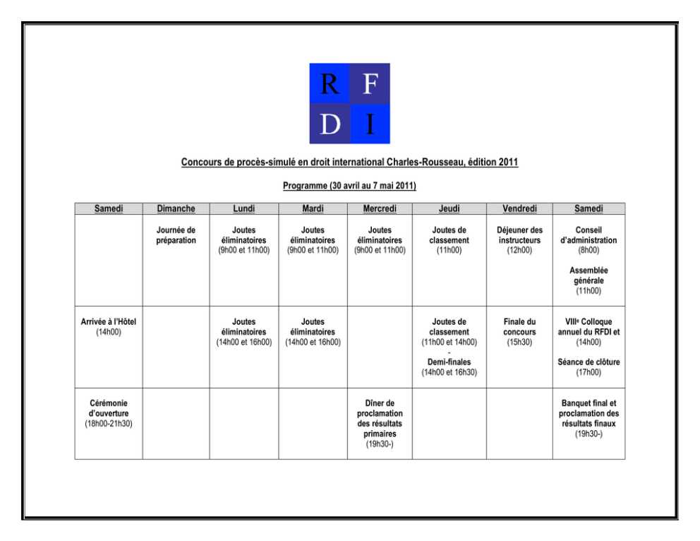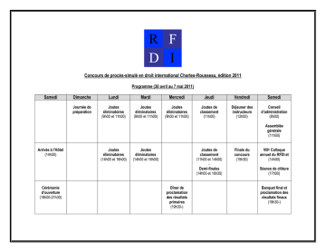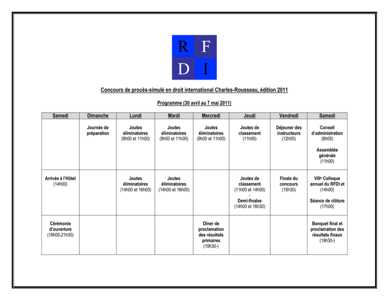 Concours de procès-simulé en droit international Charles-Rousseau, édition 2011 Programme (30 avril au 7 mai 2011) Samedi Dimanche Lundi Mardi Mercredi Jeudi Vendredi Samedi Journée de préparation Joutes éliminatoires (9h00 et 11h00) Joutes éliminatoires (9h00 et 11h00) Joutes éliminatoires (9h00 et 11h00) Joutes de classement (11h00) Déjeuner des instructeurs (12h00) Conseil d’administration (8h00) Assemblée générale (11h00) Arrivée à l’Hôtel (14h00) Cérémonie d’ouverture (18h00-21h30) Joutes éliminatoires (14h00 et 16h00) Joutes éliminatoires (14h00 et 16h00) Joutes de classement (11h00 et 14h00) Demi-finales (14h00 et 16h30) Dîner de proclamation des résultats primaires (19h30-) Finale du concours (15h30) VIIIe Colloque annuel du RFDI et (14h00) Séance de clôture (17h00) Banquet final et proclamation des résultats finaux (19h30-) Soutiens permanents et annuels du Concours Charles-Rousseau 2 Programme détaillé Samedi (30 avril) – Arrivée à l’Hôtel et Soirée d’accueil des participants ARRIVÉE À L’HÔTEL (À PARTIR DE 14H00) Hôtel Rotana-Hazmiyeh Boulevard Président Emile Lahoud Liban Téléphone : +961 (0) 5 458000 Télécopieur : +961 (0) 5 958000 Site Internet : http://www.rotana.com/rotanahotelandresorts/lebanon/beirut/hazmiehrotana Transport Pour la cérémonie d’ouverture de 18h00, l’Université Antonine met à la disposition de tous les participants des autobus, minibus et pullman. Départ de l’hôtel à 17h15. Au demeurant, les équipes peuvent assumer de manière autonome leur déplacement par taxis ou minibus. Les universités La Sagesse (ULS) et Antonine (UPA) étant situées à 15-20 minutes de l’hôtel Rotana-Hazmiyeh. Pour une estimation des prix, voir l’Annexe 3 du programme. 3 CÉRÉMONIE D’OUVERTURE (18H00) Cocktail dînatoire offert par le Conseil municipal de Hadath-Mont Liban Université Antonine Amphithéâtre de la Faculté d’Ingénieurs Campus UPA Hadath-Baabda Site Internet : http://www.upa.edu.lb/decouvrir-l-upa/accueil.html Allocutions d’ouverture - Pr. Fady Fadel, Président du comité local d’organisation Pr. François Dubuisson, Président du Réseau francophone de droit international Pr. Antoine Rajeh, Recteur de l’Université Antonine Pr. Bernard Cerquiglini, Recteur de l’Agence universitaire de la francophonie Dimanche (1 mai) – Journée de préparation RESSOURCES DISPONIBLES POUR LES PARTICIPANTS (1ER AU 7 MAI) Hôtel Afin de préparer adéquatement leurs joutes, tous les participants ont accès à Internet depuis leur chambre (frais en sus). Toujours au frais des participants, l’hôtel dispose par ailleurs de toutes les capacités d’impression et de photocopie nécessaires pour répondre à vos besoins. La tarification de tous les services offerts est indiquée à l’Annexe 4 du programme. 4 Comité d’organisation local et aide logistique En cas d’urgence, ou pour toute autre demande d’aide, les participants peuvent contacter les personnes suivantes : - Fady Fadel, Président du Comité local d’organisation : +961 (0) 3 799212 Bernadette Abi Saleh, Vice-Recteur de l’Université La Sagesse : +961 (0) 3 243192 Fouad Abdallah, Assistant du professeur Fady Fadel : +961 (0) 3 038431 Accès à la bibliothèque de droit (à partir du 2 mai malgré le congé pascal) Université La Sagesse Furn el-Chebbak Site internet : http://www.uls.edu.lb Pour le comptoir des prêts et l’achat des billets pour les photocopies : Bloc A, 2e étage (suivre les indications sur place) Pour les salles de consultation : Bloc B, 3e étage (suivre les indications sur place) NB : Pour plus de détails concernant les règles d’utilisation de la bibliothèque, notamment le règlement intérieur de la bibliothèque de droit Issam Fares ainsi que le règlement du service Internet, voir le site internet de la bibliothèque. Site Internet : http://www.uls.edu.lb/subtemplate.asp?Section=Library&Menu=Library Veuillez prendre note que la bibliothèque sera ouverte de 9h00 à 12h00 le 2 mai et toute la journée des 3,4, 5 et 6 mai. Noter également que le service internet y est mis gratuitement à votre intention. Transport Service de navette depuis l’hôtel (2 au 7 mai). Voir les Annexes 1 et 2 pour les horaires détaillés des autobus, minibus et pullman. 5 Lundi (2 mai) – Joutes éliminatoires (9h00 à 18h00) Université La Sagesse Faculté de droit Furn el-Chebbak Salles d’audience et de délibération : Bloc A, salles L502, L503, L504, L505 et L506. Mardi (3 mai) – Joutes éliminatoires (9h00 à 18h00) Université La Sagesse Faculté de droit Furn-El-Chebbak Salles d’audience et de délibération : Bloc A, salles L502, L503, L504, L505 et L506. Mercredi (4 mai) – Joutes éliminatoires (9h00 à 13h00) et Dîner de proclamation des résultats primaires (19h30) Université La Sagesse Faculté de droit Furn-El-Chebbak Salles d’audience et de délibération : Bloc C, salles L502, L503, L504, L505 et L506. 6 DÎNER DE PROCLAMATION DES RÉSULTATS PRIMAIRES (19H30) Restaurant Al Amine Jamhour Site internet : http://www.tourism-lebanon.com/Restaurants/Restau_detail.asp?RN=Al%20Amine&RestoID=1879 Transport L’Université Antonine met à la disposition de tous les participants un service de navette pour le dîner de proclamation des résultats primaires. Départ de l’hôtel pour le restaurant Al Amine à 18h30. Jeudi (5 mai) – Joutes demi-finales et joutes de classement (14h00 à 19h00) DEMI-FINALES Université La Sagesse Faculté de droit Salle Polyvalente (Bloc A) Furn el-Chebbak Première demi-finale (14h00 à 16h00) Seconde demi-finale (16h30 à 18h30) JOUTES DE CLASSEMENT Université La Sagesse Faculté de droit Furn el-Chebbak Salles d’audience et de délibération : Bloc A, salles : L502, L503, L504, L505 et L506. 7 Vendredi (6 mai) – Finale du concours de procès-simulé Charles-Rousseau DÉJEUNER DES INSTRUCTEURS ET INSTRUCTRICES (12H00) L’Université La Sagesse invite tous les 