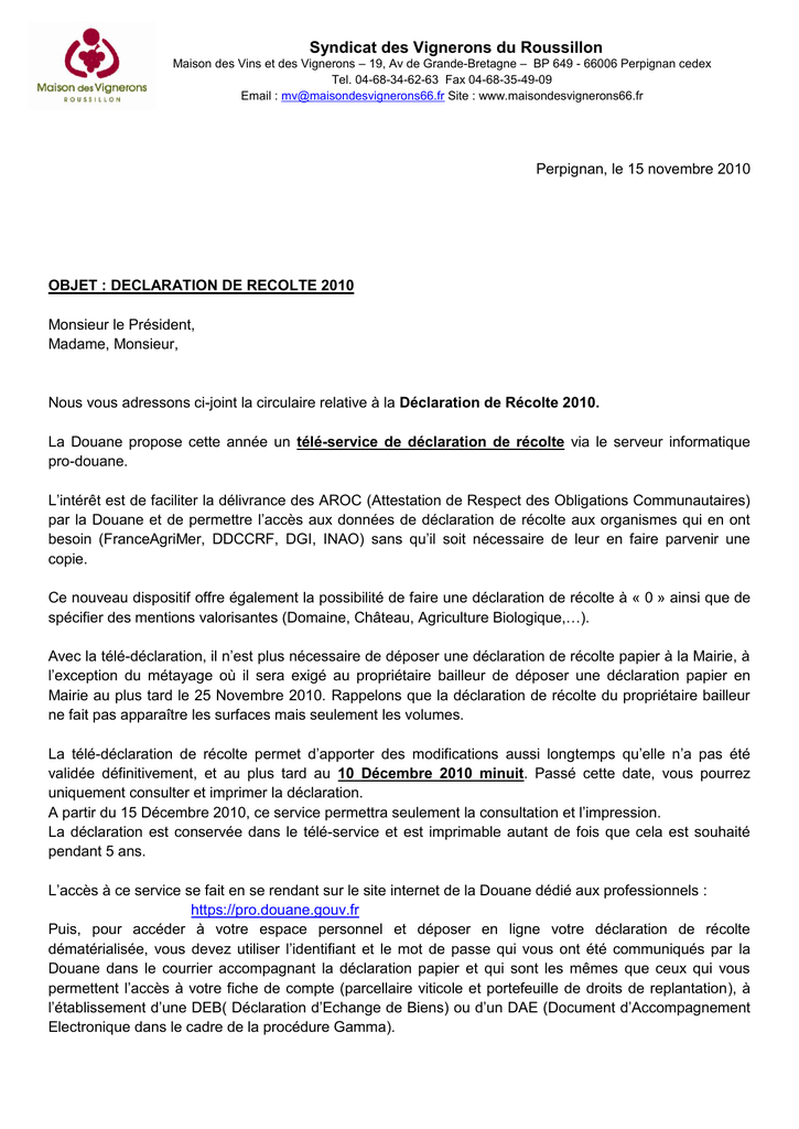 Syndicat des Vignerons du Roussillon Maison des Vins et des Vignerons – 19, Av de Grande-Bretagne – BP 649 - 66006 Perpignan cedex Tel. 04-68-34-62-63 Fax 04-68-35-49-09 Email : [email protected] Site : www.maisondesvignerons66.fr Perpignan, le 15 novembre 2010 OBJET : DECLARATION DE RECOLTE 2010 Monsieur le Président, Madame, Monsieur, Nous vous adressons ci-joint la circulaire relative à la Déclaration de Récolte 2010. La Douane propose cette année un télé-service de déclaration de récolte via le serveur informatique pro-douane. L’intérêt est de faciliter la délivrance des AROC (Attestation de Respect des Obligations Communautaires) par la Douane et de permettre l’accès aux données de déclaration de récolte aux organismes qui en ont besoin (FranceAgriMer, DDCCRF, DGI, INAO) sans qu’il soit nécessaire de leur en faire parvenir une copie. Ce nouveau dispositif offre également la possibilité de faire une déclaration de récolte à « 0 » ainsi que de spécifier des mentions valorisantes (Domaine, Château, Agriculture Biologique,…). Avec la télé-déclaration, il n’est plus nécessaire de déposer une déclaration de récolte papier à la Mairie, à l’exception du métayage où il sera exigé au propriétaire bailleur de déposer une déclaration papier en Mairie au plus tard le 25 Novembre 2010. Rappelons que la déclaration de récolte du propriétaire bailleur ne fait pas apparaître les surfaces mais seulement les volumes. La télé-déclaration de récolte permet d’apporter des modifications aussi longtemps qu’elle n’a pas été validée définitivement, et au plus tard au 10 Décembre 2010 minuit. Passé cette date, vous pourrez uniquement consulter et imprimer la déclaration. A partir du 15 Décembre 2010, ce service permettra seulement la consultation et l’impression. La déclaration est conservée dans le télé-service et est imprimable autant de fois que cela est souhaité pendant 5 ans. L’accès à ce service se fait en se rendant sur le site internet de la Douane dédié aux professionnels : https://pro.douane.gouv.fr Puis, pour accéder à votre espace personnel et déposer en ligne votre déclaration de récolte dématérialisée, vous devez utiliser l’identifiant et le mot de passe qui vous ont été communiqués par la Douane dans le courrier accompagnant la déclaration papier et qui sont les mêmes que ceux qui vous permettent l’accès à votre fiche de compte (parcellaire viticole et portefeuille de droits de replantation), à l’établissement d’une DEB( Déclaration d’Echange de Biens) ou d’un DAE (Document d’Accompagnement Electronique dans le cadre de la procédure Gamma). Pour accéder à ce service, les caves coopératives devront demander l’habilitation en remplissant la fiche en ligne correspondante. Les caves coopératives devront être mandatées par écrit par leurs adhérents pour rédiger tout ou partie de la déclaration de récolte et pour l’envoyer sur le compte pro-douane de l’adhérent. L’envoi peut être réalisé : - En mode brouillon (l’adhérent devra valider ultérieurement sa déclaration), - En mode temporaire (sans action de l’adhérent, la déclaration sera automatiquement validée à l’échéance du 10 Décembre), - En mode définitif. Une cave particulière adhérente à une ou plusieurs caves coopératives ayant saisi des données pour son compte, peut également compléter sa déclaration avec les informations concernant la vinification qu’elle a réalisée dans ses chais. Toutefois, il reste possible de déposer une déclaration de récolte papier à condition d’utiliser le formulaire Cerfa n°10702*02 ou 10702*01. La date limite pour la déposer à la Mairie du siège de l’exploitation est fixée au Jeudi 25 Novembre 2010. Rappelons qu’il n’est pas nécessaire de reconstituer une déclaration de récolte totale dans le cas d’une exploitation viticole adhérente à plusieurs caves. Il suffit de regrouper les déclarations de récolte partielles relatives à chacune des unités de vinification et de déposer le tout à la Mairie de la Commune du siège de l’exploitation. Les Caves Coopératives sont tenues aussi de fournir aux Services de la Viticulture des Douanes, la déclaration de production SV11 au plus tard le 10 Décembre 2010. Enfin, les Caves Coopératives et les Vignerons Indépendants sont tenus de fournir au Syndicat des Vignerons dès que possible et au plus tard le 31 Décembre 2010, respectivement une déclaration de récolte récapitulative et une copie de la déclaration de récolte et pour les deux une copie des déclarations définitives de mutage. Les raisons en sont les suivantes : - Ne pas ralentir la procédure administrative de traitement des déclarations de revendication en Vins de Pays et en AOC, Obtenir très tôt des statistiques plus précises. Nous vous prions d’agréer, Monsieur le Président, Madame, Monsieur, l’expression de nos sentiments les meilleurs. Le Président Denis PIGOUCHE 2 DECLARATION DE RECOLTE 2010 Comme chaque année, étant donnée la diversité de la production de notre département, le Syndicat des Vignerons rappelle aux producteurs les possibilités offertes pour chaque catégorie de vin. Depuis le 1ier Août 2009 la nouvelle classification des vins prévue par l’OCM Viti Vinicole est entrée en vigueur. Elle se répartie en 2 grandes catégories : - les vins à indication géographiques (AOP et IGP) - les vins sans indication géographique (avec ou sans mention du Millésime et/ou du cépage) Précision importante : Même s’il est recommandé de se familiariser rapidement avec ces nouveaux termes AOP / IGP / Vin sans IG et de les utiliser avec les nouveaux codes correspondants mentionnés dans la nouvelle nomenclature produit diffusée dans le registre de DRM édité par la Fédération Inter Sud de France, toute déclaration de récolte établie avec les anciens termes (AOC / Vins de Pays