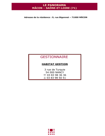 LE PANORAMA MÂCON – SAÔNE-ET-LOIRE (71) Adresse de la résidence : 9, rue Bigonnet – 71000 MÂCON GESTIONNAIRE HABITAT GESTION 3 rue de Turquie 54 000 NANCY ℡ 03 83 98 36 36 03 83 98 50 51 HABITAT GESTION La société HABITAT GESTION est une société ayant pour objet la location et la gestion de tous immeubles. Elle exploite avec une équipe de professionnels de l’hébergement depuis 1999 plus de 1 000 lits sous forme de résidence de tourisme, résidences services et d’hôtellerie. Elle assure, outre le métier d’exploitant hôtelier, le métier de gestionnaire d’immeuble, assurant ainsi pour ses clients investisseurs une mission ‘‘full services’’. La gestion d’immeubles à nécessité la mise en place d’une double compétence basée sur : • La gestion administrative (signature des baux avec les locataires, perception des loyers, règlement des loyers aux co-propriétaires), adossée à un mandat de syndic. • La maintenance du patrimoine, nécessitant la mise en place d’équipes spécialisées. La société HABITAT GESTION exploite en priorité les programmes résidentiels et hôteliers réalisés par la société de construction : NOUVEL HABITAT PROMOTION & CONSTRUCTION. Raison Social Capital Immatriculation au RCS Nancy Siège Social Date de création Associés et co-gérants Organismes bancaires Crédit Chiffre d’affaires géré en 2007 Chiffre d’affaires géré en 2006 Chiffre d’affaires géré en 2005 Société Anonyme à Responsabilité Limitée (SARL) 30 490 € N°B 421 037 029 3, rue de Turquie à Nancy Décembre 1998 Monsieur Olivier ERCOLANI (Architecte DPLG) Monsieur Jean-Marc PETIPAIN (Centrale Paris) Crédit Mutuel Banque de l’Economie et du Mutuel Banque Populaire de Lorraine Champagne 3 200 000€ HT 3 000 000€ HT 2 600 000€ HT HABITAT GESTION ETABLISSEMENTS EN GESTION LA MAISON DES CHERCHEURS Sa situation En plein cœur du quartier du Vélodrome, de ses magasins et du pôle universitaire et scientifique de Nancy Vandoeuvre (universités, écoles supérieures et laboratoires de recherche), La Maison des Chercheurs se situe aussi à quelques stations de trams et de bus du cœur de Nancy et de sa place Stanislas. Spécialisé dans l’accueil de personnel en mobilité professionnelle, La Maison des Chercheurs vous propose des logements prêts à vivre, pour quelques jours ou plusieurs mois. La Maison des Chercheurs est ouverte depuis 2002, son taux d’occupation est de 88 % Sa clientèle est composée de chercheurs, d’étudiants et de salariés. En été 2008, une nouvelle tranche – La Clef de Voute – a ouverte à proximité immédiate. Elle comprend 82 appartements. Ses logements Avec 84 studios meublés de 20 m² et 73 studios meublés de 30 m², une chambre en plus de la pièce principale, la résidence vous accueille dans un cadre chaleureux et convivial. Pour votre confort, tous nos appartements sont meublés et équipés d’un placard de rangement, d’une kitchenette complète (plaque de cuisson, évier, frigo, table et chaise), d’une salle de bains, de la literie et d’un coin bureau. De plus, les logements disposent des dernières technologies avec une prise Internet Haut Débit, ainsi que de la prise téléphonique et de télévision. Ses services La Maison des Chercheurs met à votre disposition de véritables services: - . accueil bureautique accès internet laverie (lave linge, sèche linge) - Service ménage, - Location de linge, - Parking privatif, HABITAT GESTION ETABLISSEMENTS EN GESTION CHAMP DE MARS Au cœur de la Ville des Sacres Ville de plus de 185 000 habitants, à moins d'une heure de Paris, Reims, pôle tertiaire et universitaire offre un dynamisme et un confort absolu. Elle garantit à ses résidents un cadre de vie harmonieux et accueillant comme en témoigne le classement au patrimoine mondial de l'Unesco de quatre de ses monuments, le développement des activités du secteur tertiaire et la création de Reims Champagne Congrès, lieu de rencontre de congressistes nationaux et internationaux. En plein cœur de la ville des sacres et du Champagne, située à 2 pas du centre ville et de la gare, à quelques stations par autobus des universités et écoles supérieures, la "Résidence Hôtelière du Champ de Mars" est voisine des célèbres Maisons de Champagne. La résidence du Champ de Mars est ouverte depuis 1999, son taux d’occupation est de 83 %. Sa clientèle est composée pour moitié par des salariés en cours séjours et pour l’autre part des étudiants. Une solution nouvelle à vos attentes La Résidence hôtelière du Champ de Mars vous propose différentes formules "à la carte". Dans un cadre flambant neuf et design, la Résidence Hôtelière du Champ de Mars met à votre disposition 79 logements et offre de véritables services para-hôteliers. Appartements : Type II meublés, studios meublés, studios confort. Spécialisé dans l'accueil de personnel en mobilité professionnelle, La Résidence du Champ de Mars vous propose des logements prêts à vivre, pour quelques jours ou plusieurs mois. Nos "Services-Plus" • Point Info-Service • Parking privé clos • Télécopie • Photocopieuse • Ordinateurs avec accès internet • • • • Loisirs : Fitness - Télévision - Billard... Service ménage - Location vaisselle, four Buanderie Table + fer à repasser HABITAT GESTION ETABLISSEMENTS EN GESTION RESIDENCES DU COURS MOREAU Au cœur de la Bourgogne, la ville de Mâcon affiche un caractère souriant avec ses quais de Saône aux façades colorées, ses terrasses animées et son cœur historique intimiste. Laissez-vous tenter par la fraîcheur des caves où vous pourrez déguster avec modération les vins des différents vignobles du Mâconnais et du Beaujolais. Une solution nouvelle à vos attentes La Résidence Hôtelière du Cours Moreau se prête idéalement à tous les évènements de la vie locale. Spécialisé dans l’accueil de personnel en mobilité professio