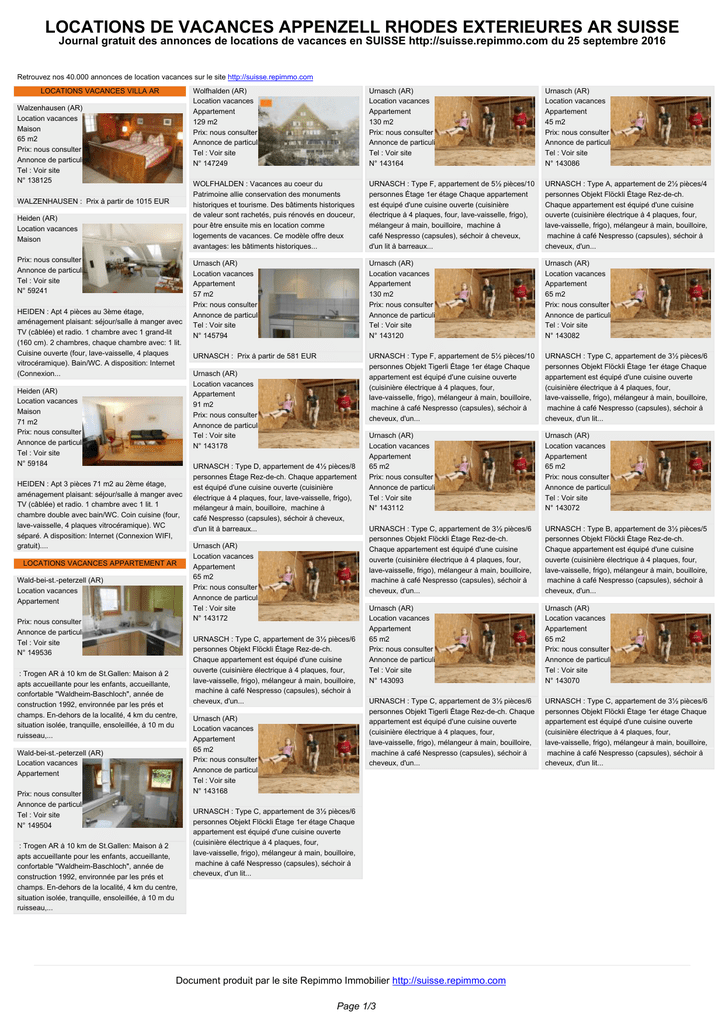 LOCATIONS DE VACANCES APPENZELL RHODES EXTERIEURES AR SUISSE Journal gratuit des annonces de locations de vacances en SUISSE http://suisse.repimmo.com du 25 septembre 2016 Retrouvez nos 40.000 annonces de location vacances sur le site http://suisse.repimmo.com LOCATIONS VACANCES VILLA AR Walzenhausen (AR) Location vacances Maison 65 m2 Prix: nous consulter Annonce de particulier Tel : Voir site N° 138125 WALZENHAUSEN : Prix à partir de 1015 EUR Heiden (AR) Location vacances Maison Prix: nous consulter Annonce de particulier Tel : Voir site N° 59241 HEIDEN : Apt 4 pièces au 3ème étage, aménagement plaisant: séjour/salle à manger avec TV (câblée) et radio. 1 chambre avec 1 grand-lit (160 cm). 2 chambres, chaque chambre avec: 1 lit. Cuisine ouverte (four, lave-vaisselle, 4 plaques vitrocéramique). Bain/WC. A disposition: Internet (Connexion... Heiden (AR) Location vacances Maison 71 m2 Prix: nous consulter Annonce de particulier Tel : Voir site N° 59184 HEIDEN : Apt 3 pièces 71 m2 au 2ème étage, aménagement plaisant: séjour/salle à manger avec TV (câblée) et radio. 1 chambre avec 1 lit. 1 chambre double avec bain/WC. Coin cuisine (four, lave-vaisselle, 4 plaques vitrocéramique). WC séparé. A disposition: Internet (Connexion WIFI, gratuit).... LOCATIONS VACANCES APPARTEMENT AR Wald-bei-st.-peterzell (AR) Location vacances Appartement Prix: nous consulter Annonce de particulier Tel : Voir site N° 149536 : Trogen AR à 10 km de St.Gallen: Maison à 2 apts accueillante pour les enfants, accueillante, confortable "Waldheim-Baschloch", année de construction 1992, environnée par les prés et champs. En-dehors de la localité, 4 km du centre, situation isolée, tranquille, ensoleillée, à 10 m du ruisseau,... Wald-bei-st.-peterzell (AR) Location vacances Appartement Prix: nous consulter Annonce de particulier Tel : Voir site N° 149504 : Trogen AR à 10 km de St.Gallen: Maison à 2 apts accueillante pour les enfants, accueillante, confortable "Waldheim-Baschloch", année de construction 1992, environnée par les prés et champs. En-dehors de la localité, 4 km du centre, situation isolée, tranquille, ensoleillée, à 10 m du ruisseau,... Wolfhalden (AR) Location vacances Appartement 129 m2 Prix: nous consulter Annonce de particulier Tel : Voir site N° 147249 Urnasch (AR) Location vacances Appartement 130 m2 Prix: nous consulter Annonce de particulier Tel : Voir site N° 143164 Urnasch (AR) Location vacances Appartement 45 m2 Prix: nous consulter Annonce de particulier Tel : Voir site N° 143086 WOLFHALDEN : Vacances au coeur du Patrimoine allie conservation des monuments historiques et tourisme. Des bâtiments historiques de valeur sont rachetés, puis rénovés en douceur, pour être ensuite mis en location comme logements de vacances. Ce modèle offre deux avantages: les bâtiments historiques... URNASCH : Type F, appartement de 5½ pièces/10 personnes Étage 1er étage Chaque appartement est équipé d'une cuisine ouverte (cuisinière électrique à 4 plaques, four, lave-vaisselle, frigo), mélangeur à main, bouilloire, machine à café Nespresso (capsules), séchoir à cheveux, d'un lit à barreaux... URNASCH : Type A, appartement de 2½ pièces/4 personnes Objekt Flöckli Étage Rez-de-ch. Chaque appartement est équipé d'une cuisine ouverte (cuisinière électrique à 4 plaques, four, lave-vaisselle, frigo), mélangeur à main, bouilloire, machine à café Nespresso (capsules), séchoir à cheveux, d'un... Urnasch (AR) Location vacances Appartement 57 m2 Prix: nous consulter Annonce de particulier Tel : Voir site N° 145794 Urnasch (AR) Location vacances Appartement 130 m2 Prix: nous consulter Annonce de particulier Tel : Voir site N° 143120 Urnasch (AR) Location vacances Appartement 65 m2 Prix: nous consulter Annonce de particulier Tel : Voir site N° 143082 URNASCH : Prix à partir de 581 EUR URNASCH : Type F, appartement de 5½ pièces/10 personnes Objekt Tigerli Étage 1er étage Chaque appartement est équipé d'une cuisine ouverte (cuisinière électrique à 4 plaques, four, lave-vaisselle, frigo), mélangeur à main, bouilloire, machine à café Nespresso (capsules), séchoir à cheveux, d'un... URNASCH : Type C, appartement de 3½ pièces/6 personnes Objekt Flöckli Étage 1er étage Chaque appartement est équipé d'une cuisine ouverte (cuisinière électrique à 4 plaques, four, lave-vaisselle, frigo), mélangeur à main, bouilloire, machine à café Nespresso (capsules), séchoir à cheveux, d'un lit... Urnasch (AR) Location vacances Appartement 65 m2 Prix: nous consulter Annonce de particulier Tel : Voir site N° 143112 Urnasch (AR) Location vacances Appartement 65 m2 Prix: nous consulter Annonce de particulier Tel : Voir site N° 143072 URNASCH : Type C, appartement de 3½ pièces/6 personnes Objekt Flöckli Étage Rez-de-ch. Chaque appartement est équipé d'une cuisine ouverte (cuisinière électrique à 4 plaques, four, lave-vaisselle, frigo), mélangeur à main, bouilloire, machine à café Nespresso (capsules), séchoir à cheveux, d'un... URNASCH : Type B, appartement de 3½ pièces/5 personnes Objekt Flöckli Étage Rez-de-ch. Chaque appartement est équipé d'une cuisine ouverte (cuisinière électrique à 4 plaques, four, lave-vaisselle, frigo), mélangeur à main, bouilloire, machine à café Nespresso (capsules), séchoir à cheveux, d'un... Urnasch (AR) Location vacances Appartement 65 m2 Prix: nous consulter Annonce de particulier Tel : Voir site N° 143093 Urnasch (AR) Location vacances Appartement 65 m2 Prix: nous consulter Annonce de particulier Tel : Voir site N° 143070 URNASCH : Type C, appartement de 3½ pièces/6 personnes Objekt Tigerli Étage Rez-de-ch. Chaque appartement est équipé d'une cuisine ouverte (cuisinière électrique à 4 plaques, four, lave-vaisselle, frigo), mélangeur à main, bouilloire, machine à café Nespresso (capsules), séchoir à cheveux, d'un... URNASCH : Type C, appartement de 3½ pièces/6 perso
