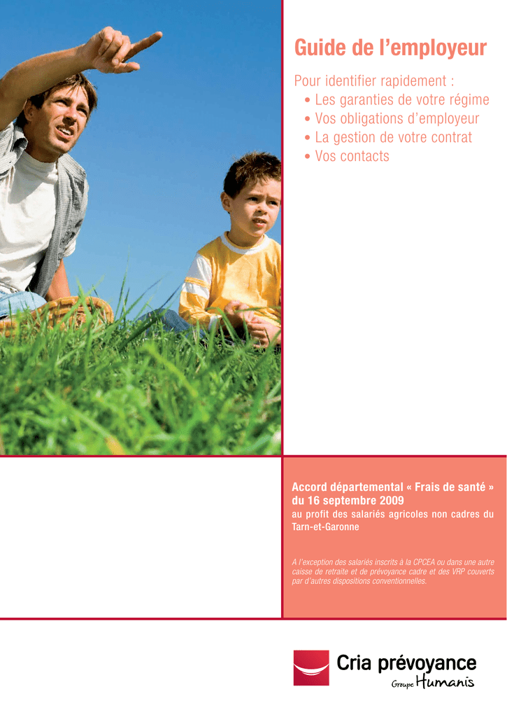 Guide de l’employeur Pour identifier rapidement : • Les garanties de votre régime • Vos obligations d’employeur • La gestion de votre contrat • Vos contacts Accord départemental « Frais de santé » du 16 septembre 2009 au profit des salariés agricoles non cadres du Tarn-et-Garonne A l’exception des salariés inscrits à la CPCEA ou dans une autre caisse de retraite et de prévoyance cadre et des VRP couverts par d’autres dispositions conventionnelles. Votre guide employeur Vous êtes adhérent au régime Frais de santé défini par l’accord départemental du Tarn-et-Garonne, signé le 16 septembre 2009 entre les différents partenaires sociaux et applicable pour l’ensemble des salariés agricoles Non Cadres, ayant une ancienneté minimale de 4 mois et à l’ensemble des entreprises visées dans le champ d’application de l’accord. Cria prévoyance, institution de prévoyance dédiée au secteur agricole et membre du groupe Humanis, est désignée par les partenaires sociaux de votre branche professionnelle sur le département du Tarn-et-Garonne comme assureur et gestionnaire du régime Frais de Santé. 2 Les avantages de l’accord … Pour le salarié •Une avancée sociale : l’entreprise permet à ses salariés de bénéficier de garanties collectives de prévoyance essentielles pour eux (et pour la protection de leur famille en option), •Une bonne couverture à un coût réduit : les salariés accèdent à un bon niveau de couverture pour des montants de cotisation généralement réduits comparés à un contrat individuel. Le financement de l’employeur permet également de réduire la cotisation du salarié, •L’absence de sélection médicale, •Un cadre fiscal avantageux : les cotisations des salariés sont déductibles pour le calcul de leur revenu net imposable (selon les règles sociales et fiscales en vigueur et dans certaines limites). Pour l’employeur •La valorisation de la profession agricole à travers une protection sociale complémentaire (embauche, fidélisation…), •Un cadre fiscal et social favorable : les cotisations des entreprises sont déductibles de l’impôt sur les bénéfices et sont exonérées de charges sociales (selon les règles sociales et fiscales en vigueur et dans certaines limites), •Une simplification administrative : les conditions d’application du régime étant validées et suivies par vos représentants, vous n’avez plus à vous soucier de la négociation et de l’adaptation dans le temps de la couverture frais de santé de vos salariés. Pour l’entreprise et ses salariés •Le pilotage du régime par les représentants départementaux de la profession : la création d’un régime départemental dédié à l’agriculture et géré par un seul opérateur, la Cria prévoyance, permet aux représentants des employeurs et des salariés de maîtriser au niveau départemental la protection sociale complémentaire des salariés concernés. En effet, l’ensemble des éléments de gestion du régime (rapport prestations/cotisations, statistiques sur les consommations santé…) est suivi et discuté annuellement par la Commission Paritaire de Gestion du régime (composée des organisations signataires de l’accord). 1 Votre régime frais de santé A quelle date votre entreprise doit-elle adhérer au nouveau régime ? Conformément aux dispositions de l’accord départemental du 16 septembre 2009, les nouvelles obligations de couverture de vos salariés en matière de frais de santé sont applicables à compter du 1er janvier 2010. Quels sont les salariés concernés par cet accord ? Tous les salariés non cadres ayant au moins 4 mois d’ancienneté dans l’entreprise sont concernés par cet accord. Les garanties sont acquises dès la date d’embauche du salarié. En complément, les partenaires sociaux ont prévu que les ayants droit, les salariés ne remplissant pas les conditions d’ancienneté ou dont le contrat est suspendu, puissent bénéficier à titre individuel et facultatif, de la même couverture frais de santé. 3 Quelles sont les garanties prévues par le régime ? Les prestations ci-dessous viennent en complément du régime de base (Mutualité Sociale Agricole ou Sécurité sociale). Le total des remboursements de la Mutualité Sociale Agricole (ou Sécurité sociale), de Cria prévoyance et de tout autre organisme complémentaire ne peut excéder le montant des dépenses engagées. DESIGNATION DES ACTES Remboursement Régime de base Remboursement Remboursement total Cria prévoyance Régime de base+Cria prévoyance Frais Médicaux Consultation et visite (médecin ou spécialiste) 70% BR 130% BR 200% BR Auxiliaires Médicaux, soins infirmiers, massages, pédicure, orthophonistes, 60% BR 40% BR 100% BR orthoptistes, Sages femmes 70% BR 30% BR 100% BR Analyses, examens de laboratoire 60% BR 40% BR 100% BR Radiographie, électroradiologie 70% BR 30% BR 100% BR Participation forfaitaire sur les actes Pris en charge médicaux lourds (18 €) Cures thermales acceptées 65% BR 35% BR 100% BR Transport remboursé par la SS 65%35% 100% BR Pharmacie 15 à 100% Vaccins prescrits Vignette blanche : 35%, 100% du TFR bleue : 65%, orange : 85% 40 € par an et par famille 40 € par an et par famille Frais d’optique Verres, montures, lentilles 65% BR remboursés par la SS 390% BR+forfait de 350 € 455% BR+forfait de 350 € par an et par bénéficiaire par an et par bénéficiaire Frais dentaires Soins et honoraires 70% BR 30% BR Parodontologie 100 € par an et par bénéficiaire Prothèses dentaires remboursées par la SS 70% BR 140% BR+forfait de 350 € par an et par bénéficiaire Orthodontie remboursée par la SS (enfants 100% BR 150% BR de moins de 16 ans) 100% BR 100 € par an et par bénéficiaire 210% BR+forfait de 350 € par an et par bénéficiaire 250% BR Appareillage Fournitures médicales, pansements, gros et de 65% à 100% BR 235% BR 300% BR petits appareillages, proth
