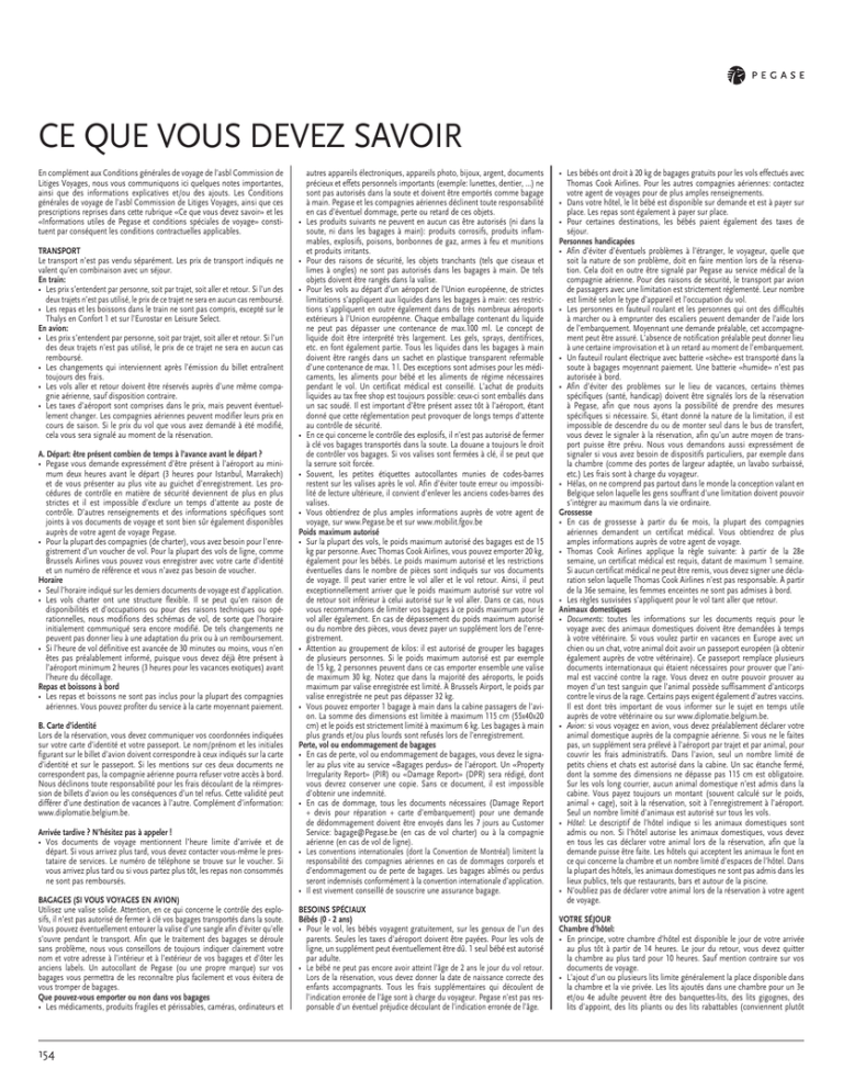 CE QUE VOUS DEVEZ SAVOIR En complément aux Conditions générales de voyage de l’asbl Commission de Litiges Voyages, nous vous communiquons ici quelques notes importantes, ainsi que des informations explicatives et/ou des ajouts. Les Conditions générales de voyage de l’asbl Commission de Litiges Voyages, ainsi que ces prescriptions reprises dans cette rubrique «Ce que vous devez savoir» et les «Informations utiles de Pegase et conditions spéciales de voyage» constituent par conséquent les conditions contractuelles applicables. TRANSPORT Le transport n’est pas vendu séparément. Les prix de transport indiqués ne valent qu’en combinaison avec un séjour. En train: • Les prix s’entendent par personne, soit par trajet, soit aller et retour. Si l’un des deux trajets n’est pas utilisé, le prix de ce trajet ne sera en aucun cas remboursé. • Les repas et les boissons dans le train ne sont pas compris, excepté sur le Thalys en Confort 1 et sur l’Eurostar en Leisure Select. En avion: • Les prix s’entendent par personne, soit par trajet, soit aller et retour. Si l’un des deux trajets n’est pas utilisé, le prix de ce trajet ne sera en aucun cas remboursé. • Les changements qui interviennent après l’émission du billet entraînent toujours des frais. • Les vols aller et retour doivent être réservés auprès d’une même compagnie aérienne, sauf disposition contraire. • Les taxes d’aéroport sont comprises dans le prix, mais peuvent éventuellement changer. Les compagnies aériennes peuvent modifier leurs prix en cours de saison. Si le prix du vol que vous avez demandé à été modifié, cela vous sera signalé au moment de la réservation. A. Départ: être présent combien de temps à l’avance avant le départ ? • Pegase vous demande expressément d’être présent à l’aéroport au minimum deux heures avant le départ (3 heures pour Istanbul, Marrakech) et de vous présenter au plus vite au guichet d’enregistrement. Les procédures de contrôle en matière de sécurité deviennent de plus en plus strictes et il est impossible d’exclure un temps d’attente au poste de contrôle. D’autres renseignements et des informations spécifiques sont joints à vos documents de voyage et sont bien sûr également disponibles auprès de votre agent de voyage Pegase. • Pour la plupart des compagnies (de charter), vous avez besoin pour l’enregistrement d’un voucher de vol. Pour la plupart des vols de ligne, comme Brussels Airlines vous pouvez vous enregistrer avec votre carte d’identité et un numéro de référence et vous n’avez pas besoin de voucher. Horaire • Seul l’horaire indiqué sur les derniers documents de voyage est d’application. • Les vols charter ont une structure flexible. Il se peut qu’en raison de disponibilités et d’occupations ou pour des raisons techniques ou opérationnelles, nous modifions des schémas de vol, de sorte que l’horaire initialement communiqué sera encore modifié. De tels changements ne peuvent pas donner lieu à une adaptation du prix ou à un remboursement. • Si l’heure de vol définitive est avancée de 30 minutes ou moins, vous n’en êtes pas préalablement informé, puisque vous devez déjà être présent à l’aéroport minimum 2 heures (3 heures pour les vacances exotiques) avant l’heure du décollage. Repas et boissons à bord • Les repas et boissons ne sont pas inclus pour la plupart des compagnies aériennes. Vous pouvez profiter du service à la carte moyennant paiement. B. Carte d’identité Lors de la réservation, vous devez communiquer vos coordonnées indiquées sur votre carte d’identité et votre passeport. Le nom/prénom et les initiales figurant sur le billet d’avion doivent correspondre à ceux indiqués sur la carte d’identité et sur le passeport. Si les mentions sur ces deux documents ne correspondent pas, la compagnie aérienne pourra refuser votre accès à bord. Nous déclinons toute responsabilité pour les frais découlant de la réimpression de billets d’avion ou les conséquences d’un tel refus. Cette validité peut différer d’une destination de vacances à l’autre. Complément d’information: www.diplomatie.belgium.be. Arrivée tardive ? N’hésitez pas à appeler ! • Vos documents de voyage mentionnent l’heure limite d’arrivée et de départ. Si vous arrivez plus tard, vous devez contacter vous-même le prestataire de services. Le numéro de téléphone se trouve sur le voucher. Si vous arrivez plus tard ou si vous partez plus tôt, les repas non consommés ne sont pas remboursés. BAGAGES (SI VOUS VOYAGES EN AVION) Utilisez une valise solide. Attention, en ce qui concerne le contrôle des explosifs, il n’est pas autorisé de fermer à clé vos bagages transportés dans la soute. Vous pouvez éventuellement entourer la valise d’une sangle afin d’éviter qu’elle s’ouvre pendant le transport. Afin que le traitement des bagages se déroule sans problème, nous vous conseillons de toujours indiquer clairement votre nom et votre adresse à l’intérieur et à l’extérieur de vos bagages et d’ôter les anciens labels. Un autocollant de Pegase (ou une propre marque) sur vos bagages vous permettra de les reconnaître plus facilement et vous évitera de vous tromper de bagages. Que pouvez-vous emporter ou non dans vos bagages • Les médicaments, produits fragiles et périssables, caméras, ordinateurs et 154 autres appareils électroniques, appareils photo, bijoux, argent, documents précieux et effets personnels importants (exemple: lunettes, dentier, …) ne sont pas autorisés dans la soute et doivent être emportés comme bagage à main. Pegase et les compagnies aériennes déclinent toute responsabilité en cas d’éventuel dommage, perte ou retard de ces objets. • Les produits suivants ne peuvent en aucun cas être autorisés (ni dans la soute, ni dans les bagages à main): produits corrosifs, pr