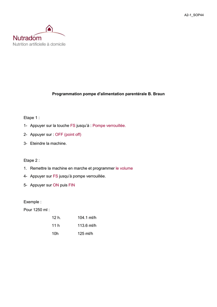 A2-1_SOP44 Programmation pompe d'alimentation parentérale B. Braun Etape 1 : 1- Appuyer sur la touche FS jusqu’à : Pompe verrouillée. 2- Appuyer sur : OFF (point off) 3- Eteindre la machine. Etape 2 : 1. Remettre la machine en marche et programmer le volume 4- Appuyer sur FS jusqu’à pompe verrouillée. 5- Appuyer sur ON puis FIN Exemple : Pour 1250 ml : 12 h. 104.1 ml/h 11 h 113.6 ml/h 10h 125 ml/h