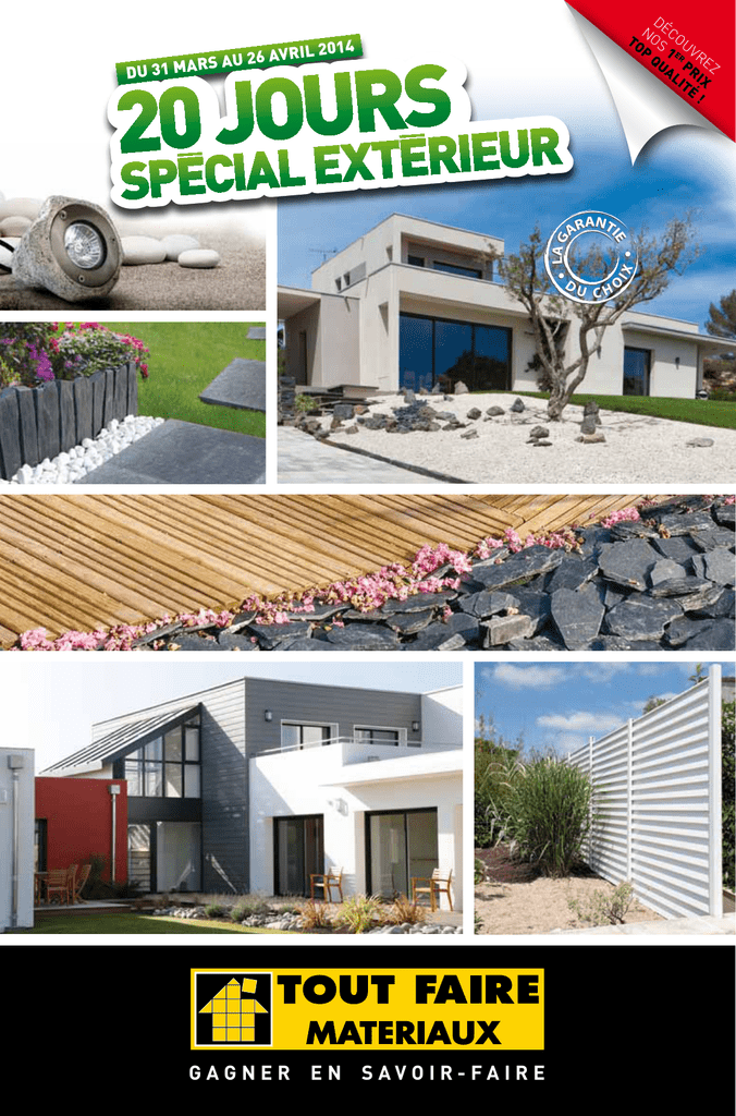 IX IX U CHO D U C HO LA G AN AR TI D E AN AR TI E D E AN AR TI LA G RIL 2014 LA G DU 3 U 26 AV 1 MARS A D no éco To s u p 1 er v r qu p e a l ri z it x é ! U CHO MATERIAUX Gagner en savoir-faire *$* Z Z terrasse bois 1er prix Top Qualité 11, 90 € le m2 Classe IV Poteau carré traité classe 4. Pin rouge. Traitement autoclave classe IV. KD. Raboté 4 faces angles arrondis. Bois certifié FSC : 90 x 90, 1ml80, réf. 3020912 90 x 90, 2ml40, réf. 3020913, 12,19€ 90 x 90, 3ml, réf. 3020914 120 x 120, 2ml40, réf. 3020917 120 x 120, 3ml, réf. 3020918 ,19/U 140 x 140, 3ml, réf. 3020922. 90x90 en 2ml40 Lame terrasse 21 x 95 Pin rouge traité autoclave classe IV - Bois certifié FSC- Longueur 2m40. Réf. 3020657 12 Large choix de lambourdes et bois de structure, en stock En raboté 4 angles arrondis : 45 x 45 en 2,40ml et 3ml Réf. 3020057/3020056/3020902 ,99/U 45 x 70 en 3ml, Réf. 3020907 45x70 en 3m 36 x 120 en 3ml, Réf. 3020268 45 x 95 en 4,20ml, Réf. 3020263 45 x 145 en 4,20ml, Réf. 3020272 70 x 195 en 4ml, Réf. 3020270 Épaisseur 21mm Traitée classe 4 5 15,90/ M2 Lambourde en bois exotique : Sections 42x70. Naturellement classe IV. Réf. 3020640 /641 /644 5,29/ ML Vis inox spéciale terrasse Dimensions 5 x 50 - Tête autofraisante - double filetage pour prévenir le fendage du bois - Tête légèrement bombée pour assurer une pose soignée - en inox A2 Existe également en 5x60. Boîte de 200 pièces. ,90/U Réf. 2070001 Classe IV Lame terrasse 27 x 145 Pin rouge traité autoclave classe IV - Bois certifié FSC- Longueur 3ml, 3,60ml, 3,90ml ou 4,20ml selon arrivage. Réf. 3020642/3020646/3020648/3020649 29 145 mm 22,90/ M2 Lame de terrasse en pin Douglas traité autoclave classe III Section 28 x 190 - Qualité DURAPIN Coloris marron - Longueur 4ml Réf. 3020587 Made in France Grande largeur : 190 mm p.2 Apportez vos plans, on s’occupe de tout !.. étude technique, métré et devis gratuits terrasse bois Nouveau 29,90/ M2 2,69/ U 59,90/ Les incontournables Plot réglable Pour hauteur de 40 à 70mm Existe en plusieurs hauteurs. Réf. 3020951 U Saturateur pour bois exotique Nourrit, protège de taches et de l’humidité, évite le grissaillement dû aux UV. Coloris teck. Réf. 1109919. Made in France Lame terrasse 22 x 130 Pinadur Pin sylvestre français. Qualité sans nœud ou petits nœuds G4-0/G4-1. Traitement autoclave classe IV certifié CTB b+. Profil biseauté pour une pose soignée. Coloris brun Ipé. Certification PEFC. Longueur 2,95ml. Réf. 3020660. 34,90/ M2 59,00/ U Dégrisseur bois 5L Dégrisseur tous bois, éclaircit les bois noircis par les UV. Ravive les bois et supprime les tâches de rouille, réf. 6892036. DU 31 MA RS AU 26 m 5m 14 Made in France Terrasse écologique en pin Douglas. Fabriquée en France, sans aucun traitement. Épaisseur 28 mm, largeur 145 mm, longueur selon arrivage, soit le m2 : 34.90€. Réf. 3020583. 14 AVRIL 20 49,90/ M2 Lame terrasse en bois exotique cumaru Section 21 x 145 - 1 face lisse 1 face rainurée - Longueur suivant arrivage - Sec séchoir KD pour une meilleure stabilité dimensionnelle - Naturellement classe IV. Réf. 3020527/3020548. MATERIAUX Véhicule disponible pour l’enlèvement des marchandises p.3 *$* Z Z terrasse composite 37,90/ M2 Lame de terrasse composite profil alvéolaire de Silverwood Deux coloris chocolat ou anthracite. Épaisseur 30 mm, largeur 145 mm. Issue d’un mélange équilibré de particules de bois et de polyéthylène Haute Densité. Imputrescible et durable, très facile d’entretien, elles donneront à votre extérieur une touche de modernité. Fixation invisible par clip inox. Réf. 3020600/3020611. 37,90€ le m2 ntes ! e v s e d Top able tt a b m i Prix Demande moins d’entretien que le bois ! 1 côté lisse 1 côté rainuré ! A vous de choisir 65,00/ M2 Nouveau Lame terrasse composite profil plein de silverwood Section 23x146 - Profil reversible 1 face rainurée, une face veinage bois - Fixation invisible par clip inox - 2 coloris gris clair et gris anthracite. Made in France 1 côté lisse 1 côté rainuré ! A vous de choisir p.4 Véhicule disponible pour l’enlèvement des marchandises éclairage Nouveau Prolongez vos soirées d’été en extérieur, grâce à la Gamme d’éclairages « prêt à l’emploi », équipée de connecteurs EASY CONNECT ! Vous permet de réaliser votre installation électrique, sans faire appel à un professionnel, d’un geste simple et sans outil. Spot cailloux Cadre alu gu10 16 w réf. 5530100 22,60/ U Projecteur alu noir À piquer 35 w réf. 5530101 27,90/ U Projecteur alu brossé À piquer 35 w réf. 5530102 Projecteur design alu noir À piquer 35 w réf. 5530104 42,40/ 32,90/ U U 3 Spot à encaster Ø 6cm, 9 leds blanc réf. 5530109 45 69,90/ U Spot à encastrer Ø 7,5 cm, 20 leds blanc chaud réf. 5530110 Projecteur inox IP67 Halogène 60 w réf. 5530106 74,90/ U Spot à encastrer rond Ø 11cm Halogène 20 w réf. 5530113 19,90/ 34,90 6 Mini-spot à encastrer Ø 4,5cm, 5 leds blanc ou bleu. Blanc, réf. 5530107 Bleu, réf. 5530108 ,90 Projecteur design alu Halogène 60 w réf. 5530105 42,13/ U U 26,90/ Spot à encastrer platine carré 10 x 10 Halogène 20 w ,67/U réf. 5530112 U 36 Spot à encastrer 6 x 10 cm 28 leds blanc chaud. réf. 5530111 A partir de 73,85/ U A partir de 49,90/ U Sphère lumineuse blanche, halogène 40 w Ø 25cm 49,90€ réf. 5530114. Ø 35cm 74,90€ réf. 5530115 Balise inox à piquer H 45cm, Halogène 40 w réf. 5530116 29,30/ U étude technique, métré et devis gratuits Borne lumineuse carrée teck H 70cm, halogène 40 w, réf. 5530119 118,25 € Borne lumineuse carrée inox H 70cm, halogène 40 w, réf. 5530118 88,60€ MATERIAUX Borne lumineuse carrée inox H 30cm, halogène 40 w, réf. 5530117 73,85€ p.5 *$* Z Z pavés béton DU 31 MA 1er prix Top Qualité RS AU 26 14 AVRIL 20 16,90/ 26,90/ M2 M2 17, 90 € le m2 Pavé béton 12 x 12 x 6 rouge Epaisseur 6cm - Autorise le passage de véhicules - Teinté dans la m
