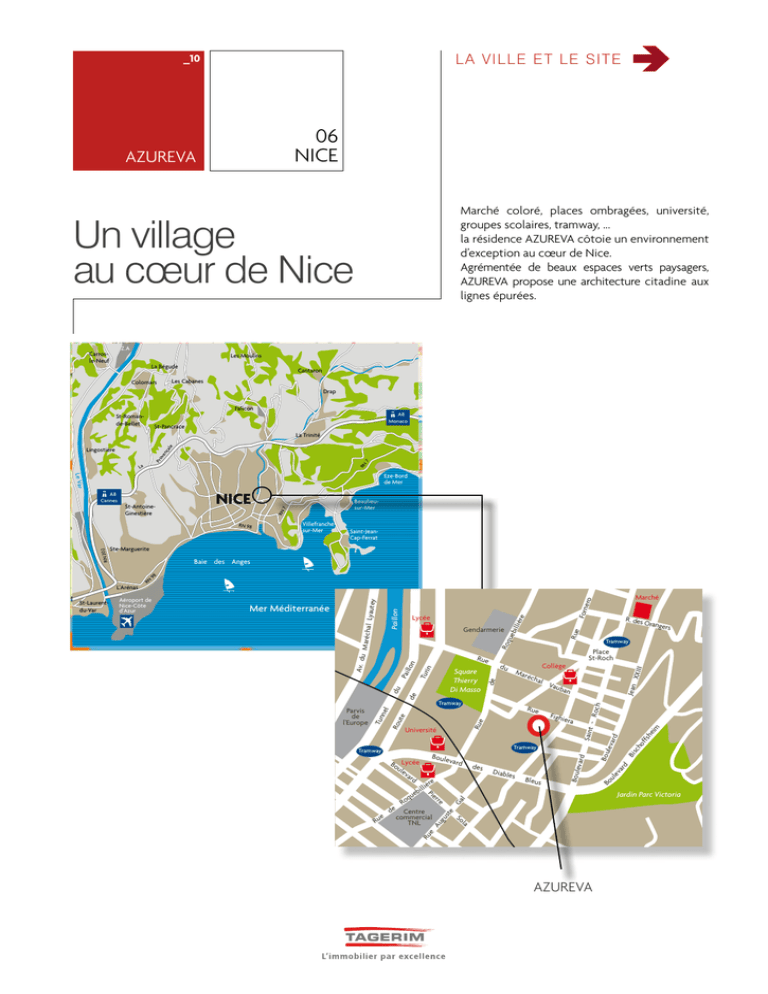 La v ill e et le Site _10 06 NICE AZUREVA Marché coloré, places ombragées, université, groupes scolaires, tramway, ... la résidence AZUREVA côtoie un environnement d’exception au cœur de Nice. Agrémentée de beaux espaces verts paysagers, AZUREVA propose une architecture citadine aux lignes épurées. Un village au cœur de Nice Z.A Carrosle-Neuf Les Moulins La Bégude Cantaron Les Cabanes Colomars Drap Falicon St-Romande-Bellet A8 Monaco St-Pancrace le La Trinité 7 Pro ve n ça Lingostière RN La Le Var Eze-Bord de Mer NICE Villefranchesur-Mer Saint-JeanCap-Ferrat Centre hospitalier Ste-Marguerite Baie des Anges ro Forn e ière Rue XXIII al Vau b Jean éch an s Bleus eim rd ch Jardin Parc Victoria So la Ru e Au gu ste re Ro de Centre e commercial Ru TNL Diable Ga ère illi eb Pier qu des l Boule vard Bo Lycée ule va rd Boule vard Tramway Tramway Bis Saint Rue ra leva Fighie ul ev ar d Rue Bou Tramway Université Tramway Place St-Roch Collège Mar Orang ers of fsh du de Tur in Square Thierry Di Masso R. des Bo Rue de du Pai ll on Roq ueb ill Gendarmerie te Rou Parvis de l'Europe Marché - Ro ch Paillon Lycée el Mer Méditerranée l Lyaute y Aéroport de Nice-Côte d'Azur Tramway 98 Tun n L'Arénas RN Av. d u Mar écha RN 20 2 RN 98 St-Laurentdu-Var Beaulieusur-Mer 7 St-AntoineGinestière RN A8 Cannes AZUREVA La v ill e et le Site _11 AZUREVA 06 NICE Rue du Docteur Fighiera Voie d’accès à la résidence Voie d’accès à la résidence La v ill e et le Site _12 AZUREVA Le foncier 06 NICE La v ill e et le Site _13 AZUREVA 06 NICE L’environnement résidentiel La v ill e et le Site _14 AZUREVA 06 NICE L’environnement urbain La médiathèque Pôle universitaire Cours de tennis à 20 m du foncier La ligne de tramway le programme _15 AZUREVA 06 NICE Les atouts du programme EN RESUME SUR NICE : Agglomération de plus de 900.000 habitants, Nice est classée 5ème Ville de France. Capitale de la Côte d’Azur, elle s’étend le long de la Baie des Anges entre le Mont Boron et l’embouchure du Var. Station estivale et hivernale, Nice jouit d’un climat exceptionnel et possède de nombreux atouts : la Promenade des Anglais, la place Masséna, le Château, la Vieille Ville, le Cours Saleya, l’Opéra, le port, les plages, le Carnaval... Elégante et dynamique, Nice séduit par la beauté de ses quartiers, son dynamisme et son incomparable qualité de vie. C’est au coeur de Nice qu’ «AZUREVA», rêve d’Azur, nous ouvre ses portes à proximité immédiate des commerces, collèges, tramway, nouvelle Médiathèque et Université Saint Jean d’Angely. n ATOUT 1 Situation idéale : entre Mer et Montagne, sur le littoral méditerranéen à 45 minutes des Alpes. n ATOUT 2 dynamique et attractive : forte de 210.000 emplois pour 45000 entreprises, à dominante tertiaire, Nice est la 5ème Ville de France. • Nice et sa région Provence-Alpes-Côte d’Azur attendent d’ici 20 ans, près d’un million de nouveaux arrivants. • TGV 2020 : pour une liaison grande vitesse en Paris et Nice. n ATOUT 3 Formation innovante : Sophia Antipolis est classée 2ème université pluri-disciplinaire de France grâce aux grandes écoles de commerce ou d’ingénieurs représentées. n ATOUT 4 Déficit chronique de 2 000 logements : L’agglomération de Nice enregistre un besoin de 5 000 logements par an et n’en construit que 3 000 tandis que 70% des permis de construire déposés sont rejetés. n ATOUT 5 Excellent rapport qualité - performance du produit : De par sa configuration, le foncier implique O nuisance, O vis-à-vis, de faibles probabilités de constructions périphériques … à seulement 5 minutes du port et de la Promenade des Anglais. n ATOUT 6 L’expérience locale du Groupe TAGERIM : L’estimation de nos loyers se fonde sur un plan d’expérience significatif de près de 10 000 logements sur le secteur. le program m e _16 AZUREVA 06 NICE Les atouts du programme I. ETUDE QUALITATIVE 1. Le point sociologique L’héliotropisme a toujours existé. Les Anglais par exemple, venaient prendre le soleil sur la côte d’Azur à la fin du XIXème siècle. Mais le phénomène ne cesse de s’amplifier : les Européens du Nord apprécient la douceur de vivre du Sud de la France, et les Français ne sont pas en reste, leur course au soleil se renforçant depuis une petite décennie. Rejet de la grisaille et d’un hiver qui n’en finit pas, pollution exacerbée source de maladies chroniques, envie de profiter d’une terrasse et de jardins, besoin d’un environnement propice à la détente, mer ou montagne... Autant de raisons qui poussent les habitants du Nord de la Loire à descendre vers le sud, avec, en plus, pour les actifs, des pôles économiques dynamiques tels que Sophia-Antipolis... La région Provence-Alpes-Côte d’Azur attend d’ici 20 ans, près d’un million de nouveaux arrivants. Ce mouvement de population observe en conséquence des répercussions sur le marché immobilier, que ce soit au niveau des cœurs de villes, des périphéries ou des résidences secondaires se transformant parfois rapidement en résidences principales. Les jeunes actifs recherchent les secteurs en réhabilitation moins coûteux alors que les quadragénaires à la tête d’une famille, flashent sur un espace en bord de mer à proximité des infrastructures scolaires et universitaires. Les retraités revendent leurs villas … pour se rapprocher des services et s’installent au cœur des villes. Malgré ces mouvements contraires, il faut bien loger tout le monde. Dans les quartiers centraux, pas de problème : n les petites surfaces sont accaparées par les jeunes n les surfaces intermédiaires séduisent les jeunes familles et les retraités n les grandes par les familles recomposées pour jouir également d’un bel espace. Tout le monde y trouve son compte. 2. L’emploi : Nice Côte d’Azur s’ancre au cœur de la 6ème aire urbaine pour sa population. Elle rassemble un demi-mi