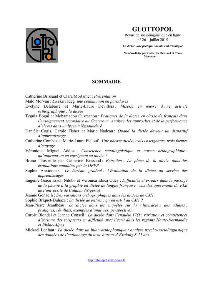GLOTTOPOL Revue de sociolinguistique en ligne n° 26 – juillet 2015 La dictée, une pratique sociale emblématique Numéro dirigé par Catherine Brissaud et Clara Mortamet SOMMAIRE Catherine Brissaud et Clara Mortamet : Présentation Malo Morvan : La skrivadeg, une communion en paradoxes Evelyne Delabarre et Marie-Laure Devillers : Mise(s) en œuvre d’une activité orthographique : la dictée Téguia Bogni et Mohamadou Ousmanou : Pratiques de la dictée en classe de français dans l’enseignement secondaire au Cameroun. Analyse des approches et de la performance d’élèves dans un lycée à Ngaoundéré Danièle Cogis, Carole Fisher et Marie Nadeau : Quand la dictée devient un dispositif d’apprentissage Catherine Combaz et Marie-Laure Elalouf : Une phrase dictée, trois enseignants, trois formes d’étayage Véronique Miguel Addisu : Conscience métalinguistique et norme orthographique : qu’apprend-on en corrigeant sa dictée ? Bruno Trosseille par Catherine Brissaud : Entretien : La place de la dictée dans les évaluations conduites par la DEPP Sophie Anxionnaz : Le barème graduel : l’évaluation de la dictée au service des apprentissages Eugenie Grace Essoh Ndobo et Veronica Ebica Odey : Difficultés et erreurs dans le passage de la phonie à la graphie en dictée de langue française : cas des apprenants du FLE de l’université de Calabar (Nigéria) Jeanne Gonac’h : Des variations orthographiques dans les dictées de CM1 Sophie Briquet-Duhazé : La dictée de lettres : qu’en est-il au CM1 ? Jean-Pierre Jeantheau : La dictée dans les enquêtes sur la « littéracie » des adultes : pratiques, résultats, exemples d’analyses, perspectives. Carole Blondel et Jeanne Conseil : La dictée dans l’enquête IVQ : variation et compétences d’écriture des scripteurs en difficulté avec l’écrit dans les régions Haute-Normandie et Rhône-Alpes Mickaël Lenfant : La dictée dans un bilan orthophonique : analyse psycho-sociolinguistique des données de l’étalonnage du texte à trous d’Exalang 8-11 ans http://glottopol.univ-rouen.fr QUAND LA DICTÉE DEVIENT UN DISPOSITIF D’APPRENTISSAGE Danièle COGIS*, Carole FISHER** et Marie NADEAU*** *MoDyCo, UMR 7114 CNRS - Université Paris Ouest La Défense **Université du Québec à Chicoutimi ***Université du Québec à Montréal En France, François Fillon, ministre de l’Éducation, annonçait en 2004 une circulaire visant « à remettre fortement au goût du jour les exercices traditionnels qui ont fait la preuve de leur efficacité », à savoir : « La lecture, la dictée, la récitation, la rédaction, tous les exercices qui demandent un effort personnel »1. Sur l’autre rive de l’Atlantique, le premier ministre Jean Charest affirmait en 2007 son intention de « faire revenir en force les dictées dans les écoles du Québec » et la ministre de l’Éducation lui faisait écho, allant même jusqu’à songer à imposer une dictée hebdomadaire obligatoire2. Ces exemples illustrent bien la nature emblématique de la dictée, qui apparait indissociable, dans la pensée commune, de l’enseignement du français (hors de la dictée, point de salut !), si ce n’est de l’école tout entière, comme le note Simard (1996). Mais ils illustrent en même temps deux grands paradoxes qui caractérisent cet exercice connu de tous, apprécié des uns, honni des autres (généralement les plus « faibles » en français, bien entendu). Le premier paradoxe tient au fait de prôner le « retour » de la dictée, alors que cette activité n’a jamais disparu des pratiques scolaires. Une vaste enquête menée au Québec en 2008 (Chartrand, Lord, 2013a) auprès de 800 enseignants révélait que la dictée figurait toujours parmi les activités régulières de la classe de français (28 % seulement des enseignants disent ne pas avoir fait de dictée au cours du mois de l’enquête), situation comparable à celle observée en 1985 lors d’une précédente enquête. Pourtant, deux programmes ministériels séparent ces enquêtes et rien dans ceux-ci ne propose spécifiquement la dictée comme moyen de développer les connaissances grammaticales des élèves (Chartrand, Lord, 2013b)3. On comprend alors que, lorsque les autorités en place prétendent « ramener » la dictée dans les écoles, les enseignants eux-mêmes protestent, niant qu’elle ait jamais été abandonnée4. 1 Libération, mardi 31 aout 2004. La Presse, 30 octobre 2007 ; La Presse, 29 octobre 2007. 3 En France, selon une enquête récente du Ministère de l’éducation nationale et de la Direction de l’évaluation, de la prospective et de la performance, les enseignants de CM2 et du collège déclarent faire souvent une dictée respectivement à 67,4 % vs 24,9 % et de temps en temps à 23 % vs 50,5 % (2013). 4 La Presse Actualités, mardi 30 octobre 2007, p. A21. 2 70 Le second paradoxe, encore plus étonnant, vient de ce que les vertus dont on pare volontiers la dictée n’ont jamais été démontrées5. Bien plus, les critiques à l’endroit de cet exercice se font entendre depuis plus d’un siècle6. Ainsi, il apparait clairement que la dictée ne constitue pas un outil d’évaluation valide, puisque l’instrument de mesure change avec chaque texte dicté. Il faudrait donner la même dictée pour pouvoir évaluer le progrès des élèves entre deux moments et c’est, en effet, une utilisation possible de la dictée à des fins de recherche (cf. Chervel, Manesse, 1989 ; Manesse, Cogis, 2007). La dictée n’est pas davantage un moyen d’apprentissage, ce que reconnaissait clairement la commission Rouchette à la fin des années 607 : L’exercice de dictée ne peut être tenu pour un véritable instrument d’acquisition ; tout au plus peut-on le considérer comme un instrument de contrôle dont il est inutile d’abuser. À ce propos, Brissaud et Cogis (2011) rapportent une expérience éclairante menée en 1954 par un inspecteur dans le d