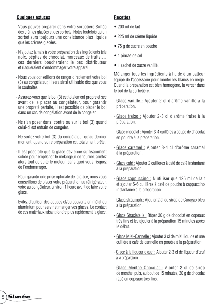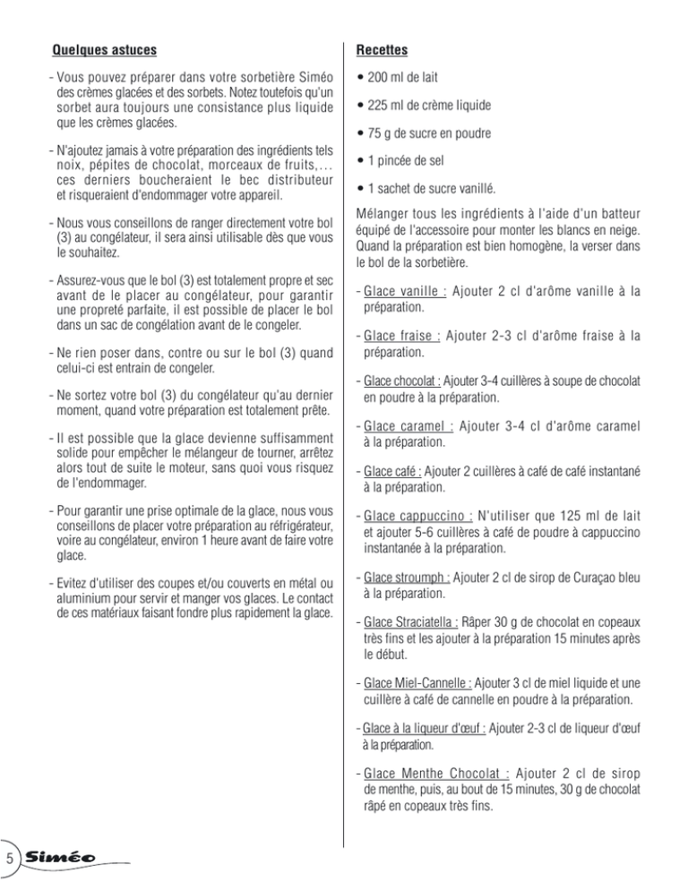 Quelques astuces Recettes - Vous pouvez préparer dans votre sorbetière Siméo des crèmes glacées et des sorbets. Notez toutefois qu'un sorbet aura toujours une consistance plus liquide que les crèmes glacées. • 200 ml de lait - N'ajoutez jamais à votre préparation des ingrédients tels noix, pépites de chocolat, morceaux de fruits,… ces derniers boucheraient le bec distributeur et risqueraient d'endommager votre appareil. • 225 ml de crème liquide • 75 g de sucre en poudre • 1 pincée de sel • 1 sachet de sucre vanillé. - Nous vous conseillons de ranger directement votre bol (3) au congélateur, il sera ainsi utilisable dès que vous le souhaitez. Mélanger tous les ingrédients à l'aide d'un batteur équipé de l'accessoire pour monter les blancs en neige. Quand la préparation est bien homogène, la verser dans le bol de la sorbetière. - Assurez-vous que le bol (3) est totalement propre et sec avant de le placer au congélateur, pour garantir une propreté parfaite, il est possible de placer le bol dans un sac de congélation avant de le congeler. - Glace vanille : Ajouter 2 cl d'arôme vanille à la préparation. - Ne rien poser dans, contre ou sur le bol (3) quand celui-ci est entrain de congeler. - Ne sortez votre bol (3) du congélateur qu'au dernier moment, quand votre préparation est totalement prête. - Il est possible que la glace devienne suffisamment solide pour empêcher le mélangeur de tourner, arrêtez alors tout de suite le moteur, sans quoi vous risquez de l'endommager. - Glace fraise : Ajouter 2-3 cl d'arôme fraise à la préparation. - Glace chocolat : Ajouter 3-4 cuillères à soupe de chocolat en poudre à la préparation. - Glace caramel : Ajouter 3-4 cl d'arôme caramel à la préparation. - Glace café : Ajouter 2 cuillères à café de café instantané à la préparation. - Pour garantir une prise optimale de la glace, nous vous conseillons de placer votre préparation au réfrigérateur, voire au congélateur, environ 1 heure avant de faire votre glace. - Glace cappuccino : N'utiliser que 125 ml de lait et ajouter 5-6 cuillères à café de poudre à cappuccino instantanée à la préparation. - Evitez d'utiliser des coupes et/ou couverts en métal ou aluminium pour servir et manger vos glaces. Le contact de ces matériaux faisant fondre plus rapidement la glace. - Glace stroumph : Ajouter 2 cl de sirop de Curaçao bleu à la préparation. - Glace Straciatella : Râper 30 g de chocolat en copeaux très fins et les ajouter à la préparation 15 minutes après le début. - Glace Miel-Cannelle : Ajouter 3 cl de miel liquide et une cuillère à café de cannelle en poudre à la préparation. - Glace à la liqueur d'œuf : Ajouter 2-3 cl de liqueur d'œuf à la préparation. - Glace Menthe Chocolat : Ajouter 2 cl de sirop de menthe, puis, au bout de 15 minutes, 30 g de chocolat râpé en copeaux très fins. 5 Guide de dépannage Caractéristiques techniques Votre glace est trop liquide ? Avez vous … • Placez le bol réfrigérant au minimum 24 heures au congélateur avant de l'utiliser • Refroidi votre préparation au réfrigérateur ou au congélateur ? Placez votre préparation au réfrigérateur environ 1h avant de faire votre glace. Tension d'utilisation Puissance 230 V ~ 50 Hz 16 W Nota : La garantie est définie sur le bulletin de garantie joint. Elle ne couvre pas l'usure normale. Le fabricant ne peut être tenu responsable de dommages éventuels causés par un usage ou une installation incorrecte, impropre, erronée, déraisonnable, non conforme à la notice, ou par des réparations effectuées par un personnel non qualifié. Appareil destiné à une utilisation exclusivement domestique. • Mis votre sorbetière en marche avant de verser la préparation ? La pale doit tourner lorsque vous versez (doucement) votre préparation • Utilisé plus de lait que la recette le prévoit ? Il est préférable d'augmenter la quantité de crème plutôt que la quantité de lait. • Utilisé suffisamment de crème ? La crème est l'un des ingrédients les plus importants dans la préparation. Il est recommandé de ne pas réduire la quantité de crème indiquée par la recette. • Servi votre glace dans une coupe en métal/aluminium ou avec des couverts en métal/aluminium ? Evitez autant que possible de mettre la glace au contact du métal ou de l'aluminium. • La glace ne s'écoule pas par le distributeur ? • La sorbetière est-elle allumée ? La sorbetière doit être allumée lorsque vous vous servez de la glace • Le bec distributeur est-il ouvert ? La gâchette du bec distributeur doit être descendue pour laisser la préparation s'écouler par le bec. ELECTROPEM Parc d'Activités "Les Découvertes" 8, rue Thomas Edison - CS 51079 - 67452 Mundolsheim Cedex - Tél. 03 88 18 32 00 - Fax 03 88 18 32 04 Internet : www.electropem.com - E-mail : [email protected] Photos non contractuelles • Placé le bol réfrigérant suffisamment longtemps au congélateur ? Notice d’utilisation SORBETIERE GAMME NOSTALGIA DV 903 Vous venez d'acquérir un produit de la gamme Siméo. Ce dernier à été conçu avec soin et à été soumis à de nombreux tests de contrôle. Nous vous remercions de la confiance portée à notre marque et souhaitons que votre appareil vous apporte entière satisfaction. Nous vous demandons de lire attentivement cette notice dans son intégralité avant d'utiliser votre appareil. Conservez-la, vous pourriez avoir besoin de vous y référer dans le futur. Recommandations de sécurité particulières • Laisser le couvercle (4) en place sur le corps supérieur (5) lorsque l'appareil fonctionne. • Ne pas placer les mains ou un ustensile de cuisine quelconque dans le bol quand l'appareil fonctionne. • Ne pas déplacer l'appareil quand il fonctionne. • Ne pas placer dans le bol plus de préparation que le niveau "MAX". 4 2 • Vérifier que rien ne se trouve dans le bol (3) ou dans le bec distributeur avant de fair