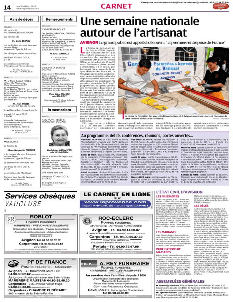 CARNET Jeudi 14 Mars 2013 www.laprovence.com Avis de décès Remerciements R053483 R056226 CABRIÈRES-D’AIGUES LES ANGLES VILLENEUVE-LES-AVIGNON Les familles de M. Emile BERARD ont la douleur de vous faire part de son décès, survenu à l’âge de 85 ans. Les familles ARNOUX, GAUDIN et BONARD, Parents et amis, très touchés par les nombreuses marques de sympathie, d’amitié et leurs envois de fleurs, remercient toutes les personnes qui se sont associées à leur peine lors du décès de Les obsèques civiles auront lieu M. Louis ARNOUX vendredi 15 mars 2013, à 16h P.F. Arniaud - Pertuis 04.90.09.02.02 au cimetière Saint-Véran d’Avignon où l’on se réunira. P.F. Tillier Funérarium Les Angles - 04.90.80.30.30 R056213 M. et Mme Robert TRILLES et leur fils Alexandre, Mme Jacqueline BLAY, sa compagne, Mme Régine TRILLES, sa cousine, M. et Mme Jérôme et Anne Laure BOUQUART, Parents et amis, ont la douleur de vous faire part du décès de M. Jean TRILLES survenu à l’âge de 74 ans La veillée se fera à son domicile samedi 16 mars 2013, à 8h30 R056215 L’ISLE-SUR-LA-SORGUE LAGNES Françoise et Henri-Pierre ARSIEL et leurs enfants, Marie-Claude et Michel ROUBAUD et leurs enfants, Parents et alliés, remercient toutes les personnes qui, par leur présence et leurs messages, se sont associées à leur peine lors du décès de Mme Aline MAHIEU née BOURGET Régie Municipale P.F. Isle-sur-la-Sorgue 04.90.20.67.90 In memoriam R055241 AVIGNON - VEDÈNE ROCHEFORT-DU-GARD suivie de l’inhumation au cimetière de Saint-André de Rocquepertuis dans le tombeau familial. P.F. Roc-Eclerc - Avignon 04.90.14.00.87 Une semaine nationale autour de l’artisanat AVIGNON Le grand public est appelé àdécouvrir "la premièreentreprise deFrance" L a Semaine nationale de l’artisanat (SNA), organisée conjointement par l’Assemblée permanente des chambes de métiers et d’artisanat (APCMA) et l’Union (UPA), se déroulera du 15 au 22 mars. Événement phare destiné à démontrer, s’il le fallait, que l’artisanat est au cœur de la vie quotidienne des Français, la SNA regroupe sous un label commun toutes les initiatives locales de promotion de l’artisanat. Ainsi les artisans qui constituent "la première entreprise de France" proposeront au grand public des événements dans toute la France avec les chambres de métiers et de l’artisanat (CMA) et les organisations professionnelles membres de l’UPA. Le pacte pour l’artisanat, présenté au conseil des ministres du 23 janvier dernier, retient la SNA comme l’un des leviers pour sensibiliser les jeunes aux métiers de l’artisanat. Les événements organisés autour de la formation recevront ainsi le soutien du ministère chargé de l’Artisanat. Fil rouge de cette édition 2013, le thème "Paroles d’artisans" est l´occasion de Le centre de formation des apprentis Florentin-Mouret, à Avignon, ouvrira ses portes à l’occasion de cette semaine nationale de l’artisanat. / PHOTO CYRIL HIÉLY donner la parole à de nombreux chefs d’entreprises artisanales qui, malgré un contexte écono- mique difficile, continuent à porter un message positif aux jeunes Français : il est possible de réussir une carrière professionnelle dans l’artisanat et il y a des métiers qui recrutent. Au programme, défilé, conférences, réunions, portes ouvertes... R056393 Vendredi 15 mars : 14 h 30, défilé de mode "handifashion" organisé par l’APF-résidence Terro flourido & le CFA régional de la CMA 84 ainsi que du FNC Vaucluse et de l’Union professionnelle couture et habillement du Vaucluse. Salle de Champfleury à Avignon (sur invitation). Lundi 18 mars : conférences. 9 h, "méthodologie de la création d’entreprise artisanale" ; 11 h, "l’EIRL" ; 13 h 30, "les obligations comptables, fiscales et sociales" ; 15 h, "la déclaration d’insaisissabilité". CMA 84, chapelle Sainte-Praxède, 35 rue Joseph-Vernet à Avignon. Inscription au 0 04 90 80 65 51. Lundi 18 mars : réunion d’information à 17 h sur "l’accessibilité des commerces de proximité: j’anticipe !" organisée par l’UPA 84. Cité de l’artisanat, 1A chemin de la Rollande, Montfavet. Inscription au 0 07 77 26 32 45. MONTFAVET La famille de Mme Marguerite TRUCHET a la douleur de vous faire part de son décès, survenu à l’âge de 79 ans. Madeleine MARIANETTI née HENNEQUIN vendredi 15 mars 2013, à 10h Un an s’est écoulé depuis ton départ. Tu nous manques beaucoup. Repose en Paix. Michèle, Michel, Danielle, Georges, Valérie, Philippe, Valentin, Séverine, Nathan. au cimetière de Montfavet. Une messe sera dite Cet avis tient lieu de faire-part et de remerciements. dimanche 17 mars 2013, à 10h30 La cérémonie civile aura lieu en l’église Saint-Agricol d’Avignon. P.F. Vallis Clausa Morières - 04.90.33.45.86 Services obsèques VA U C L U S E LES NAISSANCES sur www.laprovence.com sous-onglet: CARNET 38223 - ROBLOT 38217 POMPES FUNEBRES MARBRERIE - PREVOYANCE FUNERAIRE 38210 ROC-ECLERC POMPES FUNEBRES MARBRERIE - ARTICLES FUNERAIRES Organisation des obsèques - Travaux de marbrerie Assistance après obsèques - Articles funéraires Avignon - Tél. 04.90.14.00.87 Nouvelle adresse 375, avenue Frédéric Mistral - Habilitation n° 2008.84.020 Pertuis - Tél. 04.90.79.67.09 www.roblot.fr O.G.F SA au capital de 40.904.385 d - RCS Paris 542 076 799 - Habilitation préfectorale n° 12-75-001 136, avenue Général-Leclerc - Habilitation n° 2004.84.135 Notre mission, vous accompagner La qualité au service des familles PF DE FRANCE POMPES FUNEBRES - MARBRERIE Avignon - 33, boulevard Saint-Ruf 04.90.80.62.62 Habilitation 2005.084.035 Avignon - Rond-point cimetière Saint-Véran MARBRERIE MAUSSAN 04.90.85.48.20 Carpentras - 705, avenue Victor-Hugo 04.90.63.38.06 Habilitation 2005.84.072 Carpentras - CHAMBRE FUNÉRAIRE 503, chemin de la Sainte-Famille Dévouement - Dignité - Disponiblité... Jean-Charles Aubert, responsable de salle à Aurélia N’G