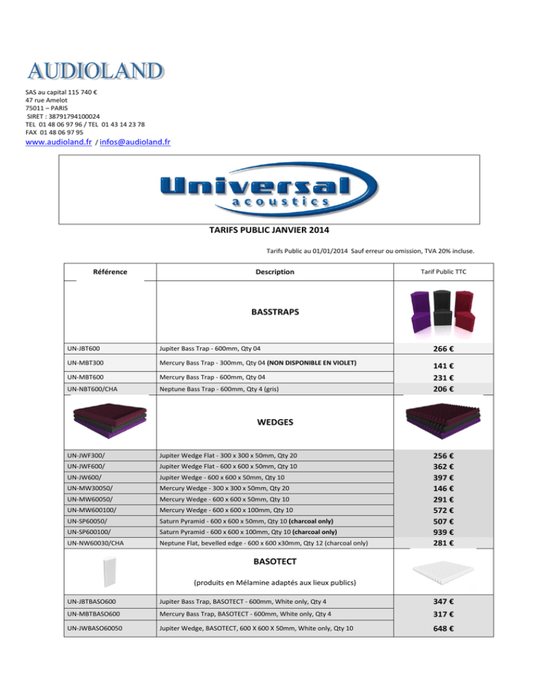 SAS au capital 115 740 € 47 rue Amelot 75011 – PARIS SIRET : 38791794100024 TEL 01 48 06 97 96 / TEL 01 43 14 23 78 FAX 01 48 06 97 95 www.audioland.fr / [email protected] TARIFS PUBLIC JANVIER 2014 Tarifs Public au 01/01/2014 Sauf erreur ou omission, TVA 20% incluse. Référence Description Tarif Public TTC BASSTRAPS UN-JBT600 Jupiter Bass Trap - 600mm, Qty 04 266 € UN-MBT300 Mercury Bass Trap - 300mm, Qty 04 (NON DISPONIBLE EN VIOLET) UN-MBT600 Mercury Bass Trap - 600mm, Qty 04 UN-NBT600/CHA Neptune Bass Trap - 600mm, Qty 4 (gris) 141 € 231 € 206 € WEDGES UN-JWF300/ Jupiter Wedge Flat - 300 x 300 x 50mm, Qty 20 UN-JWF600/ Jupiter Wedge Flat - 600 x 600 x 50mm, Qty 10 UN-JW600/ Jupiter Wedge - 600 x 600 x 50mm, Qty 10 UN-MW30050/ Mercury Wedge - 300 x 300 x 50mm, Qty 20 UN-MW60050/ Mercury Wedge - 600 x 600 x 50mm, Qty 10 UN-MW600100/ Mercury Wedge - 600 x 600 x 100mm, Qty 10 UN-SP60050/ Saturn Pyramid - 600 x 600 x 50mm, Qty 10 (charcoal only) UN-SP600100/ Saturn Pyramid - 600 x 600 x 100mm, Qty 10 (charcoal only) UN-NW60030/CHA Neptune Flat, bevelled edge - 600 x 600 x30mm, Qty 12 (charcoal only) 256 € 362 € 397 € 146 € 291 € 572 € 507 € 939 € 281 € BASOTECT (produits en Mélamine adaptés aux lieux publics) UN-JBTBASO600 Jupiter Bass Trap, BASOTECT - 600mm, White only, Qty 4 347 € UN-MBTBASO600 Mercury Bass Trap, BASOTECT - 600mm, White only, Qty 4 317 € UN-JWBASO60050 Jupiter Wedge, BASOTECT, 600 X 600 X 50mm, White only, Qty 10 648 € UN-MWBASO60050 Mercury Wedge, BASOTECT - 600 x 600 x 50mm, White only, Qty 10 432 € UN-MWBASO600100 Mercury Wedge, BASOTECT - 600 x 600 x 100mm, White only, Qty 10 723 € UA/MD-EPS300 UA Mercury Diffusor [EPS 300 x 300mm] Qty 20 UA/MD-EPS600 UA Mercury Diffusor [EPS 600 x 600mm] Qty 10 DIFFUSEURS 176 € 291 € ECLIPSE ECLIPSE PANEL Lot de 4 panneaux Eclipse [600 x 900 x 25mm] Panneau en fibre de verre – ClassA antifeu – Finition Suédine 723 € Couleurs disponibles : Burgundy-271, Navy Blue-286, Light Brown-270, Aubergine-284 600mm x 900mm x 50mm EPS Frame – Suede Fabric Wrapped : Lot de 2 397 € ECLIPSE Bass Trap 600 600mm x 370mm x 175mm Foam Base – 25mm Fibre Glass Beveled Face : Lot de 4 773 € ECLIPSE Bass Trap 900 900mm x 370mm x 175mm Foam Base – 25mm Fibre Glass Beveled Face : Lot de 4 823 € ECLIPSE Diffuser COLLE pour pose UA/GLUE-CF UA Cosmic Fluid - 380ml cartouche colle UA/GLUE-SM UA Space Mist - 500ml Colle en Spray 16 € 20 € SOLAR SYSTEMS KITS MERCURY Tous les Kits sont accompagnés de leur notice de montage. [SOLAR SYSTEM] Pluto 24 x MW30050, 1 x Space Mist 500ml UN-SSP/ UA [SOLAR SYSTEM] Pluto – Uniquement en GRIS 141 € [SOLAR SYSTEM] Mercury 1 20x Wedge 300 50mm 2x Bass Trap 300 2x Tubes Colle Cosmic Fluid UA/SS-M1 UA [SOLAR SYSTEM] Mercury 1 241 € [SOLAR SYSTEM] Mercury 2 40x Wedge 300 50mm 4x Bass Trap 300 4x Tubes Colle Cosmic Fluid UA/SS-M2 UA [SOLAR SYSTEM] Mercury 2 472 € [SOLAR SYSTEM] Mercury 3 20x Wedge 600 50mm 4x Bass Trap 600 6x Tubes Colle Cosmic Fluid UA/SS-M3 UA [SOLAR SYSTEM] Mercury 3 828 € [SOLAR SYSTEM] Mercury 4 20x Wedge 300 50mm 30x Wedge 600 50mm 4x Bass Trap 600 4x Bass Trap 300 10x Tubes Colle Cosmic Fluid UA/SS-M4 UA [SOLAR SYSTEM] Mercury 4 1 335 € [SOLAR SYSTEM] Mercury 5 40x Wedge 600 50mm 8x Bass Trap 600 4x Bass Trap 300 12x Tubes Colle Cosmic Fluid UA/SS-M5 UA [SOLAR SYSTEM] Mercury 5 1 766 € [SOLAR SYSTEM] Mercury 6 40x Wedge 300 50mm 40x Wedge 600 50mm 8x Bass Trap 600 4x Bass Trap 300 13x Tubes Colle Cosmic Fluid UA/SS-M6 UA [SOLAR SYSTEM] Mercury 6 2 153 € 14 x MW30050, 6 x MDEPS300, 1 x Space Mist, 1 x Cosmic Fluid UN-MCK1 196 € Mercury Cluster Kit 20 x JWF30050, 6 x MDEPS300, 1 x Space Mist, 1 x Cosmic Fluid UN-JCK1 UN-SSN2/ UN-SSN3/ 346 € Jupiter Cluster Kit SOLAR SYSTEM Neptune 2 - 10 x NW60030, 2 x NBT600, 2 x Space Mist 500ml (charcoal only) SOLAR SYSTEM Neptune 3 - 20 x NW60030, 4 x NBT600, 2 x Space Mist 500ml (charcoal only) 357 € 678 € VIBRO PADS Supports d’enceintes VIS-PADS UA Vibro-Pads Compact 44 €