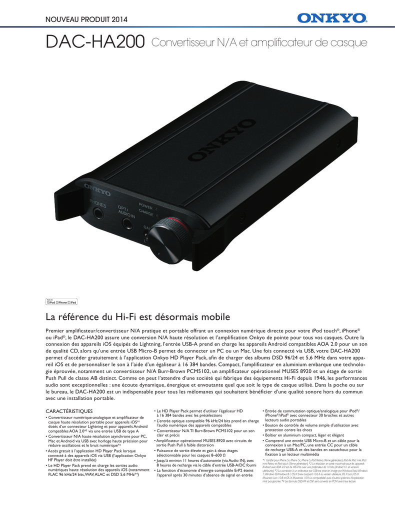 NOUVEAU PRODUIT 2014 DAC-HA200 Convertisseur N/A et amplificateur de casque La référence du Hi-Fi est désormais mobile Premier amplificateur/convertisseur N/A pratique et portable offrant un connexion numérique directe pour votre iPod touch®, iPhone® ou iPad®, le DAC-HA200 assure une conversion N/A haute résolution et l’amplification Onkyo de pointe pour tous vos casques. Outre la connexion des appareils iOS équipés de Lightning, l’entrée USB-A prend en charge les appareils Android compatibles AOA 2.0 pour un son de qualité CD, alors qu’une entrée USB Micro-B permet de connecter un PC ou un Mac. Une fois connecté via USB, votre DAC-HA200 permet d’accéder gratuitement à l’application Onkyo HD Player Pack, afin de charger des albums DSD 96/24 et 5,6 MHz dans votre appareil iOS et de personnaliser le son à l’aide d’un égaliseur à 16 384 bandes. Compact, l’amplificateur en aluminium embarque une technologie éprouvée, notamment un convertisseur N/A Burr-Brown PCM5102, un amplificateur opérationnel MUSES 8920 et un étage de sortie Push Pull de classe AB distinct. Comme on peut l’attendre d’une société qui fabrique des équipements Hi-Fi depuis 1946, les performances audio sont exceptionnelles : une écoute dynamique, énergique et envoutante quel que soit le type de casque utilisé. Dans la poche ou sur le bureau, le DAC-HA200 est un indispensable pour tous les mélomanes qui souhaitent bénéficier d’une qualité sonore hors du commun avec une installation portable. CARACTÉRISTIQUES • Convertisseur numérique-analogique et amplificateur de casque haute résolution portable pour appareils iOS*1 dotés d’un connecteur Lightning et pour appareils Android compatibles AOA 2.0*2 via une entrée USB de type A • Convertisseur N/A haute résolution asynchrone pour PC, Mac et Android via USB avec horloge haute précision pour réduire oscillations et le bruit numérique*3 • Accès gratuit à l’application HD Player Pack lorsque connecté à des appareils iOS via USB (l’application Onkyo HF Player doit être installée) • Le HD Player Pack prend en charge les sorties audio numériques haute résolution des appareils iOS (notamment FLAC 96 kHz/24 bits, WAV, ALAC et DSD 5,6 MHz*4) • Le HD Player Pack permet d’utiliser l’égaliseur HD à 16 384 bandes avec les présélections • L’entrée optique compatible 96 kHz/24 bits prend en charge l’audio numérique des appareils compatibles • Convertisseur N/A TI Burr-Brown PCM5102 pour un son clair et précis • Amplificateur opérationnel MUSES 8920 avec circuits de sortie Push Pull à faible distorsion • Puissance de sortie élevée et gain à deux étages sélectionnable pour les casques 8–600 Ω • Jusqu’à environ 11 heures d’autonomie (via Audio IN), avec 8 heures de recharge via le câble d’entrée USB-A/DC fourni • La fonction d’économie d’énergie compatible ErP2 éteint l’appareil après 30 minutes d’absence de signal en entrée • Entrée de commutation optique/analogique pour iPod®/ iPhone®/iPad® avec connecteur 30 broches et autres lecteurs audio portables • Bouton de contrôle de volume simple d’utilisation avec protection contre les chocs • Boîtier en aluminium compact, léger et élégant • Comprend une entrée USB Micro-B et un câble pour la connexion à un Mac/PC, une entrée CC pour un câble de recharge USB-A et des bandes en caoutchouc pour la fixation à un lecteur multimédia *1 Certifié pour iPhone 5s, iPhone 5c, iPhone 5, iPad Retina (4ème génération), iPad Air, iPad mini, iPad mini Retina et iPod touch (5ème génération). *2 La résolution en sortie maximale pour les appareils Android avec AOA 2.0 est de 48 kHz avec une profondeur de 16 bits (Android 4.1 et versions ultérieures). *3 La connexion à un ordinateur par USB est prise en charge par Windows Vista,Windows 7,Windows 8,Windows 8.1, OS X Snow Leopard 10.6.4 ou version ultérieure, OS X Lion, OS X Mountain Lion 10.8 et OS X Mavericks 10.9. La compatibilité avec d’autres systèmes d’exploitation n’est pas garantie. *4 Les formats DSD-IFF et DSF sont convertis en PCM avant leur lecture. DAC-HA200 Convertisseur N/A et amplificateur de casque Un convertisseur N/A haute résolution et amplificateur entièrement portable pour iOS Le DAC-HA200 le premier amplificateur/convertisseur N/A pour casque permettant une connexion numérique directe par USB à votre appareil iOS équipés de Lightning. Il suffit de brancher votre iPhone®, iPod touch® ou iPad® dans l’entrée USB-A de l’amplificateur à l’aide d’un câble Lightning classique et d’accéder à votre application gratuite HD Player Pack pour écouter vos albums FLAC 96 kHz/24 bits, WAV et DSD 5,6 MHz avec une conversion numérique/analogique remarquable et avec l’amplification Onkyo.Vous pouvez désormais profiter de la profondeur et la clarté de la musique haute résolution où que vous soyez, à tout moment. Et, cerise sur le gâteau, vous pouvez utiliser votre téléphone ou votre tablette en cours d’écoute. Profitez du son sans perte d’Android Connectez votre appareil Android compatible AOA 2.0 à l’entrée USB-A pour expérimenter immédiatement un son numérique direct de qualité CD, alors que le DAC-HA200 effectue une conversion N/A via le transfert USB asynchrone. L’amplificateur peut recevoir et amplifier la musique numérique enregistrée dans les téléphones et tablettes Android à une résolution maximale de 48 kHz/16 bits, pour un son Hi-Fi exceptionnel, tout en vous permettant de continuer à l’utiliser pour d’autres tâches. La puissance et l’énergie de l’amplification Onkyo Onkyo se targue de plus de 65 années d’expérience dans la fabrication des meilleurs équipements audio Hi-Fi au monde. Cet héritage prend tout son sens au moment même où vous branchez votre casque au DAC-HA200. Un amplificateur opérationnel MUSES 8920 classique est combiné à des circ