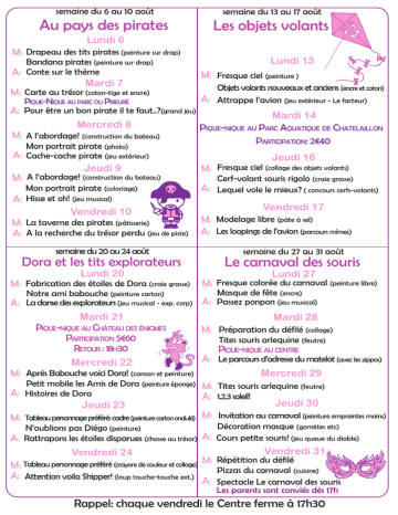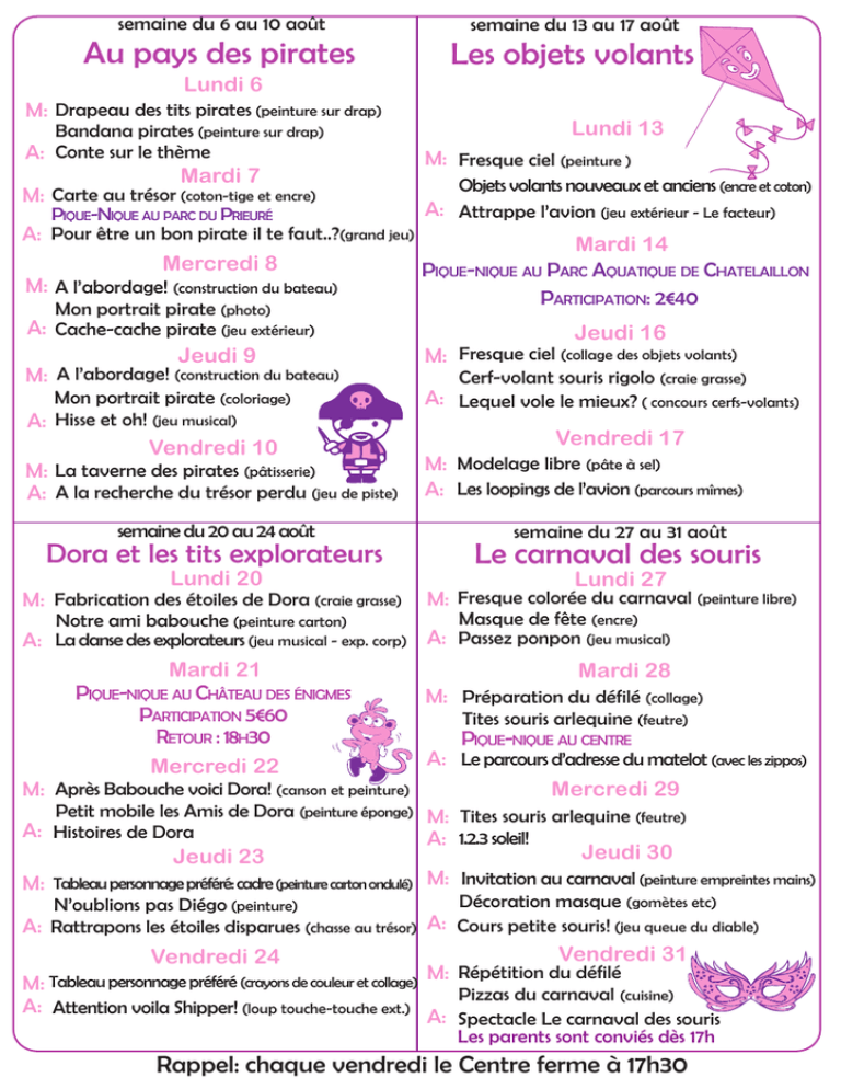 semaine du 6 au 10 août semaine du 13 au 17 août Au pays des pirates Les objets volants Lundi 6 M: Drapeau des tits pirates (peinture sur drap) Bandana pirates (peinture sur drap) A: Conte sur le thème Mardi 7 M: Carte au trésor (coton-tige et encre) PIQUE-NIQUE AU PARC DU PRIEURÉ Lundi 13 M: Fresque ciel (peinture ) Objets volants nouveaux et anciens (encre et coton) A: Attrappe l’avion (jeu extérieur - Le facteur) A: Pour être un bon pirate il te faut..?(grand jeu) Mardi 14 Mercredi 8 PIQUE-NIQUE AU PARC AQUATIQUE DE CHATELAILLON M: A l’abordage! (construction du bateau) PARTICIPATION: 2€40 Mon portrait pirate (photo) A: Cache-cache pirate (jeu extérieur) Jeudi 16 Jeudi 9 M: Fresque ciel (collage des objets volants) M: A l’abordage! (construction du bateau) Cerf-volant souris rigolo (craie grasse) Mon portrait pirate (coloriage) A: Lequel vole le mieux? ( concours cerfs-volants) A: Hisse et oh! (jeu musical) Vendredi 17 Vendredi 10 M: Modelage libre (pâte à sel) M: La taverne des pirates (pâtisserie) A: A la recherche du trésor perdu (jeu de piste) A: Les loopings de l’avion (parcours mîmes) semaine du 20 au 24 août Dora et les tits explorateurs Lundi 20 M: Fabrication des étoiles de Dora (craie grasse) semaine du 27 au 31 août Le carnaval des souris Lundi 27 M: Fresque colorée du carnaval (peinture libre) Notre ami babouche (peinture carton) Masque de fête (encre) N’oublions pas Diégo (peinture) Décoration masque (gomètes etc) A: La danse des explorateurs (jeu musical - exp. corp) A: Passez ponpon (jeu musical) Mardi 21 Mardi 28 PIQUE-NIQUE AU CHÂTEAU DES ÉNIGMES M: Préparation du défilé (collage) PARTICIPATION 5€60 Tites souris arlequine (feutre) RETOUR : 18H30 PIQUE-NIQUE AU CENTRE A: Le parcours d’adresse du matelot (avec les zippos) Mercredi 22 M: Après Babouche voici Dora! (canson et peinture) Mercredi 29 Petit mobile les Amis de Dora (peinture éponge) M: Tites souris arlequine (feutre) A: Histoires de Dora A: 1.2.3 soleil! Jeudi 30 Jeudi 23 M: Tableau personnage préféré: cadre (peinture carton ondulé) M: Invitation au carnaval (peinture empreintes mains) A: Rattrapons les étoiles disparues (chasse au trésor) A: Cours petite souris! (jeu queue du diable) Vendredi 31 Vendredi 24 Répétition du défilé M: M: Tableau personnage préféré (crayons de couleur et collage) Pizzas du carnaval (cuisine) A: Attention voila Shipper! (loup touche-touche ext.) A: Spectacle Le carnaval des souris Les parents sont conviés dès 17h Rappel: chaque vendredi le Centre ferme à 17h30 semaine du 6 au 10 août semaine du 13 au 17 août La famille Pirate! Explorons la savane! Lundi 6 M: A: La famille Pirate (peinture) Chapeau de pirate (feutre) «La famille Pirate» (conte) Mardi 7 M: A: M: Chapeau de pirate (collage) PIQUE-NIQUE AU PARC DU PRIEURÉ «Pour être un bon pirate, il te faut..?» (jeu) Mercredi 8 A: La famille pirate (collage) Bateau sur l’eau (peinture) Cache-cache pirate! (jeu extérieur) M: A: Bateau sur l’eau (accessoires et drapeau) Le relais des pirates (parcours d’adresse) Jeudi 9 Vendredi 10 M: Les cookies du pirate (pâtisserie) A: A la recherche du pirate! (jeu de piste) Lundi 13 M: A: Mardi 14 PIQUE-NIQUE AU PARC AQUATIQUE DE CHATELAILLON PARTICIPATION 2€40 Jeudi 16 M: Lili la girafe (contours au crayon) Tableau de la savane (atelier écriture) A: La course aux lions (parcours d’adresse) Vendredi 17 M: A: semaine du 20 au 24 août Les Zippos marins Lundi 20 A: Dino le dinosaure (peinture) Oeufs de dino (papier mâché) «Le gentil dinaosaure» (conte) Mardi 21 PIQUE-NIQUE AU CHÂTEAU DES ÉNIGMES PARTICIPATION 5€60 RETOUR : 18H30 Mercredi 22 M: A: Dino le dinosaure (finition) Oeuf de dino (peinture) Le dino glacé (jeu extérieur) Jeudi 23 M: A: Dino de serviette (peinture et bricolage) Les oeufs musicaux (jeu musical) M: A: Cakes aux fruits (pâtisserie) «Dino à perdu ses fruits!» (jeu de piste) Vendredi 24 Masques lion et singe (craie grasse, crayon de couleurs) La danse de la jungle (expression corporelle) semaine du 27 au 31 août Dino le dinosaure! M: Lili la girafe (peinture) Tableau de la savane (diverses techniques) Lions, girafes, éléphants (jeu extérieur) M: A: Lundi 27 Le Santiano (peinture) Invitation spectacle (découpage) La danse des marins (expression corporelle) Mardi 28 M: Invitation spectacle (collage) Mobile baleine (peinture) A: Le parcours du matelot (parcours d’adresse) M: A: Mobile baleine (collage, assemblage) Dauphin-dauphine (jeu extérieur) PIQUE-NIQUE AU CENTRE Mercredi 29 Jeudi 30 M: Bateaux, poissons et Cie (pâte à sel) A: Poissons-pêcheurs (jeu extérieur) Vendredi 31 M: Histoires autour de la mer A: Concours de dessins Spectacle les Zippos marins! PARENTS CONVIÉS DÈS 17H! Rappel: chaque vendredi le Centre ferme à 17h30 semaine du 6 au 10 août Les Croco’s en rythme! M: A: M: A: M: A: semaine du 13 au 17 août Les naufragés de CrocoLanta!! Lundi 6 Lundi 13 Les idées fusent M: Les idées fusent Fresque notes de musique Fabrication des radeaux par équipe «Au village de Saint-Phonie (conte) Île mystérieuse (décor géant) Kim musical et «N’oubliez pas les paroles!» A: Radeau tour (parcours d’adresse) Mardi 7 Mardi 14 Préparation de la chanson «Saint-Phonie des Croco’s» Fresque «la valse des notes» (peinture) PIQUE-NIQUE AU PARC AQUATIQUE DE CHATELAILLON Visite de l’école de musique Sainte-Cécile PARTICIPATION 2€40 L’attrape-note (balle américaine) Mercredi 8 «Saint-Phonie des Croco’s» Jeudi 16 Fresque «la valse des notes» (collage) M: Création Totem (pour jeu Chip chip totem) Activité définie par les enfants Île mystérieuse (finition décor géant) Jeudi 9 A: CrocoLanta (Olympiades) PIQUE-NIQUE AU PARC FRANCK DELMAS «LES OISEAUX CHANTEURS» (JEUX CO) Vendredi 10 M: Répétition chant Un mot, une chanson (jeu expression orale) A: Représentation devant les enfants semaine du 20 au 24 août L’horloge tourne: voyage dans le temps L