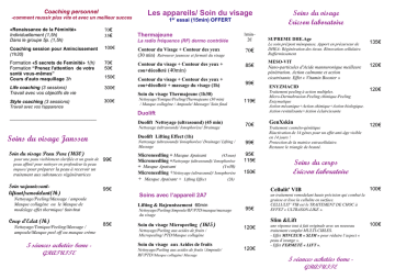 Coaching personnel -comment reussir plus vite et avec un meilleur succes Les appareils/ Soin du visage 1er essai (15min) OFFERT «Renaissance de la Féminité» Individuellement (1,5h) Dans le groupe 5p. (1,5h) 70€ 35€ Coaching session pour Amincissement (1h30) 100€ Contour du Visage + Contour des yeux (30 min) Retrouver jeunesse et fermeté du visage 70€ Formation «5 secrets de Feminité» 1(h) Formation “Prenez l'attention de votre santé vous-mêmes” Cours d'auto maquillage 3h 70€ 50€ Contour du visage + Contour des yeux + cou+décolleté (40min) 85€ Life coaching (3 sessions) Travail avec vos objectifs de vie 300€ Contour du visage + Contour des yeux + cou+décolleté + massage du visage (1h) 99€ Style coaching (3 sessions) 300€ 150€ Thermajeune La radio fréquence (RF) dermo contrôlée 1min– 2€ Soin du visage Thermajeune (1h30) Travail avec vos l'apparence Nettoyage/Tonique/Peeling/Thermajeune (30 min) / Masque collagène / Ampoule/ Massage/ Soin final 119€ Duolift _____________________________________ Duolift Nettoyage (ultrasound) (45 min) 70€ Nettoyage (ultrasound)/ Ionophorèse/ Drainage Soins du visage Janssen Soin du visage Peau Pure (1h30) pour une peau visiblement clarifiée et un grain de peau affiné/ pour nettoyer en profondeur la peau impure/ pour préparer la peau à recevoir un Duolift Lifting Effect (1h) 99€ traitement aux substances régénératrices Soin rajeunissantliftant/remodelant(1h) Nettoyage/Tonique/Peeling/Massage / ampoule/Masque peel off ou masque crème 5 séances achetées 6eme GRATUITE 99€ Microneedling + Masque Apaisant (45мин) Microneedling +Nettoyage (ultrasound)/ Ionophorèse + Masque Apaisant (1ч30) Microneedling +Nettoyage (ultrasound)/ Ionophorèse 95€ 115€ + Masque Apaisant + Lifting Effect 150€ Le soin pré/post ménopause. Apport en précurseur de DHEA- Régénération des tissus. Rénovation cellulaire. Raffermissement Lifting & Rajeunissement 60min Nettoyage/Peeling/Ampoule/RF/PTD/masque/massage du visage Soin du visage Micropeeling (1h15) Nettoyage/Peeling aux acides de fruits / Micropeeling/ PTD/Masque collagène Soin du visage aux Acides de fruits Nettoyage/Peeling aux acides de fruits /Ampoule/ RF/PTD//Masque collagène/ Massage 135€ MESO-VIT Nano-particules d'Acide mannuronique meilleure pénétration. Action calmante et action cicatrisante. Effet « Vitamin Booster » 120€ ENYZMACID 120€ Traitement peeling à action multiples. Micro-Dermabrasion-Peeling chimique-Peeling Enzymatique Action mécanique+Action chimique+Action biologique. Action revitalisante+Action éclaircissante GenXskin Traitement cosméto-génétique Réactivation de 14 gènes pour un effet anti-âge visible en 14 jours ! Protection de la matrice extracellulaire. Restaure le triangle de beauté. 120€ Soins du corps Ericson laboratoire 100€ Cellulit' VIB Soins avec l’appareil 2A7 85€ SUPREME DHE.Age (2h) 95€ Nettoyage/Peeling/Massage / ampoule Masque collagène ou le Masque de modelage effet thermique/ Soin final Coup d’Eclat (1h) Nettoyage (ultrasound)/ Ionophorèse/ Drainage/ Lifting / Massage Soins du visage Ericson laboratoire 95€ un traitement remodelant haute précision qui combat la graisse et lisse la cellulite en surface. CELLULIT’ VIB est le TRAITEMENT DE CHOC à EFFET « ULTRASON-LIKE ». Slim &Lift 120€ 120€ une réponse tout à fait originale avec un nouveau traitement complet MULTI-CIBLES. - Effet MINCEUR « SLIM » pour réduire l’aspect « peau d’orange ». - Effet FERMETÉ « LIFT ». 5 séances achetées 6eme GRATUITE 100€ Soins du corps Soins des mains Manucure + vernis permanent+dépose Manucure, pose de vernis Rituel «Bordeaux»/«Thé vert»/«Algue» 2h00 La thérapie pour un moment de plaisir intense. Un soin vitalisant-tonifiant-rajeunissant-antioxydant-pour mobiliser le métabolisme. Des substances précieuses d’origine naturelle. (gommage, massage du corp (40min), enveloppement corporelle). 150€ 70€ 95€ 100€ 35€ Massage 150€ 90€ 75€ 50€ Massage du corps (60min.) à 4 mains Massage du corps (60min.) Massage du corps (45min.) Massage du dos (30min) Type de massage Relaxant/ Anticellulite/ Massage au miel/ Sportif Soins du corps avec l’appareille 2A7 Phototherapie Dynamique (PTD) 1min- Amincissement/Anti-Cellulite/ Raffermissement Drainage Optique/ Vergetures (60min) Depressothérapie+RF+massage Amincissement/ Anti-Cellulite/ Raffermissement Drainage Optique/Vergetures (90min) Depressothérapie+RF+massage+PDT Biostimulation (12 min) 1,5€ 90€ Corps (20-60min.) Pédicure + pose de vernis permanent + dépose Pédicure 95 € 65 € 65 € 70€ 50 € bain pour les pieds aux algues antimycosique, pédicure, gommage micronisé, massage, masque Pédicure + pose de vernis Vinylux 60€ Épilation Lèvres / Sourcils/ Menton Demi-jambes / Bras ¾ jambes Jambes entières Aisselles Maillot Maillot échancré Maillot intégral 12 € 27 € 35 € 45 € 15 € 25 € 35 € 40 € 60 € 60 € 120€ 25€ Prestations Spécifiques Teinture de cils Teinture de sourcils Permanente de cils Maquillage 1min 2€ Centre de Beauté «Prestige» Nos tarifs Tous les prix sont en euros, TTC. Heure d’ouverture du lundi au samedi 10.00-19.00 (non stop) Épilation pour Les Messieurs Dos Torse Soins du corps avec l’appareil Thermajeune Pour en finir avec la cellulite et les rondeurs Pose de faux ongles Pose de gel sur ongles naturels Remplissage Soins des pieds Nettoyage/Tonique/Peeling/Massage / ampoule/Masque peel off ou masque crème “Mer morte”/ “Brittani“ Universal Contour Wrap Envelopement + massage (30min) Gommage Réveillez votre personnalité Manucure, gommage instantané, massage +Soin du visage Coup d’Eclat (1h) Enveloppement corporel (1h15) 55 € 37 € 5, rue Jean-Pierre Sauvage, L-2514, Kirchberg, Luxembourg Tel. 26 00 84 10 20€ 15€ 50€ 30€ [email protected] Prenez vos rendez-vous par Internet www.prestigelook.com