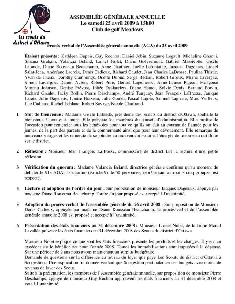 ASSEMBLÉE GÉNÉRALE ANNUELLE Le samedi 25 avril 2009 à 15h00 Club de golf Meadows Procès-verbal de l’Assemblée générale annuelle (AGA) du 25 avril 2009 Étaient présents : Kathleen Dupuis, Guy Rochon, Daniel Jobin, Suzanne Legault, Micheline Ghaoui, Shauna Graham, Valancia Béland, Lionel Nolet, Diane Guèvremont, Gabriel Massicotte, Gisèle Lalonde, Diane Rousseau Beauchamp, Anne Gauthier, Joelle Lafontaine, Jacques Dagenais, Lionel Saint-Jean, Andréane Lacroix, Denis Cadieux, Richard Gaudet, Jean Charles LaBrosse, Pauline Thistle, Yvan de Theux, Dorothy Cummings, Odette Dubuc, Serge Bédard, Robert Giroux, Miane Lavergne, Simon Lavergne, Daniel Aubin, Robert Pitre, Gérard Lajeunesse, Anne-Louise Pigeon, Françoise Moreau Johnson, Denise Prévost, Johée Deslauriers, Diane Hamel, Sylvie Denis, Bernard Potvin, Richard Gaudet, Jacky Rollin, Pierre Deschamps, André Tanguay, Jean François LaBrosse, Janique Lajoie, Julie Dagenais, Louise Brazeau, Julie Goulet, Pascal Lajoie, Samuel Lapierre, Marc Veilleux, Luc Cadieux, Rachel Leblanc, Robert Savage, Nicole Chartrand. 1 Mot de bienvenue : Madame Gisèle Lalonde, présidente des Scouts du district d'Ottawa, souhaite la bienvenue à tous et à toutes. Elle présente les membres du conseil d’administration. Elle profite de l'occasion pour remercier tous les bénévoles pour tout ce qu’ils ont fait au courant de l’année pour les jeunes, de la part des parents et de la communauté ainsi que pour leur dévouement. Elle remarque de nouveaux visages et les remercie de se joindre au mouvement scout et l’énergie de renouveau qui flotte sur le district. 2 Réflexion : Monsieur Jean François LaBrosse, commissaire de district fait la lecture d’une petite réflexion. 3 Vérification du quorum : Madame Valancia Béland, directrice générale confirme qu'au moment de débuter le 91e AGA., le quorum (Article 9) de 50 personnes, représentant au moins cinq groupes, est respecté. 4 Lecture et adoption de l'ordre du jour : Sur proposition de monsieur Jacques Dagenais, appuyé par madame Diane Rousseau Beauchamp, l'ordre du jour proposé est accepté à l'unanimité. 5 Adoption du procès-verbal de l’assemblée générale du 26 avril 2008 : Sur proposition de Monsieur Denis Cadieux, appuyée par madame Diane Rousseau Beauchamp, le procès-verbal de l’assemblée générale annuelle 2008 est proposé et accepté à l’unanimité. 6 Présentation des états financiers au 31 décembre 2008 : Monsieur Lionel Nolet, de la firme Marcil Lavallée présente les états financiers au 31 décembre 2008 des Scouts du district d’Ottawa. Monsieur Nolet explique ce que sont les états financiers présente les produits et les changes. Il y eut un excédent sur le bénéfice net pour l’année 2008. Toutes les immobilisations sont imputées à la dépense. Sur une période de 2 ans nous avons maintenant un surplus budgétaire. Demande de questions sur la différence au niveau du loyer que paye Les Scouts du district d’Ottawa à Scogestion. Une explication fut donnée voulant que Scogestion peut balancer ces budgets avec moins de revenus de loyer des Scout. Suite à la présentation, les membres de l’Assemblée générale annuelle, sur proposition de monsieur Pierre Deschamps, appuyé de monsieur Guy Rochon approuvent les états financiers au 31 décembre 2008 et voté à l’unanimité. 7 Désignation des vérificateurs : Sur proposition de monsieur Pierre Deschamps, appuyés par madame Louise Brazeau, les membres de l'Assemblée générale sont d'accord, à l’unanimité, avec le choix de la firme Marcil Lavallée à titre de vérificateur pour la prochaine année. 8 Rapport du président du Conseil d'administration : Le président monsieur Pierre Deschamps souhaite la bienvenue à tous et remercie tous les bénévoles. Cette année nous avons beaucoup rebâti un niveau de différents systèmes. Il a beaucoup de gros dossiers qui aboutissent lors de cet AGA. Beaucoup de projets sont évolutifs dont les règlements généraux en s’alignant sur le palier national. Lors de l’atelier sur la vision et la mission de notre district ont découlé la planification stratégique et opérationnelle. Ce plan est disponible à tous les membres qui voudraient en avoir une copie. Le changement de nom est un dossier qui suit depuis de longues années, lors de ce présent AGA une proposition sera faite. Beaucoup de défis nous attendent pour l’an prochain et nous recherchons encore un trésorier. Au cours de l’année nous en avions trouvé une et plusieurs dossiers fut redressés et cette personne nous a quitté. Au niveau du palier national, une analyse de l’effectif nous fut présentée. Un facteur marquant était que nous perdons plus de 60 % de jeunes par année et on baisse de 10 %. Donc ce n’est pas un problème de recrutement, mais de rétention. Afin de rendre le scoutisme excitant, il est de notre devoir localement et au niveau du district de rendre la tâche plus simple. Nous aimerions améliorer le fonctionnement de la fondation et maximiser le camp Awacamenj Mino afin d’être le mieux utilisés possible. 9 Ratification des actes des administrateurs pour l’exercice se terminant le 31 décembre 2008 : Sur proposition de monsieur Gabriel Massicotte et appuyé par madame Janique Lajoie, les membres de l’assemblée générale accepte à l’unanimité, la ratification des actes des administrateurs et administratrices pour la période du 1er janvier au 31 décembre 2008. 10 Proposition du changement de nom du district : Il est proposée par madame Diane Guèvremont et appuyée par madame Joëlle Lafontaine que Les Scouts du district d’Ottawa soit changé pour les Scouts du district de l’Est de l’Ontario. 7 personnes contre la proposition Amendement : Il est proposé par monsieur Daniel Jobin et appuyée par madame Françoise Moreau Johnson que le nom soit Scout de l’Est de l’Ontario. 5 personnes contre la proposition. Plusi