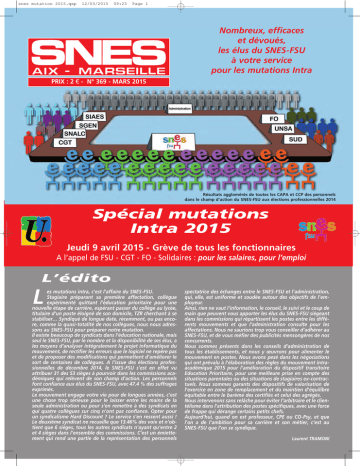 snes mutation 2015.qxp 12/03/2015 09:23 Page 1 Nombreux, efficaces et dévoués, les élus du SNES-FSU à votre service pour les mutations Intra PRIX : 2 € - N° 369 - MARS 2015 Résultats agglomérés de toutes les CAPA et CCP des personnels dans le champ d’action du SNES-FSU aux élections professionnelles 2014 Spécial mutations Intra 2015 Jeudi 9 avril 2015 - Grève de tous les fonctionnaires A l’appel de FSU - CGT - FO - Solidaires : pour les salaires, pour l’emploi L’édito L es mutations intra, c'est l'affaire du SNES-FSU. Stagiaire préparant sa première affectation, collègue expérimenté quittant l'éducation prioritaire pour une nouvelle étape de carrière, espérant passer du collège au lycée, titulaire d'un poste éloigné de son domicile, TZR cherchant à se stabiliser… Syndiqué de longue date, récemment, ou pas encore, comme la quasi-totalité de nos collègues, nous nous adressons au SNES-FSU pour préparer notre mutation. Il existe beaucoup de syndicats dans l'éducation nationale, mais seul le SNES-FSU, par le nombre et la disponibilité de ses élus, a les moyens d’analyser intégralement le projet informatique du mouvement, de rectifier les erreurs que le logiciel ne repère pas et de proposer des modifications qui permettent d'améliorer le sort de centaines de collègues. A l'issue des élections professionnelles de décembre 2014, le SNES-FSU s'est en effet vu attribuer 31 des 53 sièges à pourvoir dans les commissions académiques qui relèvent de son champ d'action. Les personnels font confiance aux élus du SNES-FSU, avec 47.4 % des suffrages exprimés. Le mouvement engage votre vie pour de longues années, c'est une chose trop sérieuse pour le laisser entre les mains de la seule administration ou pour s'en remettre à des syndicats en qui quatre collègues sur cinq n'ont pas confiance. Opter pour un syndicalisme Hard Discount ? Le service s'en ressent aussi ! Le deuxième syndicat ne recueille que 13.46% des voix et n'obtient que 6 sièges, tous les autres syndicats n'ayant qu'entre 2 et 4 sièges dans l'ensemble des commissions. C'est un émiettement qui rend une partie de la représentation des personnels spectatrice des échanges entre le SNES-FSU et l'administration, qui, elle, est uniforme et soudée autour des objectifs de l'employeur. Ainsi, rien ne vaut l'information, le conseil, le suivi et le coup de main que peuvent vous apporter les élus du SNES-FSU siégeant dans les commissions qui répartissent les postes entre les différents mouvements et que l’administration consulte pour les affectations. Nous ne saurions trop vous conseiller d'adhérer au SNES-FSU, et de vous méfier des publicités mensongères de nos concurrents. Nous sommes présents dans les conseils d'administration de tous les établissements, et nous y œuvrons pour alimenter le mouvement en postes. Nous avons pesé dans les négociations qui ont prévalu à l'élaboration des règles du mouvement intraacadémique 2015 pour l'amélioration du dispositif transitoire Education Prioritaire, pour une meilleure prise en compte des situations parentales ou des situations de stagiaires ex-contractuels. Nous sommes garants des dispositifs de valorisation de l'exercice en zone de remplacement et du maintien d'équilibre équitable entre le barème des certifiés et celui des agrégés. Nous intervenons sans relâche pour éviter l'arbitraire et le clientélisme dans l'attribution des postes spécifiques, avec une force de frappe qui dérange certains petits chefs. Aujourd'hui, quand on est professeur, CPE ou CO-Psy, et que l'on a de l'ambition pour sa carrière et son métier, c'est au SNES-FSU que l'on se syndique. Laurent TRAMONI snes mutation 2015.qxp 12/03/2015 09:23 Page 2 Préparer sa mutation 2 Nouveautés 2015 Affichage des postes Coup de Poker ! Certains postes à pourvoir sont connus avant la saisie des vœux et seront publiés sur SIAM à l'ouverture du serveur. Il s'agit des créations, des mutations inter, ou encore des départs en retraite. Mais la plupart des postes ne sont pas vacants avant le mouvement, ils le deviennent quand leur occupant est lui même muté. Donc, ne faites pas vos vœux uniquement en fonction de cette liste. Demandez les postes qui vous intéressent. Joindre le SNES-FSU, envoyer sa fiche syndicale SNES - 12 Pl. Ch. De Gaulle 13001 Marseille Téléphone : 04.91.13.62.81/82 Télécopie : 04.91.13.62.83 Site : www.aix.snes.edu e-mail : [email protected] Permanences du mardi au vendredi de 14h à 18h. Les élus du SNES-FSU suivent les dossiers des demandeurs de mutation à toutes les étapes. Pour vous aider, nous devons connaître au mieux votre situation : c'est l'objet de la fiche syndicale, à nous renvoyer avec copie des pièces fournies au rectorat et courrier explicatif pour toute situation particulière. Si vous nous contactez par mail, indiquez votre discipline dans l'objet et précisez vos noms et téléphone pour que nous puissions vous joindre rapidement. Les militants sont à votre disposition du mardi au vendredi, de 14h à 18h à la permanence, par téléphone ou sur place. Retraites : sale coup pour les poly-pensionnés ! Rectificatif La situation des poly-pensionnés est encore pire que ce qui était annoncé dans notre journal de janvier : depuis le 1° janvier 2015, il n'est plus possible de continuer à cumuler des droits dans le régime de la fonction publique si on liquide une pension au régime général : cela oblige de fait à cesser son activité de fonctionnaire dès lors qu'on veut liquider sa pension au régime général. Sommaire Page 2-3 : Préparer sa mutation Page 4-5 : Situations particulières Page 6 : Postes spécifiques Page 7 : TZR Pages 8-9 : Barème Page 10 : Groupements de Communes Page 11-12 : Fiche Syndicale Pages 13-14 : Bulletin d’adhésion Page 15 : Barres d’entrée dans les groupements de Communes Page 16 : Réunions d’information Le SNES défend toujours l’équilibre des barèmes