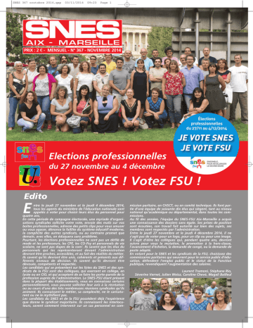 SNES 367 ocotobre 2014.qxp 03/11/2014 09:23 Page 1 PRIX : 2 € - MENSUEL - N° 367 - NOVEMBRE 2014 Elections professionnelles du 27 novembre au 4 décembre Votez SNES ! Votez FSU ! Edito E ntre le jeudi 27 novembre et le jeudi 4 décembre 2014, tous les agents du ministère de l'éducation nationale sont appelés à voter pour choisir leurs élus du personnel pour quatre ans. En cette période de campagne électorale, une myriade d'organisations syndicales sollicite votre vote, envoie des mails sur vos boîtes professionnelles, adresse des petits clips pour vous amuser ou vous agacer, dénonce la faillite du système éducatif moderne, la complicité des autres syndicats, ou au contraire promet que demain, avec elles, on éduquera sans problème. Pourtant, les élections professionnelles ne sont pas un défilé de mode et les professeurs, les CPE, les CO-Psy et personnels de vie scolaire, ne sont pas dupes de la com'. Ils savent que les élus du personnels qui les représenteront devant l'administration devront être proches, accessibles, et au fait des réalités du métier. Ils savent qu’ils devront être unis, cohérents et présents aux différents niveaux de décision. Ils savent qu’ils devront être dévoués, compétents et respectés. Les candidats qui se présentent sur les listes du SNES et des syndicats de la FSU sont des collègues, qui exercent en collège, en lycée ou en CIO, et qui acceptent de se faire les porte-parole de la profession auprès de l'administration. Le SNES-FSU étant présent dans la plupart des établissements, vous en connaissez certains personnellement, vous pouvez solliciter leur avis à la récréation ou au cours d'une des très nombreuses réunions syndicales qu'ils animent. Ils connaissent le métier, sa complexité, ne le caricaturent ou ne le mythifient pas. Les candidats du SNES et de la FSU possèdent déjà l'expérience que donne le syndicat majoritaire. Ils connaissent les interlocuteurs, savent comment intervenir sur un cas personnel en com- mission paritaire, en CHSCT, ou en comité technique. Ils font partie d'une équipe de soixante dix élus qui siègent, tant au niveau national qu'académique ou départemental, dans toutes les commissions. Au fil des années, l'équipe du SNES-FSU Aix-Marseille a acquis une connaissance des dossiers sans égale. Ses prises de position sont écoutées, son travail fait autorité sur bien des sujets, ses membres sont respectés par l'administration. Entre le jeudi 27 novembre et le jeudi 4 décembre 2014, il ne s'agit pas de voter pour un logo, pour un clip ou pour une image. Il s'agit d'élire les collègues qui, pendant quatre ans, devront suivre pour vous la mutation, la promotion à la hors-classe, l'avancement d'échelon, la demande de congé, ou la demande de poste adapté. En votant pour le SNES et les syndicats de la FSU, choisissez des commissaires paritaires qui oeuvrent pour le service public d'éducation, défendent l'emploi public et le statut de la Fonction publique, revendiquent l'augmentation des salaires. Laurent Tramoni, Stéphane Rio, Séverine Vernet, Julien Weisz, Caroline Chevé, Magali Bailleul SNES 367 ocotobre 2014.qxp 03/11/2014 09:23 Page 2 Actualités 2 Pour un bilan de la réforme du lycée Les lycées sont-ils des "isolats" ? L a combinaison de l'autonomie des établissements, du lycée Chatel et de la pénurie des DGH, sous la pression d'un milieu fortement concurrentiel - du privé ou des lycées entre eux - fera-t-elle des lycées des entités opaques, sans règles communes ni régulation générale ? Ici les effectifs en sciences ou en LV sont au-delà de 25, au mépris des règles de sécurité ou du bon sens pédagogiques. Là les cours d'allemand rassemblent Secondes et Terminales une heure par semaine au lieu des 2h ou 2,5h réglementaires. Ici les professeurs financent eux-mêmes les dispositifs pédagogiques dont les élèves ont effectivement besoin, en renonçant à l'heure de première chaire dont ils bénéficiaient encore il y a peu, ou pire, en travaillant une heure de plus gratuitement pour que les élèves aient des cours de LV dans des conditions décentes (majoration d'une heure pour effectifs faibles alors qu'il ne s'agit que de dédoublements). La répartition des DGH en une enveloppe réglementaire et une enveloppe dite de "stratégie" est l'outil redoutable qui rend difficile aujourd'hui la régulation du système. La deuxième enveloppe, en confondant des heures statutaires (heure de chaire notamment) et des moyens pour les enseignements, incite à toutes les dérives. Pire, elle peut aussi accréditer l'idée, répandue par certains chefs d'établissement peu scrupuleux, que les professeurs doivent choisir entre la rémunération de leur travail et l'amélioration des conditions de réussite des élèves. Qu'au fond, l'allégement des effectifs n'est qu'un "confort", un luxe que l'enseignant se paie. L'entrée en vigueur du nouveau décret statutaire à la rentrée 2015 va permettre de clarifier le calcul des Obligations Réglementaires de Services (disparition de la majoration pour effectifs faibles, prise en compte de la totalité des heures effectuées dans le cycle terminal pour le calcul de la pondération qui remplace l'heure de première chaire). Cependant la hausse démographique en lycée exerce une pression forte sur les conditions de travail des enseignants et d'étude des élèves, incitant à tous les bricolages à court terme. A l’opposé les lycées ont besoin d’une régulation extérieure forte, car leur finalité est de produire de la justice sociale et de l’égalité. Caroline Chevé Fermetures de CPGE Dans le contexte de pénurie des moyens le Rectorat tire argument de 200 places vacantes en CPGE pour fermer 4 classes sur Aix, Gap, Avignon et Marseille. Le SNES est intervenu en CTA le 16 octobre pour défendre le maillage territorial des classes préparatoires, facteur de démocratisation de l'accès à ces voies de r