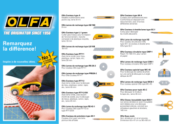 Olfa Couteau type A Modèle multifonctions avec poche-clip, lame 9 mm Olfa Lames de rechange type AB/10B 9 mm Olfa Couteau type L-1 green Cutter gros travaux pour le respect de l’environnement, manche composé à de plastique recyclés, lame 18 mm Remarquez la différence! Inspire à de nouvelles idées. Olfa Lames de rechange type LB/10B 18 mm oche1lle N à l’é iale d mon Olfa Couteau type RTY-1 Avec lame ronde, pour tissu, plastique, carton, tapis, etc., lame 28 mm Olfa Lames de rechange type RB-28-2 Pour couteau Olfa type RTY-1 Olfa Lames de rechange type PRB28-2 Pour Olfa Couteau RTY-1 Olfa Couteau type RTY-2 Avec lame ronde, pour la découpe de tissu, plastique, carton, tapis, etc., lame 45 mm Olfa Couteau type RTY-2/DX Avec lame ronde, avec bouton d’arrêt de sûreté, pour la découpe de tissus, plastique, carton, tapis, etc., lame 45 mm Olfa Couteau type AK-4 Couteau d’art professionnel avec ComfortGrip et dispositif antiretournement, avec 3 formes différentes de lames Olfa Couteau à double lame type SC-1 Conçu pour découper les motifs décoratifs Olfa Lame de rechange type KB Pour couteau de précision Olfa type AK-1 et couteau à double lame Olfa type SC-1 Olfa Couteau circulaire type CMP-1 Rayon 10–150 mm, pour carton et papier Olfa Lames de rechange type COB-1 Pour couteau circulaire Olfa type CMP-1 Olfa Couteau spécial type MC-45 Pour la découpe de cadres de photo sur une carte de découpe à un angle oblique de 45° Olfa Lames de rechange type MCB-1 Pour couteau spécial Olfa type MC-45 Olfa Couteau pour tapis 45-C Pour découper le linoléum, le tapis etc., lame 45 mm Olfa Lame de rechange type RB 45-1 Pour couteau Olfa type RTY-2 et type RTY-2/DX Olfa Ciseau inoxydable type SCS-1 Les lames dentées en acier inoxydable sont idéales pour une découpe puissanteet précise, convient aux utilisateurs gauchers et droitiers, 140 mm Olfa Couteau de précision type AK-1 Couteau d’art avec une lame pointue très affûtée Olfa Sous-main Vert, échelle en cm et en pouces, Dimension 63 × 47 cm ou 90 × 60 cm Olfa Couteau type SVR-2 auto-lock Cutter professionnel en acier inoxydable avec verrouillage de lame automatique et agrafe de poche, lame 9 mm Olfa Couteau type 180 black Le cutter standard le plus populaire avec manche en métal, lame 9 mm Olfa Couteau type A Modèle multifonctions avec poche-clip, lame 9 mm Pour les meilleurs résultats! Si ça doit être parfait. Noche1lle à l’é ndiale mo Olfa Couteau type NA-1 Cutter standard avec ComfortGrip et verrouillage de lame automatique, résistant aux acides et à l’acétone, lame 9 mm Olfa Couteau type XA-1 Design X à verrouillage automatique du modèle avec poignée anti-choc, résistant à l’acide et l’acétone, vendu avec une lame noire très affûtée, lame 9 mm Olfa Lames de rechange type AB/10B 9 mm Olfa Lames de rechange type ABB/10B Lame noire très affûtée, 9 mm Olfa Couteau type SL-1 Cutter pour gros travaux avec verrouillage de lame tractée, lame 18 mm Olfa Couteau type NOL-1 Cutter pour gros travaux multifonctions avec manche Grip, résistant aux acides et à l’acétone, lame 18 mm Olfa Couteau type NL-AL Cutter pour gros travaux avec manche Grip et verrouillage de lame automatique, résistant aux acides et à l’acétone, lame 18 mm Olfa Couteau type L-1 green Cutter gros travaux pour le respect de l’environnement, manche composé à de plastique recyclés, lame 18 mm Olfa Couteau type L-2 Cutter pour gros travaux avec manche Grip, lame 18 mm Olfa Couteau type OL Cutter pour découpe moquette avec allongement du guide lame permettant de couper des épaisseurs différentes, avec talon métal pour moquette au bout de manche, lame 18 mm Olfa Couteau type L-5 AL Design X du cutter très résistant avec verrouillage automatique, équipé d’une lame ultra affûtée noire, manche en caoutchouc anti-dérapage, résistant à l’acide et l’acétone, lame 18 mm Olfa Lames de rechange type LB/10B 18 mm Olfa Lames de rechange type LBB/10B Lame noire très affûtée, 18 mm Olfa Couteau type NH-1 Cutter pour gros travaux avec manche Grip, résistant aux acides et à l’acétone, lame 25 mm Olfa Lames de rechange type HB/5B 25 mm Olfa Couteau type SK-6 Couteau de sûreté avec lame autorétractable, evite les blessures pendant les travaux de découpe, lame 17,5 mm Olfa Lames de rechange RSKB-2/5 Olfa Couteau à lame à crochet type HOK-1 Cutter crochet pour gros travaux avec lame en acier carbone Olfa Lame de rechange type HOB-1 Pour couteau Olfa à lame crochet type HOK-1 Olfa Couteau plexi type PC-L Pour couper le plastique, l’acrylique et les structures laminées Olfa Lames de rechange type P-800 Pour couteau plexi Olfa type PC-L Olfa Sous-main Vert, échelle en cm et en pouces, Dimension 90 × 60 cm