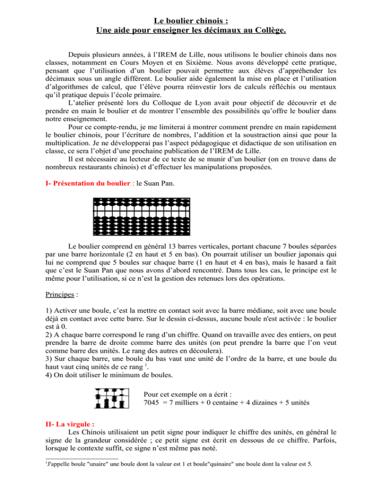 Le boulier chinois : Une aide pour enseigner les décimaux au Collège. Depuis plusieurs années, à l’IREM de Lille, nous utilisons le boulier chinois dans nos classes, notamment en Cours Moyen et en Sixième. Nous avons développé cette pratique, pensant que l’utilisation d’un boulier pouvait permettre aux élèves d’appréhender les décimaux sous un angle différent. Le boulier aide également la mise en place et l’utilisation d’algorithmes de calcul, que l’élève pourra réinvestir lors de calculs réfléchis ou mentaux qu’il pratique depuis l’école primaire. L’atelier présenté lors du Colloque de Lyon avait pour objectif de découvrir et de prendre en main le boulier et de montrer l’ensemble des possibilités qu’offre le boulier dans notre enseignement. Pour ce compte-rendu, je me limiterai à montrer comment prendre en main rapidement le boulier chinois, pour l’écriture de nombres, l’addition et la soustraction ainsi que pour la multiplication. Je ne développerai pas l’aspect pédagogique et didactique de son utilisation en classe, ce sera l’objet d’une prochaine publication de l’IREM de Lille. Il est nécessaire au lecteur de ce texte de se munir d’un boulier (on en trouve dans de nombreux restaurants chinois) et d’effectuer les manipulations proposées. I- Présentation du boulier : le Suan Pan. Le boulier comprend en général 13 barres verticales, portant chacune 7 boules séparées par une barre horizontale (2 en haut et 5 en bas). On pourrait utiliser un boulier japonais qui lui ne comprend que 5 boules sur chaque barre (1 en haut et 4 en bas), mais le hasard a fait que c’est le Suan Pan que nous avons d’abord rencontré. Dans tous les cas, le principe est le même pour l’utilisation, si ce n’est la gestion des retenues lors des opérations. Principes : 1) Activer une boule, c’est la mettre en contact soit avec la barre médiane, soit avec une boule déjà en contact avec cette barre. Sur le dessin ci-dessus, aucune boule n'est activée : le boulier est à 0. 2) A chaque barre correspond le rang d’un chiffre. Quand on travaille avec des entiers, on peut prendre la barre de droite comme barre des unités (on peut prendre la barre que l’on veut comme barre des unités. Le rang des autres en découlera). 3) Sur chaque barre, une boule du bas vaut une unité de l’ordre de la barre, et une boule du haut vaut cinq unités de ce rang 1. 4) On doit utiliser le minimum de boules. Pour cet exemple on a écrit : 7045 = 7 milliers + 0 centaine + 4 dizaines + 5 unités II- La virgule : Les Chinois utilisaient un petit signe pour indiquer le chiffre des unités, en général le signe de la grandeur considérée ; ce petit signe est écrit en dessous de ce chiffre. Parfois, lorsque le contexte suffit, ce signe n’est même pas noté. 1 J'appelle boule "unaire" une boule dont la valeur est 1 et boule"quinaire" une boule dont la valeur est 5. On se met d’accord pour repérer une barre comme barre des unités (en général, je prends la quatrième) ; certains collent un petit bout de papier entre deux barres (“ ça fait une virgule ”). Suivant le choix de la barre des unités, on peut lire 12,36 ou 1,236. Dans l’exemple ci-dessous, en prenant comme barre des unités celle du 2, on lit directement plusieurs écritures du nombre : 1236 3 6 123,6 ou 12 ou encore ,... 12,36 mais aussi 100 10 100 10 III-Additions sur le boulier : a) Additions « où l’on a suffisamment de boules sur les barres » : Pour effectuer, par exemple, 123 + 221, on écrit 123 sur le boulier, puis on ajoute 221, c’est-à-dire que l’on monte 2 boules sur la barre des centaines, deux sur la barre des dizaines et une sur celle des unités. On effectue ces opérations dans l’ordre que l’on veut, commençant généralement par ce qui est facile à effectuer. Pour 123 + 282, le procédé est le même, il faudra juste veiller à utiliser le principe 4, qui exige que le nombre soit écrit avec le minimum de boules. Il faudra donc remplacer les cinq unités par une boule quinaire et les dix dizaines par une centaine. Ce sont nos retenues usuelles. Le procédé est le même pour 372 + 585 On pose 372 ; pour ajouter 585 , pas de problème pour les unités : on active une boule quinaire. Pour ajouter 8 sur la barre des dizaines, on a juste suffisamment de boules : une quinaire et 3 unaires. Il reste à activer une quinaire sur la barre des centaines ; il est important de noter que toutes ces manipulations peuvent se faire dans un ordre indifférent. On obtient la position suivante : On désactive les deux boules quinaires en activant une boule sur la barre située immédiatement à gauche ; puis on désactive les 5 boules unaires en activant une boule quinaire de la même barre. On obtient : Remarque : Au lieu d’ajouter 8 , on peut ajouter 10 et enlever 2. Cette méthode s’imposera lorsqu’il manquera des boules sur une barre. b) Addition « où il manque des boules sur les barres » : Par exemple : 2487 + 879 On active 2487. Sur la barre des unités, on ne dispose que de 8 unités pour ajouter 9. Sur celle des dizaines, on en dispose exactement 7 pour ajouter 7, (on peut à la rigueur effectuer directement cettte opération, mais ce n’est pas pertinent). Et sur celle des centaines, on n’en dispose que de 7 pour ajouter 8. Ajoutons 8 centaines (il me semble plus intéressant de commencer par gérer les chiffres de rang élevé). On active 1 boule unaire sur la barre des milliers et on en enlève deux sur celle des centaines. On adaptera cette méthode à de nombreuses situations similaires : ajouter 98, ou 47 ... Pour ajouter 7 dizaines, on peut utiliser toutes les boules disponibles, puis simplifier, ou bien on ajoute 1 centaine et on enlève 3 dizaines. Pour ajouter 9, on est obligé d’ajouter 10 et d’enlever 1. On rapprochera cette démarche de l’action “ rendre la monnaie ”. Les additions peuvent s’organiser dans un ordre quelcon