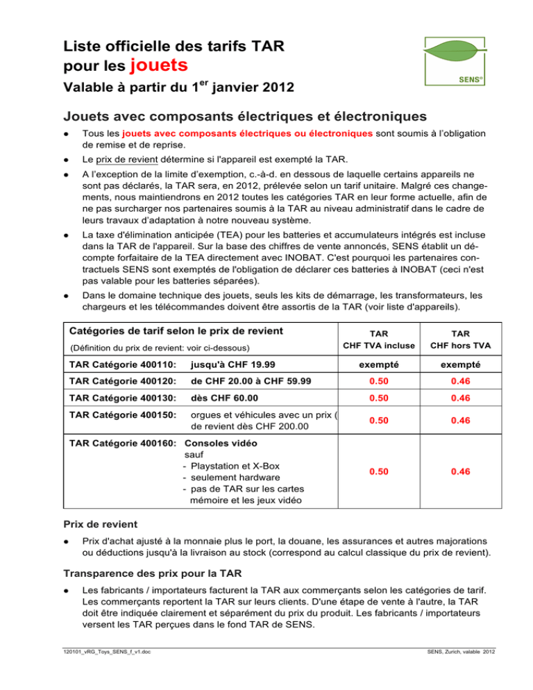 Liste officielle des tarifs TAR pour les jouets Valable à partir du 1er janvier 2012 Jouets avec composants électriques et électroniques l Tous les jouets avec composants électriques ou électroniques sont soumis à l’obligation de remise et de reprise. l Le prix de revient détermine si l'appareil est exempté la TAR. l A l’exception de la limite d’exemption, c.-à-d. en dessous de laquelle certains appareils ne sont pas déclarés, la TAR sera, en 2012, prélevée selon un tarif unitaire. Malgré ces changements, nous maintiendrons en 2012 toutes les catégories TAR en leur forme actuelle, afin de ne pas surcharger nos partenaires soumis à la TAR au niveau administratif dans le cadre de leurs travaux d’adaptation à notre nouveau système. l La taxe d'élimination anticipée (TEA) pour les batteries et accumulateurs intégrés est incluse dans la TAR de l'appareil. Sur la base des chiffres de vente annoncés, SENS établit un décompte forfaitaire de la TEA directement avec INOBAT. C'est pourquoi les partenaires contractuels SENS sont exemptés de l'obligation de déclarer ces batteries à INOBAT (ceci n'est pas valable pour les batteries séparées). l Dans le domaine technique des jouets, seuls les kits de démarrage, les transformateurs, les chargeurs et les télécommandes doivent être assortis de la TAR (voir liste d'appareils). Catégories de tarif selon le prix de revient (Définition du prix de revient: voir ci-dessous) TAR CHF TVA incluse TAR CHF hors TVA exempté exempté TAR Catégorie 400110: jusqu'à CHF 19.99 TAR Catégorie 400120: de CHF 20.00 à CHF 59.99 0.50 0.46 TAR Catégorie 400130: dès CHF 60.00 0.50 0.46 TAR Catégorie 400150: orgues et véhicules avec un prix ( de revient dès CHF 200.00 0.50 0.46 0.50 0.46 TAR Catégorie 400160: Consoles vidéo sauf - Playstation et X-Box - seulement hardware - pas de TAR sur les cartes mémoire et les jeux vidéo Prix de revient l Prix d'achat ajusté à la monnaie plus le port, la douane, les assurances et autres majorations ou déductions jusqu'à la livraison au stock (correspond au calcul classique du prix de revient). Transparence des prix pour la TAR l Les fabricants / importateurs facturent la TAR aux commerçants selon les catégories de tarif. Les commerçants reportent la TAR sur leurs clients. D'une étape de vente à l'autre, la TAR doit être indiquée clairement et séparément du prix du produit. Les fabricants / importateurs versent les TAR perçues dans le fond TAR de SENS. 120101_vRG_Toys_SENS_f_v1.doc SENS, Zurich, valable 2012 Liste officielle des tarifs TAR pour les jouets l page 2 Les commerces spécialisés et les détaillants (vente au consommateur final) doivent inclure la TAR dans leurs prix de vente. Nous recommandons toutefois d’indiquer au consommateur que la TAR est incluse (p. ex. en mentionnant «TAR incluse»). Pour les détails, voir la feuille d’information du seco concernant l’ordonnance sur l’indication des prix du 1er juin 2005. Explications 1. Les tarifs TAR sont valables pour une année, à partir du 1er janvier. La liste d’appareils n’est pas définitive et sera retravaillée continuellement. 2. Tous les appareils ne figurant pas sur cette liste qui comportent des composants électriques ou électroniques et qui sont semblables à l’un des produits listés sont également soumis à la TAR. 3. Nous vous saurions gré de nous signaler tout appareil que vous ne trouveriez pas sur la liste. Il sera introduit dans la liste valable pour la prochaine période. Vous contribuez ainsi à actualiser et à compléter la liste des appareils. 4. Les appareils de garantie aussi bien que de remplacement sont soumis à la TAR depuis le 01.01.2011. 5. Les appareils prévus pour l’exportation sont exemptés de la TAR, pour autant que la preuve puisse être apportée qu’ils ont bien été exportés 6. En cas de problèmes avec la liste d’appareils, de questions de toute sorte ou de demandes concernant le niveau ou l’application de la TAR, vous avez la possibilité d’intervenir en contactant les personnes suivantes: Teresa Medaglia (gestion du fonds TAR), SENS, Obstgartenstrasse 28, 8006 Zurich Tél. 043 255 20 02 / courriel: [email protected] ou votre représentant dans la Commission TAR M. Reto Zurflüh (Association Suisse des Jouets, ASJ), z2solutions gmbh, Lörenweg 12, 4460 Gelterkinden Tél. 061 983 06 25 / courriel: [email protected] 7. Vos demandes seront traitées durant la séance de printemps et d’automne de la Commission TAR. Si la demande est approuvée, la modification correspondante sera introduite dans la liste des appareils valable pour la prochaine période. 120101_vRG_Toys_SENS_f_v1.doc SENS, Zurich, valable 2012 Liste officielle des tarifs TAR pour les jouets page 3 Liste des appareils TAR: groupes et domaines de marchandises è Les numéros des groupes de marchandises correspondent à la classification des jouets selon la «liste de Bamberger», état novembre 2003. è Tous les appareils listés ne sont pas soumis à la TAR. Un appareil listé est soumis à la TAR s’il contient un composant électrique ou électronique. è La liste des appareils n'est pas définitive. Les jouets listés sont à considérer comme des exemples! Domaine de marchandises 1: modèles réduits de trains – trams – pistes de voitures – modèles réduits de voitures H0, N, Z 10 Modèles réduits de trains / accessoires techniques I et 0: TAR uniquement sur les kits de démarrage et les transformateurs Articles avec fonctions techniques pour voie I, 0, II m LGB tels que p. ex. ensembles de base, locomotives, wagons, lignes électriques, rails, signaux de plaques tournantes, barrières, installations à fonction spécifique, pièces de rechange, lettres d’imprimerie, etc. 11 Modèles réduits de trains / accessoires techniques H0: TAR uniquement sur les kits de démarrage et les transformateurs Tous les articles avec fonctions techniques pour voie H0, comme ceux du