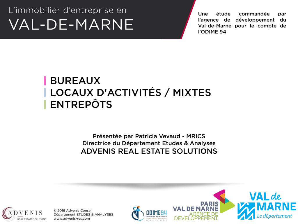 L’immobilier d’entreprise en VAL-DE-MARNE Une étude commandée par l’agence de développement du Val-de-Marne pour le compte de l’ODIME 94 | BUREAUX | LOCAUX D'ACTIVITÉS / MIXTES | ENTREPÔTS Présentée par Patricia Vevaud - MRICS Directrice du Département Etudes & Analyses ADVENIS REAL ESTATE SOLUTIONS © 2016 Advenis Conseil Département ETUDES & ANALYSES www.advenis-res.com L’immobilier d’entreprise en Présentation du Groupe Advenis VAL-DE-MARNE Côté sur Euronext Paris, Advenis est un groupe indépendant qui a pour ambition d’être un acteur majeur dans la conception, la distribution et la gestion d’actifs immobiliers et financiers. Advenis est implantée aujourd’hui en France et en Allemagne avec : 500 collaborateurs 7 Mds € d’actifs sous gestion 50 000 clients* Au service d’une clientèle institutionnelle et privée, le groupe Advenis propose une offre globale et intégrée, s’articulant autour de 3 pôles : Valorisation et Gestion d’Actifs Distribution et Gestion Privée Services Immobiliers (RES) ADVENIS REAL ESTATE SOLUTIONS : un accompagnement dédié et global dans l’immobilier Advenis RES est un intervenant majeur et indépendant des services immobiliers. Advenis RES associe ses différentes expertises pour proposer une offre de services immobiliers intégrée, complète et dynamique. Advenis RES dispose d’une présence territoriale dense, avec près d’une trentaine d’implantations en France et deux en Allemagne. FACILITY MANAGEMENT Gestion technique et des services aux bâtiments Pilotage des services aux occupants Gestion locative pour le compte d’utilisateurs CONSEIL Transactions, locations, ventes Conseil en investissement Multi-sites, logistique, services dédiés Etudes et analyses ASSET MANAGEMENT Elaboration d’une stratégie pluridisciplinaire d’optimisation et de valorisation des actifs immobiliers PROPERTY MANAGEMENT Représentation du propriétaire Gestion locative Gestion ASL/AFUL Gestion de copropriétés RIE www.advenis-res.com © 2016 Advenis Conseil Département ETUDES & ANALYSES www.advenis-res.com L’immobilier d’entreprise en Sommaire VAL-DE-MARNE | Le marché des BUREAUX L’offre disponible L’offre future Les valeurs de l’offre La demande placée Les valeurs de transaction Les EPT A retenir | Le marché des LOCAUX d’ACTIVITES | MIXTES L’offre disponible L’offre future Les valeurs de l’offre La demande placée Les valeurs de transaction Les EPT A retenir | Le marché des ENTREPÔTS p.6 7 9 10 11 13 14 16 p.17 18 20 21 22 24 25 27 p.28 L’offre disponible Les valeurs de l’offre La demande placée Les valeurs de transaction Les EPT A retenir 29 31 32 34 35 37 Méthodologie Lexique Contact ODIME 94 Contacts Advenis Real Estate Solutions 38 39 42 43 © 2016 Advenis Conseil Département ETUDES & ANALYSES www.advenis-res.com L’immobilier d’entreprise en VAL-DE-MARNE La présente étude a été réalisée en Avril 2016 à la demande de l’agence de développement du Val-de-Marne pour le compte de l’ODIME 94, par Advenis Real Estate Solutions, conseil en Immobilier d’Entreprise. Elle porte sur le marché d’immobilier d’entreprise du Val-de-Marne comprenant 47 communes et, à partir du 1er janvier 2016, 3 établissements publics territoriaux - EPT. Elle a pour but de connaître les caractéristiques et évolutions du marché d’immobilier d’entreprise, marché représentant une part importante dans le développement économique local du Val-de-Marne notamment en favorisant l’accueil, l’implantation et le développement des entreprises. Pour permettre une approche plus précise du département en termes de logique de marché d’immobilier d’entreprise, il a été décidé d’étudier également le marché au niveau des 3 territoires que représentent les nouveaux EPT dans leur périmètre définitif au 1er janvier 2016. Soit : T10 ACTEP : 13 communes T11 Plaine centrale-Haut Val de Marne-Plateau briard : 16 communes T12 Val de Bièvre-Seine amont-Grand Orly : 18 communes (6 communes hors étude sont situées dans le département de l’Essonne : Paray-Vieille-Poste, Athis-Mons, Morangis, Juvisy-s/Orge, Savigny-s/Orge et Viry-Châtillon) © 2016 Advenis Conseil Département ETUDES & ANALYSES www.advenis-res.com Présentation de l’Etude L’immobilier d’entreprise en VAL-DE-MARNE Territoire de l’étude Le Val-de-Marne 47 communes 3 Etablissements Publics Territoriaux Près de 200 ZAE Parcs d'activités et parcs tertiaires © 2016 Advenis Conseil Département ETUDES & ANALYSES www.advenis-res.com L’immobilier d’entreprise en Partie 1 VAL-DE-MARNE | Le marché des BUREAUX © 2016 Advenis Conseil Département ETUDES & ANALYSES www.advenis-res.com L’immobilier d’entreprise en Bureaux | VAL-DE-MARNE Parc construit 3 % 4 019 625 m² Offre disponible 14,64 % 294 067 m² 16 % % Neuf % > à 5 000 m² % Location | % Vente Taux de vacance 25,6 % 92 % | 21 % 7,32 % Valeur locative moyenne Neuf 217 €/m² Valeur locative moyenne Second marché 173 €/m² OFFRE DISPONIBLE 2015 Le Val-de-Marne en IDF 7 % du parc de bureaux (source ORIE 2015) 7,5 % de l’offre Analyse Progression du parc construit Hausse de l’offre disponible Augmentation de l’offre neuve Hausse de la part d’offres > à 5 000 m² Valeurs locatives attractives par rapport à Paris Variation 2014/2015 © 2016 Advenis Conseil Département ETUDES & ANALYSES www.advenis-res.com L’immobilier d’entreprise en VAL-DE-MARNE Bureaux | OFFRE DISPONIBLE 2015 Offre positionnée à proximité de Paris Rungis | Orly | ChevillyLarue Créteil Créteil | l’Horizon Rungis | Quebec Aucune offre recensée © 2016 Advenis Conseil Département ETUDES & ANALYSES www.advenis-res.com L’immobilier d’entreprise en Bureaux | VAL-DE-MARNE Offre future 610 000 m² % Projets 89 % % Labellisés ou Certifiés 69 % % > 5 000 m² OFFRE FUTURE Orly | Cœur d’Orly 97 % % Location | % Vente 99 % | 21 % Valeur locative moyenne 235 €