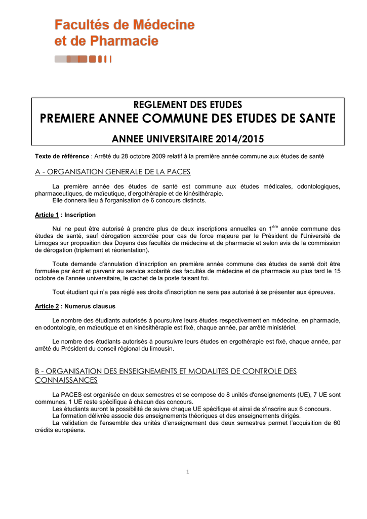 REGLEMENT DES ETUDES PREMIERE ANNEE COMMUNE DES ETUDES DE SANTE ANNEE UNIVERSITAIRE 2014/2015 Texte de référence : Arrêté du 28 octobre 2009 relatif à la première année commune aux études de santé A - ORGANISATION GENERALE DE LA PACES La première année des études de santé est commune aux études médicales, odontologiques, pharmaceutiques, de maïeutique, d’ergothérapie et de kinésithérapie. Elle donnera lieu à l'organisation de 6 concours distincts. Article 1 : Inscription ère Nul ne peut être autorisé à prendre plus de deux inscriptions annuelles en 1 année commune des études de santé, sauf dérogation accordée pour cas de force majeure par le Président de l'Université de Limoges sur proposition des Doyens des facultés de médecine et de pharmacie et selon avis de la commission de dérogation (triplement et réorientation). Toute demande d’annulation d’inscription en première année commune des études de santé doit être formulée par écrit et parvenir au service scolarité des facultés de médecine et de pharmacie au plus tard le 15 octobre de l’année universitaire, le cachet de la poste faisant foi. Tout étudiant qui n’a pas réglé ses droits d’inscription ne sera pas autorisé à se présenter aux épreuves. Article 2 : Numerus clausus Le nombre des étudiants autorisés à poursuivre leurs études respectivement en médecine, en pharmacie, en odontologie, en maïeutique et en kinésithérapie est fixé, chaque année, par arrêté ministériel. Le nombre des étudiants autorisés à poursuivre leurs études en ergothérapie est fixé, chaque année, par arrêté du Président du conseil régional du limousin. B - ORGANISATION DES ENSEIGNEMENTS ET MODALITES DE CONTROLE DES CONNAISSANCES La PACES est organisée en deux semestres et se compose de 8 unités d'enseignements (UE), 7 UE sont communes, 1 UE reste spécifique à chacun des concours. Les étudiants auront la possibilité de suivre chaque UE spécifique et ainsi de s'inscrire aux 6 concours. La formation délivrée associe des enseignements théoriques et des enseignements dirigés. La validation de l’ensemble des unités d’enseignement des deux semestres permet l’acquisition de 60 crédits européens. 1 er Article 3 : Enseignements du 1 semestre er Enseignements 1 semestre : UE communes UE UE1 : Atomes – Biomolécules – Génome – Bioénergétique – Métabolisme Pr Sturtz Mme Fagnère UE2-1 : La cellule et les tissus Pr Yardin M Froissard ère UE3-1 : (1 partie) Organisation des appareils et systèmes (1) : Aspects fonctionnels et méthodes d’études Pr Duroux Pr Monteil UE4 : Evaluation des méthodes d’analyses appliquées aux sciences de la vie et de la santé Pr Preux Pr Rousseau UE5 : Organisation des appareils et systèmes (2) : Aspects morphologiques et fonctionnels Pr Mabit Mme Durand Fontanier UE7-1 (psycho) : Santé, Société, Humanité (coef 1 dans l’UE 7) Pr Clément TOTAL Modalités d’examens Type Durée d’épreuve ECTS Durée totale CM ED 10 90h 76h 14h QCM 5 39h 39h 0h 6 38h 30h 4 37h 5 Coefficients Médecine Pharmacie Maïeutique Odontologie Ergothérapie Kinésithérapie 2h 2 2.3 1.8 2 1 1 QCM 1h 1 0.8 1.1 1 1 1 8h QCM 1h 1 1 0.7 1 1 1 25h 12h QCM 1h 0.5 0.8 0.8 0.5 0.5 0.5 38h 38h 0h QCM 1h 1 0.6 1 1 2 2 - 20h 20h 0h Rédaction 30 min 30 262h 227h 34h 2 Uniquement passation de l’épreuve ; la note obtenue ne sera connue et comptabilisée que pour les résultats délivrés à l’issue du semestre 2. Article 4 : Enseignements du 2 Enseignements 2 ème UE ème semestre semestre : UE communes Durée ECTS CM totale UE2-2 : La cellule et les tissus Pr Yardin ; M. Froissard ème UE3-2 : (2 partie) Organisation des appareils et systèmes (1) : Aspects fonctionnels et méthodes d’études Pr Duroux ; Pr Monteil UE6 : ED Mod. d’examens Type Durée d’épreuve Coefficients Médecine Pharmacie Maïeutique Odontologie Ergothérapie Kinésithérapie 4 37h 37h 0h QCM 1h 1 0.8 1.1 1 1 1 4 40h 32h 8h QCM 1h 1 1 0.7 1 1 1 Initiation à la connaissance du médicament 4 36h 34h 2h QCM 1h 0.5 1.4 0.8 0.5 0.5 0.5 Pr Viana ; Pr Marquet UE7-2 : Santé, Société, Humanité (coef 2 dans l’UE 7) Pr Saint-Marcoux ; Pr Vergnenègre TOTAL 8 43h 43h 0h QCM 1h 2 1.3 2 2 2 2 20 156h 146h 10h Enseignements 2 ème UE Médecine Mme Bourthoumieu Mme Durand Fontanier Pharmacie* Pr Viana ; Mme Fagnere Sage-femme Pr Aubard ; Mme Faury Odontologie Pr Monteil Ergothérapie Pr Salle Kinésithérapie Pr Salle semestre : UE spécifiques Durée ECTS CM totale ED Mod. d’examens Type Durée d’épreuve Coefficients Médecine Pharmacie Maïeutique Odontologie Ergothérapie Kinésithérapie 10 50h 50h 0h QCM 1h 2 / / / / / 10 50h 42h 8h QCM 1h / 2 / / / / 10 50h 50h 0h QCM 1h / / 2 / / / 10 50h 48h 2h QCM 1h / / / 2 / / 10 50h 50h 0h QCM 1h / / / / 2 / 10 50h 50h 0h QCM 1h / / / / / 2 *Un point important en pharmacie: Les étudiants qui se seront inscrits à l'issue du concours du S1 dans la filière Pharmacie devront obligatoirement suivre les enseignants dirigés (ED) des UE spécifiques de Pharmacie. Une seule absence aux enseignements dirigés de l'UE spécifique de Pharmacie sera tolérée et devra être justifiée par un courrier adressé à la scolarité. En l'absence de justification et en cas d'absences répétées, l'étudiant ne sera pas autorisé à concourir dans la filière Pharmacie et ne sera pas classé dans la filière Pharmacie à l'issue du concours du S2. La liste des étudiants autorisés à concourir dans la filière Pharmacie sera publiée et consultable 15 jours avant les épreuves du concours du S2. 3 Contenu des UE spécifiques Maïeutique Unité foeto-placentaire 15h 12 QCM Anatomie du petit bassin chez la femme 15h 12 QCM Méthodes d’études et d’analyse du génome 5h 4 QCM Anatomie et histologie de l’appareil reproducteur et du sein 15h 12 QCM Médecine Anatomie tête et cou 15h 12 QCM Anatomie du petit bassin chez la femme 15h 12 QCM Mé