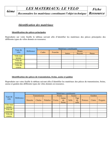 6ème LES MATERIAUX: LE VELO Fiche Reconnaitre les matériaux constituant l’objet technique Ressource Identification des matériaux Identification des pièces principales Reproduire sur votre feuille le tableau suivant afin d’identifier les matériaux des pièces principales des différents types de vélos donnés en ressource. Type de vélo Matériaux constituants Référence Cadre Fourche Jantes Roues Rayons Pneus Vélo tout terrain Vélo de tourisme Vélo de course Identification des pièces de transmission, freins, assise et guidon Reproduire sur votre feuille le tableau suivant afin d’identifier les matériaux des pièces de transmission, freins, assise et guidon des différents types de vélos donnés en ressource. Type de vélo Vélo tout terrain Vélo de tourisme Vélo de course Transmission Référence Manette Chaîne Pédalier Matériaux constituants Freins Assise Gaine Tige Freins de Selle de freins selle Guidon Potence Cintre Poignée 6ème LES MATERIAUX: LE VELO Fiche Reconnaitre les matériaux constituant l’objet technique Ressource Synthèse de l’identification des matériaux Lister dans le tableau suivant les différents matériaux définis précédemment. Pièces Cadre Fourche Roues Jantes Rayons Assise Freins Transmission Pneus Manette Chaîne Pédaliers Freins Gaine de freins Selle Tige de selle Guidon Potence Cintre Poignée Matériaux 6ème LES MATERIAUX: LE VELO Fiche Reconnaitre les matériaux constituant l’objet technique Ressource VELO TOUT TERRAIN VTT1 VTT MIXTE 18 Vitesses, ht 48. Cadre acier, 18 vitesses, Pour la randonnée et les loisirs. Garantie : 5 ans le cadre, 2 ans les composants. Notice technique - CADRE : Acier Hi-Ten - FOURCHE : Acier - ROUES : . Jantes : aluminium mat . Moyeux : aluminium . Rayons : acier Zingué . Pneus : 26 X 1,95 Elastomère noir . Chambre à air : caoutchouc - TRANSMISSION : . Dérailleur arrière : Acier . Manettes : 18 vitesses aluminium. . Chaîne : Acier . Pédalier : acier + résine . Boîtier de pédalier : aluminium - PERIPHERIQUE : . Freins : résine noir . Gaîne de frein : Téflonnée noir . Pédales : carbone axe en acier chrome/molybdène . Selle : armature acier chromé. VTT Elastomère noir . Tige de selle : aluminium . Serrage de selle : aluminium . Cintre : acier satin . Potence : acier satin . Poignées : élastomère noir - CABLE ET VISSERIE : Acier inoxydable LES MATERIAUX: LE VELO 6ème Reconnaitre les matériaux constituant l’objet technique VELO TOUT TERRAIN VTT2 VTT H 21 Vitesses, ht 50, FOURCHE XC 60 Fourche suspendue. Fabrication française. Garantie : 5 ans le cadre, 2 ans les composants , 1 an la fourche-suspension. Notice technique - CADRE : Aluminium - FOURCHE : Acier noir - ROUES : . Jantes : aluminium double paroi . Moyeux : aluminium . Rayons : acier inoxydable . Pneus : 26 X 1,95 Anti-crevaison Elastomère noir . Chambre à air : caoutchouc - TRANSMISSION : . Dérailleur avant et arrière : aluminium . Manettes : 18 vitesses aluminium. . Chaîne : Acier 114 maillons . Pédalier : disque aluminium . Boîtier de pédalier : aluminium - PERIPHERIQUE : . Freins : aluminium . Gaîne de frein : Téflonnée noir . Pédales : cage aluminium, axe en acier . Selle : Revêtement Elastomère noir . Tige de selle : aluminium . Serrage de selle : aluminium . Cintre : aluminium . Potence : aluminium . Poignées : caoutchouc noir - CABLE ET VISSERIE : Acier inoxydable Fiche Ressource LES MATERIAUX: LE VELO 6ème Reconnaitre les matériaux constituant l’objet technique Fiche Ressource VELO DE TOURISME VT1 VELO tourisme DAME 21 Vitesses, ht 53 Vélo multi-usage.Garantie : 2 ans 21 vitesses, poignées tournantes, pédalier et moyeux aluminium, poids 12.5 Kg. Notice technique - CADRE : aluminium - FOURCHE : Acier hi-ten - ROUES : . Jantes : aluminium . Moyeux : aluminium . Rayons : acier chromé . Pneus : 700 x 38 Elastomère noir . Chambre à air : caoutchouc - TRANSMISSION : . Dérailleur arrière : TX30 Acier . Manettes : poignées tournantes 21 vitesses PVC . Chaîne : Acier . Pédalier : aluminium 28 x 38 x 48 . Boîtier de pédalier : aluminium - PERIPHERIQUE : . Freins : V-Brake aluminium . Gaîne de frein : Téflon noir . Pédales : résine . Selle : VS-903. Elastomère . Tige de selle + serrage : aluminium . Cintre : acier . Potence : acier . Poignées : caoutchouc noir - CABLE ET VISSERIE : Acier inoxydable - SONNETTE : Acier LES MATERIAUX: LE VELO 6ème Reconnaitre les matériaux constituant l’objet technique Fiche Ressource VELO DE TOURISME VT2 BEACH BIKE EQUIPE F 6 Vitesses, porte-bagages tube, béquille alu, carter de chaîne fumé, garde-boue inox. L'équipement pour les loisirs et balades. Poids 13.5 Kg Notice technique - CADRE : Acier Hi-ten - FOURCHE : Acier hi-ten - ROUES : . Jantes : aluminium double paroi . Moyeux : aluminium . Rayons : acier inox . Pneus : 700 Elastomère noir . Chambre à air : caoutchouc - TRANSMISSION : . Dérailleur arrière : TX30 Acier . Manettes : poignées tournantes 21 vitesses. Résine . Chaîne : Acier . Pédalier : aluminium 42 dents . Boîtier de pédalier : aluminium - PERIPHERIQUE : . Freins : V-Brake aluminium . Gaîne de frein : Téflon noir . Pédales : Alu + Elastomère . Selle : Ressorts acier chromé. Elastomère noir . Tige de selle + serrage : aluminium . Cintre : aluminium . Potence : aluminium . Poignées : Elastomère - Kraton - noir - CABLE ET VISSERIE : Acier inoxydable - SONNETTE : Acier LES MATERIAUX: LE VELO 6ème Reconnaitre les matériaux constituant l’objet technique Fiche Ressource VELO DE COURSE VC1 VELO COURSE 24 Vitesses SORA, ht58, CADRE ALU, FOURCHE CARBONE , Poids 12,5 kg Pour la route. Garantie : 5 ans le cadre, 2 ans les composants. Notice technique - CADRE : Aluminium - FOURCHE : Carbone - ROUES : . Jantes : aluminium double paroi . Moyeux : aluminium à blocage avant et écrou arrière . Rayons : acier inox noir . Pneus : 700 Anti-crevaison Elastomère noir . Chambre à air : caoutchouc - TRANSMISSION : . Déraill