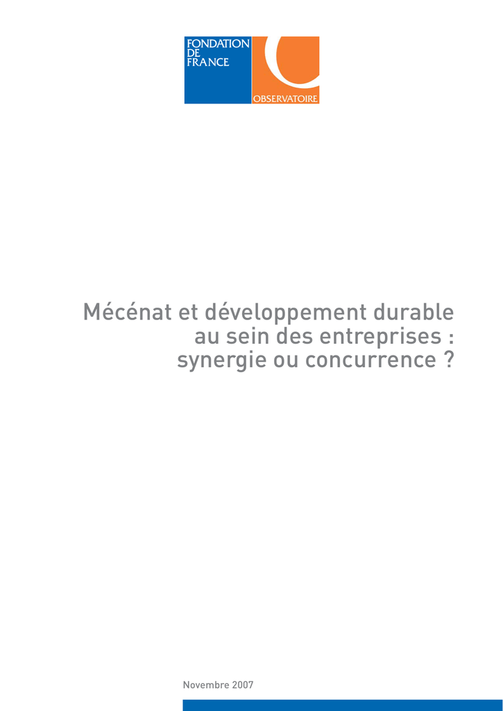 Mécénat et développement durable au sein des entreprises : synergie ou concurrence ? Novembre 2007 Remerciements La Fondation de France et Sociovision Cofremca remercient les entreprises et leurs représentants qui ont accepté de participer sous la forme de groupes de travail ou d’interviews à la réflexion prospective sur « l’avenir du mécénat dans un contexte de montée en puissance des préoccupations de développement durable »: ● ● ● ● ● ● ● ● ● ● ● ● ● ● Michel Avenas, délégué général de la Fondation d’entreprise Veolia Environnement Marine de Bazelaire, coordinateur responsabilité d'entreprise / développement durable, HSBC France Sophie Bonnaure, déléguée générale de la Fondation Vinci pour la Cité Christian Caye, délégué au développement durable, Vinci Jean-François Communier, directeur de la communication corporate, NATIXIS Eric Flamand, directeur délégué au développement durable, SNCF Olivier de Guerre, président, Phitrust Active Investors Charles Ly Wa Hoï, directeur développement durable et qualité, ETDE Bouygues Construction Arnaud Mourot, directeur, Ashoka France Henri de Reboul, délégué général d’IMS-Entreprendre pour la Cité Virginie Seghers, consultante, ancienne déléguée générale de l’Admical, maître de conférences à Sciences-Po, chargée de mission pour la Caisse des dépôts Catherine Schwartz, chef de projet, direction du développement durable et de la responsabilité sociale, Danone Frédéric Tiberghien, conseiller d’Etat, ancien délégué interministériel à l’innovation, à l’expérimentation sociale et à l’économie sociale, président d’honneur de l’ORSE Alain Tourdjman, directeur des études et de la prospective, Caisse Nationale des Caisses d'Epargne D’autres témoignages de responsables d’entreprise ont été recueillis de manière anonyme et confidentielle. Les verbatims présents dans ce rapport respectent de toute façon le principe de l’anonymat. Sommaire 2 Introduction p.4 La montée des préoccupations sociétales impacte l’entreprise p.6 L’engagement sociétal de l’entreprise se fait dans une logique d’adaptation douce du capitalisme p.12 La montée du développement durable contribue au renouvellement du mécénat p.20 Quel avenir pour le développement durable et pour le mécénat ? p.29 Conclusion p.34 Mécénat et développement durable au sein des entreprises : synergie ou concurrence ? Observatoire de la Fondation de France Mécénat et développement durable au sein des entreprises : synergie ou concurrence ? Une étude de l’Observatoire de la Fondation de France appuyée sur les résultats de deux travaux successifs : ● une réflexion de nature prospective menée avec Sociovision Cofremca sur le thème du mécénat et du développement durable de janvier à mai 2007, ● un sondage d’opinion auprès de 200 responsables communication, mécénat et développement durable d’entreprises actives en France, mené en octobre 2007 par l’IFOP. Les résultats du sondage d’opinion ont été insérés, à titre de complément et sous forme d’encarts, au fil du texte de synthèse de la réflexion prospective. Mécénat et développement durable au sein des entreprises : synergie ou concurrence ? Observatoire de la Fondation de France 3 Introduction Attentive aux mutations des entreprises face aux enjeux de société, la Fondation de France a décidé d’engager une réflexion prospective sur l’avenir du mécénat. Cette interrogation sur le mécénat d’entreprise s’inscrit dans un contexte plus large de mesure du phénomène de montée en puissance du développement durable. Toute une série de questions se posent : Comment analyser le contenu sociétal qui se cache derrière le développement durable ? S’agit-il d’un phénomène de mode ou d’un changement substantiel de notre modèle de société ? Que peut-on dire aujourd’hui de l’implication des entreprises françaises dans les « actions d’intérêt général » ? Comment évoluent les entreprises dans leur prise en compte des préoccupations en la matière ? Comment agissent-elles, qu’est-ce qui les pousse à agir ? Perçoit-on des évolutions significatives entre les réponses apportées il y a quelques années et celles d’aujourd’hui ? Y a-t-il des tendances qui se dégagent ? Cela nous éclaire-t-il pour le futur ? Quelles réponses pourraient s’inventer dans les 5-10 ans qui viennent ? Comment évoluent les modalités d’action autour du développement durable ? Quelle est la place du mécénat ? Trouve-t-il sa légitimité dans les évolutions actuelles ? Comment évolue-t-il ? Comment pourrait-il évoluer dans le futur ? La période actuelle apparaît opportune pour faire un premier bilan de l’expérience des entreprises qui ont, depuis plus d’une décennie, progressivement intégré une démarche de développement durable. A l’évidence, beaucoup d’entreprises, des groupes internationaux mais aussi des entreprises de plus petite taille, n’ont pas attendu la montée du phénomène pour agir en faveur de la société. Le mécénat est une pratique ancienne. Cependant, les initiatives sociétales se sont étendues et diversifiées et sont devenues, 4 pour beaucoup d’entreprises, un lieu d’interface et d’action avec leur environnement. A travers cette réflexion qui a réuni un groupe d’acteurs concernés, il s’est agi de faire un point d’étape sur la nature du phénomène social qui se cache derrière la montée en puissance du développement durable, d’examiner les conséquences sur le mécénat, et de réaliser un effort de prospective, non pas pour prédire l’avenir, mais pour susciter le débat et se préparer à différents scenarii d’évolution dont les germes sont d’ores et déjà visibles. La démarche s’est déroulée de mars à mai 2007 et s’est articulée en trois temps : Un travail de desk resea