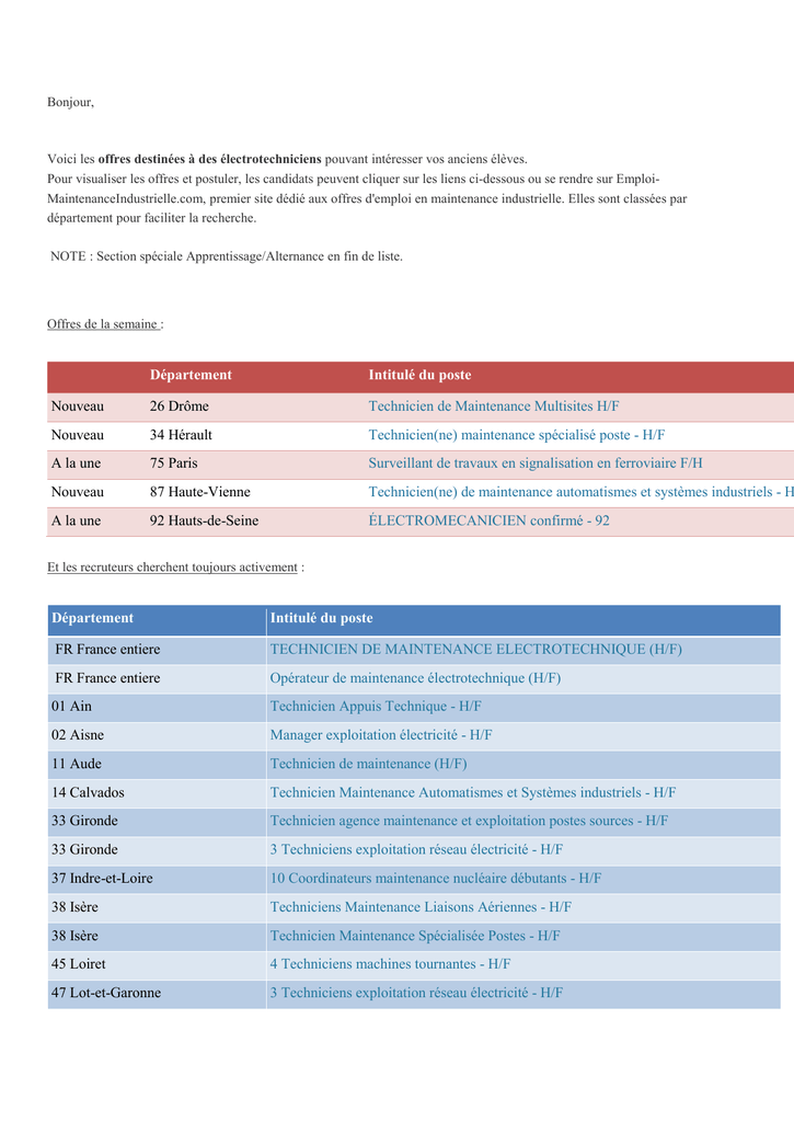 Bonjour, Voici les offres destinées à des électrotechniciens pouvant intéresser vos anciens élèves. Pour visualiser les offres et postuler, les candidats peuvent cliquer sur les liens ci-dessous ou se rendre sur EmploiMaintenanceIndustrielle.com, premier site dédié aux offres d'emploi en maintenance industrielle. Elles sont classées par département pour faciliter la recherche. NOTE : Section spéciale Apprentissage/Alternance en fin de liste. Offres de la semaine : Département Intitulé du poste Nouveau 26 Drôme Technicien de Maintenance Multisites H/F Nouveau 34 Hérault Technicien(ne) maintenance spécialisé poste - H/F A la une 75 Paris Surveillant de travaux en signalisation en ferroviaire F/H Nouveau 87 Haute-Vienne Technicien(ne) de maintenance automatismes et systèmes industriels - H A la une 92 Hauts-de-Seine ÉLECTROMECANICIEN confirmé - 92 Et les recruteurs cherchent toujours activement : Département Intitulé du poste FR France entiere TECHNICIEN DE MAINTENANCE ELECTROTECHNIQUE (H/F) FR France entiere Opérateur de maintenance électrotechnique (H/F) 01 Ain Technicien Appuis Technique - H/F 02 Aisne Manager exploitation électricité - H/F 11 Aude Technicien de maintenance (H/F) 14 Calvados Technicien Maintenance Automatismes et Systèmes industriels - H/F 33 Gironde Technicien agence maintenance et exploitation postes sources - H/F 33 Gironde 3 Techniciens exploitation réseau électricité - H/F 37 Indre-et-Loire 10 Coordinateurs maintenance nucléaire débutants - H/F 38 Isère Techniciens Maintenance Liaisons Aériennes - H/F 38 Isère Technicien Maintenance Spécialisée Postes - H/F 45 Loiret 4 Techniciens machines tournantes - H/F 47 Lot-et-Garonne 3 Techniciens exploitation réseau électricité - H/F 49 Maine-et-Loire Coordonnateur(rice) Groupement de Postes - H/F 49 Maine-et-Loire Technicien(ne) Contremaître Maintenance Spécialisée Poste - H/F 49 Maine-et-Loire Technicien(ne) de Maintenance Automatismes Systèmes Industriels - H/F 50 Manche Ingénieur chargé d'affaires mécanique - H/F 50 Manche Ingénieur chargé d'affaires électricité - H/F 50 Manche 8 Contrôleurs chargés d'essais - H/F 59 Nord Technicien(ne) Protection Cathodique (H/F) 69 Rhône 10 Coordinateurs maintenance nucléaire débutants - H/F 69 Rhône Technicien en Maintenance et Coordination de Données - H/F 69 Rhône Technicien Maintenance Données - H/F 73 Savoie Technicien Automatismes Systèmes Industriels - H/F 75 Paris Manager d’équipe maintenance électromécanique nuit F/H 75 Paris Technicien Supérieur de maintenance de nuit F/H 75 Paris TECHNICIEN DE MAINTENANCE DES EQUIPEMENTS DE SÛRETÉ H/F 75 Paris Technicien Superviseur (h/f) 75 Paris 20 Techniciens Exploitation Réseaux - H/F 75 Paris Techniciens Maintenance Spécialisée Postes - H/F 75 Paris Technicien Contremaître Appui Technique - H/F 76 Seine-Maritime 10 Coordinateurs maintenance nucléaire débutants - H/F 76 Seine-Maritime Techniciens Maintenance Spécialisée Postes - H/F 76 Seine-Maritime Technicien Maintenance Automatismes et Systèmes industriels - H/F 77 Seine-et-Marne Technicien de maintenance industrielle H/F 77 Seine-et-Marne 10 Coordinateurs maintenance nucléaire débutants - H/F 77 Seine-et-Marne Techniciens Maintenance Spécialisée Postes - H/F 77 Seine-et-Marne Technicien Contremaître Appui Technique - H/F 78 Yvelines 8 Techniciens postes sources - H/F 78 Yvelines 20 Techniciens Exploitation Réseaux - H/F 78 Yvelines Technicien Maintenance Automatismes et Systèmes industriels - H/F 85 Vendée Technicien de maintenance H/F 89 Yonne Technicien Contremaître Groupement de Postes - H/F 91 Essonne Techniciens Maintenance Spécialisée Postes - H/F 91 Essonne Technicien Contremaître Groupement de Postes - H/F 91 Essonne Technicien Contremaître Appui Technique - H/F 92 Hauts-de-Seine TECHNICIEN DE MAINTENANCE INDUSTRIELLE débutant à junior - 92 92 Hauts-de-Seine 8 Techniciens postes sources - H/F 92 Hauts-de-Seine 20 Techniciens Exploitation Réseaux - H/F 92 Hauts-de-Seine Technicien de maintenance (H/F) 92 Hauts-de-Seine Chargé d'Affaires Développement Ingénierie - H/F 92 Hauts-de-Seine Chef d'équipe de maintenance (H/F) 92 Hauts-de-Seine Techniciens Maintenance Spécialisée Postes - H/F 92 Hauts-de-Seine Technicien Confirmé Maintenance Postes HTB - H/F 92 Hauts-de-Seine Technicien Contremaître Appui Technique - H/F 92 Hauts-de-Seine Technicien Maintenance Automatismes et Systèmes industriels - H/F 93 Seine-Saint-Denis Technicien de Maintenance Données - H/F 93 Seine-Saint-Denis 8 Techniciens postes sources - H/F 93 Seine-Saint-Denis 20 Techniciens Exploitation Réseaux - H/F 93 Seine-Saint-Denis Techniciens Maintenance Spécialisée Postes - H/F 93 Seine-Saint-Denis Technicien Contremaître Appui Technique - H/F 94 Val-de-Marne 20 Techniciens Exploitation Réseaux - H/F 94 Val-de-Marne Technicien Maintenance Automatismes et Systèmes industriels - H/F Offres Apprentissage / Alternance : Département Intitulé du poste - 01 Ain Technicien Maintenance Lignes en Bac Pro MEI - Option Ligne - H/F - 01 Ain Technicien de Maintenance en Bac Pro MEI - H/F - 01 Ain Technicien de Maintenance - en DUT GEII ou BTS Elec - H/F - 05 Hautes-Alpes Baccalauréat Professionnel Maintenance des Equipements Industriels - H/F - 06 Alpes-Maritimes BTS Maintenance des Systèmes - H/F 06 Alpes-Maritimes BTS électrotechnique ou DUT Génie Civil - H/F - 08 Ardennes Alternant BAC PRO maintenance industrielle ou électrotechnique - H/F - 08 Ardennes Alternant Technicien de maintenance - H/F - 10 Aube Alternant BAC PRO maintenance industrielle ou électrotechnique - H/F - 10 Aube Alternant Technicien de maintenance - H/F - 10 Aube Technicien Contremaître Maintenance Spécialisée Postes - H/F - 10 Aube Technicien de Maintenance en Automatismes et Systèmes Industriels - H/F - 13 Bouches-duRhône Ingénieur - H/F - 13 Bouches-duRhône Baccalauréat Professionnel Maintenance des Equipements Industriels - H/F