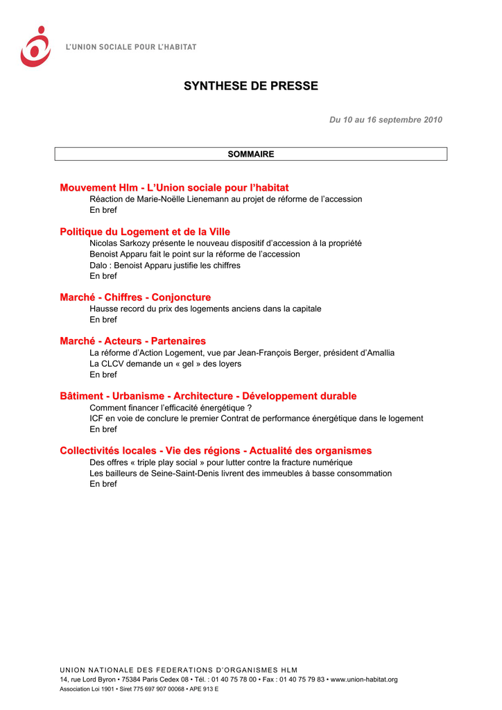 SYNTHESE DE PRESSE Du 10 au 16 septembre 2010 SOMMAIRE Mouvement Hlm - L’Union sociale pour l’habitat Réaction de Marie-Noëlle Lienemann au projet de réforme de l’accession En bref Politique du Logement et de la Ville Nicolas Sarkozy présente le nouveau dispositif d’accession à la propriété Benoist Apparu fait le point sur la réforme de l’accession Dalo : Benoist Apparu justifie les chiffres En bref Marché - Chiffres - Conjoncture Hausse record du prix des logements anciens dans la capitale En bref Marché - Acteurs - Partenaires La réforme d’Action Logement, vue par Jean-François Berger, président d’Amallia La CLCV demande un « gel » des loyers En bref Bâtiment - Urbanisme - Architecture - Développement durable Comment financer l’efficacité énergétique ? ICF en voie de conclure le premier Contrat de performance énergétique dans le logement En bref Collectivités locales - Vie des régions - Actualité des organismes Des offres « triple play social » pour lutter contre la fracture numérique Les bailleurs de Seine-Saint-Denis livrent des immeubles à basse consommation En bref UNION NATIONALE DES FEDERATIONS D’ORGANISMES HLM 14, rue Lord Byron • 75384 Paris Cedex 08 • Tél. : 01 40 75 78 00 • Fax : 01 40 75 79 83 • www.union-habitat.org Association Loi 1901 • Siret 775 697 907 00068 • APE 913 E Mouvement Hlm - L’Union sociale pour l’habitat Réaction de Marie-Noëlle Lienemann au projet de réforme de l’accession La présidente de la FNSCHLM (Fédération nationale des sociétés coopératives d’Hlm), Marie-Noëlle Lienemann considère que cette mesure est de nature à favoriser l’accès à la propriété des ménages à revenus modestes et moyens en particulier sur les territoires où la demande est forte. Néanmoins, l’ancienne ministre du Logement s’interroge sur le sort réservé aux territoires connaissant une moindre pression mais où les besoins sont réels et importants pour les foyers modestes. Par ailleurs, selon elle, cette réforme « cache un désengagement de l’Etat », expliquant que « cette réforme, qui met en œuvre une réorientation partielle des aides à l’accession en direction des couches moyennes et populaires, s’opère avec une baisse considérable des crédits ». « C’est désormais plus d’un milliard d’euros qui manque à la politique d’accession à la propriété », regrette-elle. (AULH. Info, 14/09/10) En bref Du 28 au 30 septembre se tiendra à Strasbourg le Congrès de l’Union sociale pour l’habitat sur le thème : « Une place pour tous dans la Cité ». Les intervenants évoqueront les perspectives d’évolution nécessaires du logement social en présence des représentants d’environ 800 organismes Hlm. (Acteurs publics, Territoires, 01/09/10, Immo Hebdo, 07/09/10) A Strasbourg, évoquant la tenue du Congrès de l’Union sociale pour l’habitat, JeanCharles Quintiliani, conseiller municipal, a critiqué le coût de l’opération (161 000 euros) pour l’ensemble des collectivités alsaciennes. En réponse, l’adjoint au maire, Philippe Bies, a rétorqué : « C’est une fierté d’accueillir un tel Congrès dans un contexte difficile pour le logement social et (…) les répercussions sur la vie économique iront très largement au-delà de l’aide financière ». Il entend par ailleurs « bien batailler contre la ponction qui touchera l’ensemble des bailleurs sociaux ». (DNA, 14/09/10) Le Mouvement Hlm dénonce la politique du Gouvernement en matière de logement social, l’accusant de vouloir l’étrangler en ponctionnant sa trésorerie à hauteur de 340 millions d’euros et en limitant la hausse des loyers. Le président de l’Union sociale pour l’habitat, Thierry Repentin, a précisé : « L’Etat fait le choix de se retirer du secteur du logement social en prévoyant dans le budget 2011 de baisser les « aides à la pierre » à 160 millions d’euros contre 630 millions, y compris le plan de relance, en 2010 ». Des mesures qui hypothèquent la construction de 20 000 logements. (Territoires, 01/09/10, La Lettre de l’Economie Sociale, 09/09/10) LaVieImmo.com informe de la tenue le 7 octobre prochain de la 11ème conférencedébat à Lyon de la société Adéquation, spécialiste des services dédiés aux professionnels de l’immobilier et de l’urbanisme sur le thème « Réforme des aides gouvernementales : facteurs clés d’un développement durable dans le logement neuf ». Une table-ronde autour de Thierry Repentin, président de l’Union sociale pour l’habitat, de représentants de l’Etat et de fédérations professionnelles, s’interrogera sur l’influence des réformes sur le marché de l’immobilier, la solvabilité des ménages et les professionnels. (LavieImmo.com, 10/09/10) Le 16 septembre, l’Agence nationale pour la rénovation urbaine a organisé une conférence dans le cadre du prochain Congrès de l’Union sociale pour l’habitat. (La Correspondance de la Presse, 16/09/10) RETOUR SOMMAIRE UNION NATIONALE DES FEDERATIONS D’ORGANISMES HLM DIRECTION DE LA COMMUNICATION 14, rue Lord Byron • 75384 Paris Cedex 08 • Tél. : 01 40 75 78 00 • Fax : 01 40 75 79 83 • www.union-habitat.org 2 Politique du Logement et de la Ville Nicolas Sarkozy présente le nouveau dispositif d’accession à la propriété Nicolas Sarkozy a annoncé le 14 septembre, à Thiais dans le Val-de-Marne, en présence du ministre de l’Ecologie Jean-Louis Borloo et du secrétaire d’Etat au Logement Benoist Apparu, la réforme des aides publiques à l‘accession à la propriété. « Bombe à retardement fiscale » selon La Tribune, le crédit d’impôt sur les intérêts d’emprunt, s’appliquant à tous les acquéreurs, est abandonné. Dès le mois d’août, la ministre de l’Economie, Christine Lagarde avait annoncé sa suppression pour 2011, dans le cadre des efforts de réduction du déficit budgétaire. Thierry Repentin avai