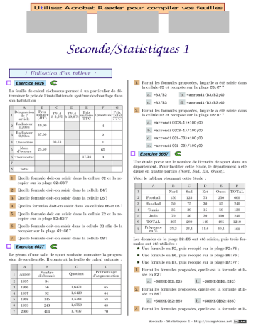 Seconde/Statistiques 1 1. Utilisation d’un tableur : 1. Parmi les formules proposées, laquelle a été saisie dans la cellule C3 et recopiée sur la plage C3:C7 ? Exercice 6026 La feuille de calcul ci-dessous permet à un particulier de déterminer le prix de l’installation du système de chauffage dans son habitation : A B C D E F G Désignation Prix Prix Prix TV A unitaire T V A Quantités Total de l’ à 5,5% à 19,6 % unitaire (HT ) TTC TTC article Radiateur 49,00 2 4 1,20 m 1 Radiateur 0,80 m 3 37,00 Main d’oeuvre 5 d. =arrondi(B2/B3;4) b. =arrondi((C3-1)/100;0) c. =arrondi((1-C3)*100;0) d. =arrondi((1-C3)/100;0) 65 17,34 6 Thermostat Exercice 5687 3 Une étude porte sur le nombre de licenciés de sport dans un département. Pour faciliter cette étude, le département a été divisé en quatre parties (Nord, Sud, Est, Ouest). 7 8 c. =B2/B3 a. =arrondi((C3-1)*100;0) 1 25,50 b. =arrondi(B3/B2;4) 2. Parmi les formules proposées, laquelle a été saisie dans la cellule D3 et recopiée sur la plage D3:D7 ? 2 66,75 4 Chaudière a. =B3/B2 Total 1. Quelle formule doit-on saisir dans la cellule C2 et la recopier sur la plage C2:C3 ? Voici le tableau résumant cette étude : A B C D E F Nord Sud Est Ouest TOTAL Football 150 125 75 250 600 3 Handball 50 75 30 85 240 2. Quelle formule doit-on saisir dans la cellule B4 ? 1 3. Quelle formule doit-on saisir dans la cellule D5 ? 2 4. Quelles formules doit-on saisir dans les cellules B6 et C6 ? 4 Tennis 35 30 15 50 130 5. Quelle formule doit on saisir dans la cellule E2 et la recopier sur la plage E2:E5 ? 5 Judo 70 50 20 100 240 6 TOTAL 305 280 140 485 1210 6. Quelle formule doit-on saisir dans la cellule G2 afin de la recopier sur la plage G2:G6 ? 7 Fréquence en % 25,2 23,1 11,6 40,1 100 7. Quelle formule doit-on saisir dans la cellule G8 ? Exercice 6027 Le gérant d’une salle de sport souhaite connaître la progression de sa clientèle. Il construit la feuille de calcul suivante : A B C D 1 Année Nombre d’abonnés Quotient Pourcentage d’augmentation 2 1995 34 3 1996 56 1,6471 65 4 1997 92 1,6429 64 5 1998 145 1,5761 58 6 1999 243 1,6759 68 7 2000 414 1,7037 70 Les données de la plage B2:E5 ont été saisies, puis trois formules ont été utilisées : Une formule en F2, puis recopié sur la plage F2:F5 ; Une formule en B6, puis recopié sur la plage B6:F6 ; Une formule en B7, puis recopié sur la plage B7:F7 ; 1. Parmi les formules proposées, quelle est la formule utilisée en F2 ? a. =SOMME(B2:E2) b. =SOMME(B$2:E$2) 2. Parmi les formules proposées, quelle est la formule utilisée en B6 ? a. =SOMME(B2:B5) b. =SOMME($B2:$B5) 3. Parmi les formules proposées, quelle est la formule utiliSeconde - Statistiques 1 - http://chingatome.net sée en B7 ? A a. =ARRONDI(B6/F6;2) b. =ARRONDI(B6/F$6;2) 1 c. =ARRONDI(B6/$F6;2) d. =ARRONDI(B$6/F6;2) 2 Exercice 6028 Une fabrique de boules de pétanque a testé ces chaînes de fabrication en relevant les poids et les diamètres des boules produites au cours d’une même journée. Les résultats ont été inscrits dans la feuille de calcul ci-dessous : Masse (en g) \ Diamètre (mm) 700 720 745 Total 3 4 5 6 7 8 C D E 71 75 79 Total 2 157 3 003 2 124 7 284 3 123 4 122 2 982 10 227 1 803 2 310 1 923 6 036 7 083 9 435 7 029 23 547 Tableau 2 : en pourcentage par rapport Masse (en g) \ 71 75 Diamètre (mm) 9,2 13,3 700 12,8 17,5 720 12,7 745 9 30,9 43,4 Total 9 10 11 12 13 1. B Tableau 1 : effectif à l’effectif total 79 Total 7,7 9,8 8,2 25,6 30,1 40,1 29,9 100 % a. Quelle formule a été saisie dans la cellule E3 puis recopier sur la plage E3:E6 ? b. Quelle formule a été saisie dans la cellule B6 puis recopier sur la plage B6:D6 ? 2. Quelle formule a été saisie dans la cellule B10, puis recopier sur la plage B10:E13 ? (sans oublier l’arrondi effectué par la feuille de calcul) % 2. Rappels : pourcentage : Fo otb all 12 % On a demandé a des étudiants d’indiquer leur couleur préférée parmi le rouge, le vert, le bleu et le jaune. Les résutlats de cette étude est donnée dans le diagramme ci-dessous : 32 Exercice 222 l al lle yB Vo ni Ten e 10 s 22 % % 16 % Malheureusement la graduation de l’axe des ordonnées a été effacée. s an u ne Ble Jau 8% D rt Ve e Judo e ug Ro Autr 1. Quel est le pourcentage des personnes ayant choisies la couleur “rouge”. 1. Cette étude a portée sur une population dont l’effectif total était de 879 individus. Compléter le tableau des effectifs, à l’unité près : 2. Dresser le diagramme circulaire correspondant à cette étude. Sport Exercice 226 Dans un établissement, une étude a porté sur le sport préféré des adolescents de 14 ans et 16 ans. Les résultats sont résumés dans le diagramme ci-dessous : Volley Football Tennis ball Judo Danse Autre Effectif 2. Compléter le graphique ci-dessous pour obtenir le diagramme en baton associé à cette série statistique. Seconde - Statistiques 1 - http://chingatome.net 300 chacun d’eux ? Exercice 228 250 Un métal précieux est obtenu par un mélange dont le poid est constitué de 60 % de cuivre et de 40 % d’argent. 100 g de cuivre coûte 2 euros et 100 g d’argent coûte 25 euros. 200 150 1. 100 a. Un bijoutier confectionne une bague de 120 g de cet alliage. Calculer le prix de revient de cette bague. 50 0 all all nis e-B ootb Ten y l l F Vo re se do Ju Dan Aut b. Souhaitant réaliser un bénéfice de 15 % sur la vente de la bague, quel doit être le prix de vente de cette bague ? 2. Sur un an, les cours des métaux précieux ont évolués : le cuivre a augmenté de 30 % et l’argent de 7 %. Exercice 231 Le tableau ci-dessous donne les prix du litre d’essence trois années distinctes : a. Déterminer le nouveau prix de confection de cette bague. Année 1973 1980 1998 b. Donner le pourcentage d’augmentation du prix de confection de cette bague sur un an. Prix (en centimes) 121 327 638 Exercice 3077 On donnera les résultats aux questions suivantes arrondies au dixième près. 1. Cal