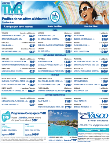 1 Profitez de nos offres alléchantes ! Prix « à partir de » Pour fuir l’hiver Soldes des fêtes À quelques jours de vos vacances CUBA VARADERO 2 novembre au 10 décembre 648 898$ $ Arenas doradas hoteles C 3,5H Iberostar laguna azul 4,5H CAYO LARGO 4 novembre au 9 décembre CAYO SANTA MARIA PUNTA CANA 798 gran bahia principe bavaro premier 4,5H 898$ PUERTO PLATA $ 1 novembre au 8 décembre er 628 $ Casa Marina beach Resort 3H RIVIERA MAYA / CANCUN 9 novembre au 10 décembre 998 $ Gran bahia principe coba premier 4,5H 20 décembre 1 098 CAYO COCO 1 258 $ VARADERO 7 au 21 janvier 678$ 878$ Villa Cuba 4H Barcelo Arenas Blancas 4H HOLGUIN 10 au 24 janvier 968$ Playa costa verde 4H CAYO COCO 10 au 24 janvier 1 048$ Hotel Playa coco 4H RÉpublique dominicaine PUNTA CANA 21 décembre 1 448 1 948$ $ Alisios bavaro 3,5H Caribe Club princess resort 3,5H PUERTO PLATA 20 décembre 1 368 $ Bahia principe san juan premier 3,5H mexique RIVIERA MAYA / CANCUN 21 décembre 1 498 1 798$ $ Real playa del carmen hotel 3,5H 1 048 $ $ 20 décembre occidental grand nuevo vallarta 4,5H 2 novembre au 7 décembre HOLGUIN occidental grand xcaret 4,5H villas vallarta by canto del sol 3H 1 068$ Grand sirenis riviera maya 4,5H PUERTO VALLARTA Sol Sirenas coral resort 4H 668 26 octobre au 10 décembre Sirenis cocotal Beach Resort 4H Sol Cayo Coco 4H $ 1 178 1 268$ $ 638 26 octobre au 7 décembre Sol Cayo santa maria 3,5H 21 décembre Allegro varadero 3,5H Club amigo atlantico guardalavaca 3H $ Playa Blanca 4H VARADERO PUERTO VALLARTA 20 décembre 1 728 $ PUNTA CANA 15 au 22 janvier 1 198$ 1 398$ VIK Arena blanca punta cana 4H Grand Palladium punta cana 4,5H PUERTO PLATA 10 au 24 janvier 1 028$ Lifestyle tropical beach resort 4H RIVIERA MAYA / CANCUN 9 au 23 janvier krystal cancun 4H Sandos caracol Eco resort & Spa 4H ACAPULCO 1 178$ 1 378$ 9 au 30 janvier 998$ Ritz acapulco 3,5H autres destinations PANAMA 5 novembre au 10 décembre intercontinental playa bonita 4,5H westin playa bonita 5H 858$ 928$ HONDURAS 20 décembre 1 188$ Villas telamar 4H PANAMA 18 décembre intercontinental playa bonita 4,5H 1 178$ HONDURAS 10 au 31 janvier 948$ Villas telamar 4H NICARAGUA 8 au 24 janvier BArcelo montelimar 4H 1 198$ Programme Compagnon TMR Plus de 10 bénéfices, dont un pouvant aller jusqu’à une valeur de 500$ cuba varadero 14 au 21 janvier Panama 14 au 21 janvier Allegro varadero 3,5H westin playa bonita 5H à partir de 898$ à partir de 1 088$ Pour bénéficier des avantages du programme Compagnon TMR, vous devez réserver votre voyage au moins 60 jours avant la date de départ pour un séjour effectué entre le 1er novembre 2012 et le 31 octobre 2013. La totalité du paiement de votre voyage doit également être acquitté plus de 60 jours avant le départ. & l’Univers de la Croisière 1-888-628-2726 voyagevasco.com consultez votre conseiller en voyages ou visitez le CUBA CAYO SANTA MARIA 9 au 16 janvier Melia Las Dunas 4,5H à partir de 1 198$ prix comprend : Les taxes aéroportuaires, la surcharge de carburant, la TPS et la TVQ, le vol, 7 nuits d’hébergement, repas en formule tout compris ou tel que spécifié. Prix par pers. occ. double. Ne comprend pas : Les frais de contribution au Fonds d’indemnisation des clients des agents de voyages de 2,00$ par 1 000$. Espace Limité. Prix sujets à changement. Taxes comprises. Départs de Montréal. Valide pour nouvelles réservations jusqu’au 21/10/2012. Certaines conditions s ’appliquent. Titulaire d’un permis du québec. Get a hold of our awesome offers ! Prices « starting at » A few days away Holiday specials Escape winter CUBA VARADERO November 2 to December 10 648 898 VARADERODecember 21 Arenas doradas hoteles C 3,5H $ Allegro varadero 3,5H Iberostar laguna azul 4,5H $ Sol Sirenas coral resort 4H CAYO LARGO November 4 to December 9 Playa Blanca 4H 638 $ CAYO SANTA MARIAOctober 26 to December 7 668 $ Sol Cayo santa maria 3,5H 1 178 1 268 $ $ CAYO COCODecember 20 CAYO COCOJanuary 10 to 24 1 258 $ Sol Cayo Coco 4H DOMINICAN REPUBLIC PUERTO PLATA PUERTO PLATADecember 20 628 $ Casa Marina beach Resort 3H MAYAN RIVIERA / CANCUN November 9 to December 10 Gran bahia principe coba premier 4,5H Grand sirenis riviera maya 4,5H PUERTO VALLARTA 998 $ 1 068 $ November 2 to December 7 villas vallarta by canto del sol 3H PANAMA 1 048 $ November 5 to December 10 intercontinental playa bonita 4,5H westin playa bonita 5H 858 $ 928 $ Playa costa verde 4H 1 098 Alisios bavaro 3,5H November 1st to December 8 $ Club amigo atlantico guardalavaca 3H $ 798 Gran bahia principe bavaro premier 4,5H $ 898 $ $ Barcelo Arenas Blancas 4H HOLGUINJanuary 10 to 24 PUNTA CANADecember 21 678 878 Villa Cuba 4H HOLGUINDecember 20 PUNTA CANAOctober 26 to December 10 Sirenis cocotal Beach Resort 4H VARADEROJanuary 7 to 21 1 448 $ 1 948 $ Caribe Club princess resort 3,5H 1 368 $ Bahia principe san juan premier 3,5H MEXICO MAYAN RIVIERA / CANCUNDecember 21 1 498 $ 1 798 $ Real playa del carmen hotel 3,5H occidental grand xcaret 4,5H PUERTO VALLARTADecember 20 occidental grand nuevo vallarta 4,5H OTHER DESTINATIONS 1 728 $ HONDURASDecember 20 PUNTA CANAJanuary 15 to 22 $ Grand Palladium punta cana 4,5H PUERTO PLATAJanuary 10 to 24 1 028 $ Lifestyle tropical beach resort 4H MAYAN RIVIERA / CANCUNJanuary 9 to 23 krystal cancun 4H 1 178 1 378 $ Sandos caracol Eco resort & Spa 4H $ ACAPULCOJanuary 9 to 30 998 $ Ritz acapulco 3,5H HONDURASJanuary 10 to 31 1 178 BArcelo montelimar 4H $ 1 198 1 398 $ VIK Arena blanca punta cana 4H Villas Telamar 4H PANAMADecember 18 intercontinental playa bonita 4,5H 1 048 $ 1 188 $ Villas Telamar 4H Hotel Playa coco 4H 968 $ 948 $ NICARAGUAJanuary 8 to 24 1 198 $ TMR Companion Program More than 10 benefits, including one that goes up to a $500 value. Cuba Varadero january 14 to 21 PANAMA january 14 to 21 Allegro varadero 3,5H Westin playa bonita 5H starting at 898 $ starting at 1 088 $ To take advantage of the TMR Companion Program, your trip must be booked at least