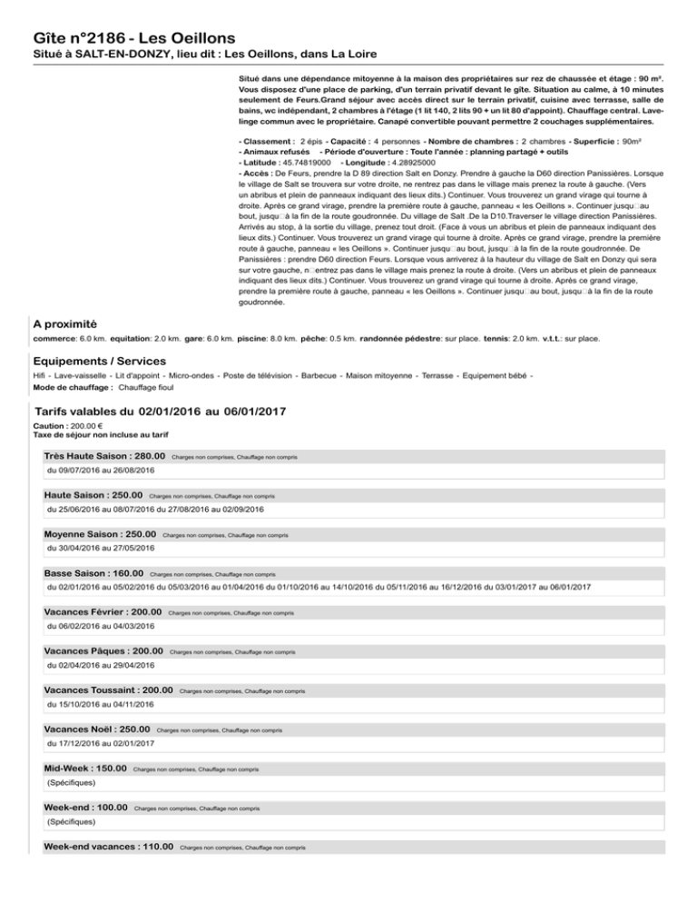 Gîte n°2186 - Les Oeillons Situé à SALT-EN-DONZY, lieu dit : Les Oeillons, dans La Loire Situé dans une dépendance mitoyenne à la maison des propriétaires sur rez de chaussée et étage : 90 m². Vous disposez d'une place de parking, d'un terrain privatif devant le gîte. Situation au calme, à 10 minutes seulement de Feurs.Grand séjour avec accès direct sur le terrain privatif, cuisine avec terrasse, salle de bains, wc indépendant, 2 chambres à l'étage (1 lit 140, 2 lits 90 + un lit 80 d'appoint). Chauffage central. Lavelinge commun avec le propriétaire. Canapé convertible pouvant permettre 2 couchages supplémentaires. - Classement : 2 épis - Capacité : 4 personnes - Nombre de chambres : 2 chambres - Superficie : 90m² - Animaux refusés - Période d'ouverture : Toute l'année : planning partagé + outils - Latitude : 45.74819000 - Longitude : 4.28925000 - Accès : De Feurs, prendre la D 89 direction Salt en Donzy. Prendre à gauche la D60 direction Panissières. Lorsque le village de Salt se trouvera sur votre droite, ne rentrez pas dans le village mais prenez la route à gauche. (Vers un abribus et plein de panneaux indiquant des lieux dits.) Continuer. Vous trouverez un grand virage qui tourne à droite. Après ce grand virage, prendre la première route à gauche, panneau « les Oeillons ». Continuer jusqu�au bout, jusqu�à la fin de la route goudronnée. Du village de Salt .De la D10.Traverser le village direction Panissières. Arrivés au stop, à la sortie du village, prenez tout droit. (Face à vous un abribus et plein de panneaux indiquant des lieux dits.) Continuer. Vous trouverez un grand virage qui tourne à droite. Après ce grand virage, prendre la première route à gauche, panneau « les Oeillons ». Continuer jusqu�au bout, jusqu�à la fin de la route goudronnée. De Panissières : prendre D60 direction Feurs. Lorsque vous arriverez à la hauteur du village de Salt en Donzy qui sera sur votre gauche, n�entrez pas dans le village mais prenez la route à droite. (Vers un abribus et plein de panneaux indiquant des lieux dits.) Continuer. Vous trouverez un grand virage qui tourne à droite. Après ce grand virage, prendre la première route à gauche, panneau « les Oeillons ». Continuer jusqu�au bout, jusqu�à la fin de la route goudronnée. A proximité commerce: 6.0 km. equitation: 2.0 km. gare: 6.0 km. piscine: 8.0 km. pêche: 0.5 km. randonnée pédestre: sur place. tennis: 2.0 km. v.t.t.: sur place. Equipements / Services Hifi - Lave-vaisselle - Lit d'appoint - Micro-ondes - Poste de télévision - Barbecue - Maison mitoyenne - Terrasse - Equipement bébé Mode de chauffage : Chauffage fioul Tarifs valables du 02/01/2016 au 06/01/2017 Caution : 200.00 € Taxe de séjour non incluse au tarif Très Haute Saison : 280.00 Charges non comprises, Chauffage non compris du 09/07/2016 au 26/08/2016 Haute Saison : 250.00 Charges non comprises, Chauffage non compris du 25/06/2016 au 08/07/2016 du 27/08/2016 au 02/09/2016 Moyenne Saison : 250.00 Charges non comprises, Chauffage non compris du 30/04/2016 au 27/05/2016 Basse Saison : 160.00 Charges non comprises, Chauffage non compris du 02/01/2016 au 05/02/2016 du 05/03/2016 au 01/04/2016 du 01/10/2016 au 14/10/2016 du 05/11/2016 au 16/12/2016 du 03/01/2017 au 06/01/2017 Vacances Février : 200.00 Charges non comprises, Chauffage non compris du 06/02/2016 au 04/03/2016 Vacances Pâques : 200.00 Charges non comprises, Chauffage non compris du 02/04/2016 au 29/04/2016 Vacances Toussaint : 200.00 Charges non comprises, Chauffage non compris du 15/10/2016 au 04/11/2016 Vacances Noël : 250.00 Charges non comprises, Chauffage non compris du 17/12/2016 au 02/01/2017 Mid-Week : 150.00 Charges non comprises, Chauffage non compris (Spécifiques) Week-end : 100.00 Charges non comprises, Chauffage non compris (Spécifiques) Week-end vacances : 110.00 Charges non comprises, Chauffage non compris (Spécifiques) Juin Septembre : 250.00 Charges non comprises, Chauffage non compris du 28/05/2016 au 24/06/2016 du 03/09/2016 au 30/09/2016 Options et suppléments : Forfait ménage (optionnel). : 45.00 € pour le séjour Paire de draps pour lit 1 personne (optionnel) : 5.00 € pour le séjour Paire de draps pour lit 2 personnes (optionnel) : 7.00 € pour le séjour Taxe de séjour (obligatoire) : 0.60 € pour 1 nuit Forfait charges/chauffage sem (selon la période) : 45.00 € pour le séjour Forfait charges/chauffage we (selon la période) : 20.00 € pour le séjour Contacts Coordonnées de la centrale Coordonnées du propriétaire GITES DE FRANCE LOIRE RHONE-ALPES 43, Avenue Albert Raimond BP 20048 42270 ST-PRIEST-EN-JAREZ Téléphone : 04 77 79 18 49 Site internet : http://www.gites-de-france-loire.com RAYMOND Berengère Sylvain Les Oeillons 42110 SALT-EN-DONZY Téléphone : 04 77 27 88 96 Portable : 06 81 34 04 25 Email: [email protected] Site internet : http://giteruraldesoeillons.jimdo.com Album photo Détail des pièces 1 : Séjour Fenêtres : 2 Vue : Campagne Orientation :Est 2 : Cuisine Fenêtres : 2 Vue : Cour Orientation :Est 3 : Salle de Bain Fenêtre : 1 Vue : Aucune vue Orientation :Est possède une baignoire 4 : WC Surface 2.00 m² Fenêtre : 1 Vue : Aucune vue Orientation :Ouest possède un wc 5 : Chambre - Niveau 1 Fenêtre : 1 Vue : Campagne Orientation :Est lit de 90 : 2 6 : Chambre - Niveau 1 Fenêtre : 1 Vue : Campagne Orientation :Ouest lit de 140 : 1