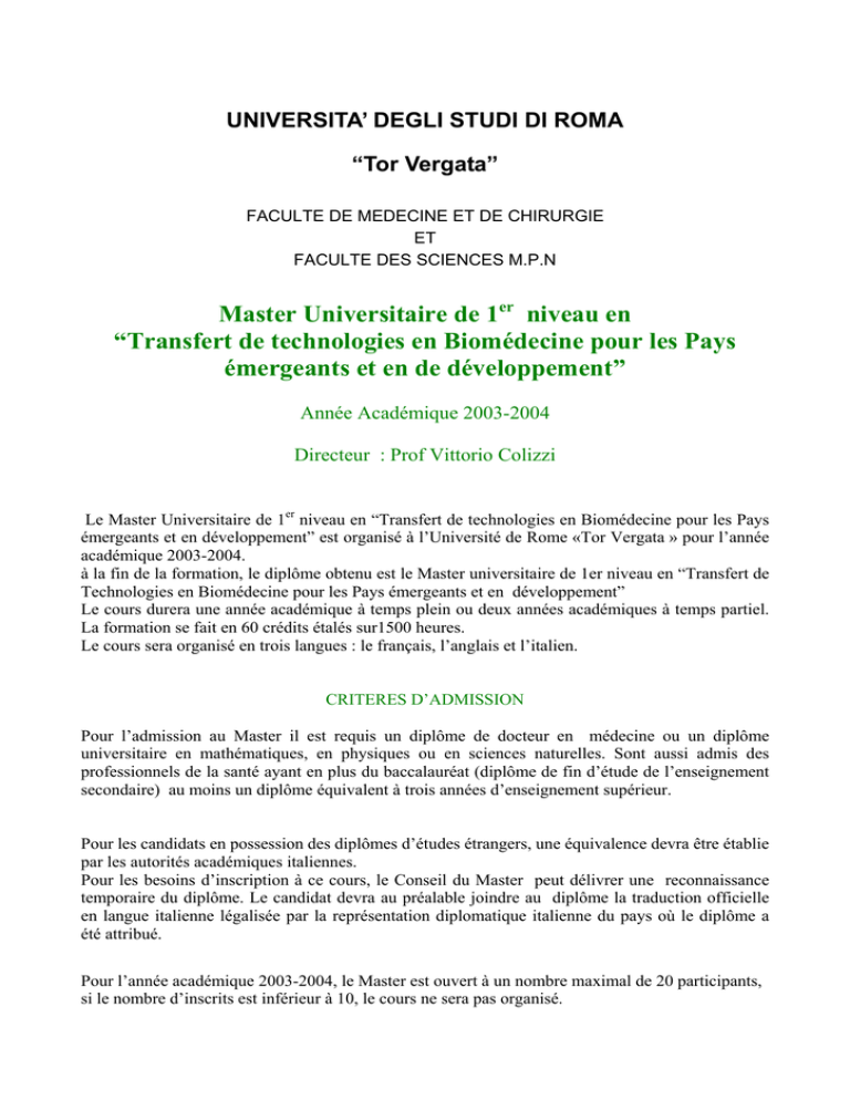 UNIVERSITA’ DEGLI STUDI DI ROMA “Tor Vergata” FACULTE DE MEDECINE ET DE CHIRURGIE ET FACULTE DES SCIENCES M.P.N Master Universitaire de 1er niveau en “Transfert de technologies en Biomédecine pour les Pays émergeants et en de développement” Année Académique 2003-2004 Directeur : Prof Vittorio Colizzi Le Master Universitaire de 1er niveau en “Transfert de technologies en Biomédecine pour les Pays émergeants et en développement” est organisé à l’Université de Rome «Tor Vergata » pour l’année académique 2003-2004. à la fin de la formation, le diplôme obtenu est le Master universitaire de 1er niveau en “Transfert de Technologies en Biomédecine pour les Pays émergeants et en développement” Le cours durera une année académique à temps plein ou deux années académiques à temps partiel. La formation se fait en 60 crédits étalés sur1500 heures. Le cours sera organisé en trois langues : le français, l’anglais et l’italien. CRITERES D’ADMISSION Pour l’admission au Master il est requis un diplôme de docteur en médecine ou un diplôme universitaire en mathématiques, en physiques ou en sciences naturelles. Sont aussi admis des professionnels de la santé ayant en plus du baccalauréat (diplôme de fin d’étude de l’enseignement secondaire) au moins un diplôme équivalent à trois années d’enseignement supérieur. Pour les candidats en possession des diplômes d’études étrangers, une équivalence devra être établie par les autorités académiques italiennes. Pour les besoins d’inscription à ce cours, le Conseil du Master peut délivrer une reconnaissance temporaire du diplôme. Le candidat devra au préalable joindre au diplôme la traduction officielle en langue italienne légalisée par la représentation diplomatique italienne du pays où le diplôme a été attribué. Pour l’année académique 2003-2004, le Master est ouvert à un nombre maximal de 20 participants, si le nombre d’inscrits est inférieur à 10, le cours ne sera pas organisé. Dans le cas où le nombre des demandes d'inscription dépasserait le nombre des postes disponibles, l’admission sera subordonnée à une sélection sur la base des critères suivants : Diplômes d’études, titres scientifiques (publications), expériences spécifiques antérieures. Pendant toute la durée de la formation, l’inscription à un autre cours n’est pas autorisée DEMANDE D’ADMISSION Les candidats devront avant le 30/3/2004 : 1- Remplir la demande disponible sur Internet dans le site : www.uniroma2.it selon la procédure : “immatricolazioni ed iscrizioni on line ”- “Concorsi Riconoscimenti Selezioni” – “Concorsi/Riconoscimenti” – “inizia la procedura di iscrizione al concorso” – “Concorsi, corsi di perfezionamento, Master” – “Facoltà di Medicina e Chirurgia” – Master in “Trasferimento tecnologico in Biomedicina per i Paesi emergenti ed in via di sviluppo”. 2- Faire parvenir une auto-certification des titres et des diplômes avec les transcripts 3- Préparer un Curriculum vitae attestant des critères précédemment requis et une déclaration personnelle de moins de 750 mots expliquant comment le candidat entend développer son activité « d’opérateur » de transfert de technologies en biomédecine. 4- La dite documentation doit être présentée personnellement ou envoyée par lettre recommandée à l’adresse suivante : Università degli Studi di Roma “Tor Vergata” – Div. I – Ripart. III – Settore I Segreteria Corsi di Perfezionamento e Master Universitari, Via O. Raimondo 18 – 00173 ROMA. Les candidats extracommunautaires de l’Union Européenne résidents à l’étranger passeront la demande via la représentation diplomatique italienne de leur pays de résidence. Ils devront joindre à leurs diplômes les traductions officielles en langue italienne, les légalisations et les déclarations de valeurs. Une copie de la demande devra être envoyée par E-mail à l’adresse : [email protected] La liste des candidats admis à suivre le cours sera publiée le 05 avril 2004 auprès du secrétariat « dei corsi di perfezionamento e Master universitari » et sur le site Internet : www.uniroma2.it; Le résultat de la sélection aussi communiqué individuellement par mail aux candidats Les candidats admis devront compléter leur inscription avant le 30 avril 2004. Les frais d’inscriptions s’élèvent 2.000 Euro et devront être versé en deux tranches. La première au moment de l’inscription et la deuxième avant le 1/9/2004. En cas de financement par un organisme, le payement doit se faire avant la fin du cours par virement bancaire à “l’Agenzia n.75 delle banca di Roma – c/c 50000/76 ABI 03022 CAB 03255” en prenant soin d’indiquer le motif du versement, le titre du Master et le nom du candidat. Pour les handicapés avec une invalidité reconnue égale ou supérieure à 66%, une exonération des frais d’inscription peut leur être faite et ils seront autorisés à payer seulement une somme de 100 Euro. INSCRIPTION Les candidats selectionés devront compléter leur inscription via le web ou en utilisant les terminaux self-services de la faculté de médecine et de chirurgie ou ceux de la faculté des sciences suivant la procédure on line décrite ci-dessous : 1- Remplir le formulaire de la demande d’inscription accessible sur le site Internet www.uniroma2.it en sélectionnant dans l’ordre: “Immatricolazioni ed iscrizioni on-line” “Immatricolazione” - “Corsi di perfezionamento” - “ Facoltà di Medicina e Chirurgia”; “Master in Trasferimento tecnologico in Biomedicina per i Paesi emergenti ed in via di sviluppo”. À la fin du remplissage du formulaire de la demande, un code nommé CTRL apparaîtra sur l’écran. Ce code devra être absolument mémorisé avant de procéder à l’impression de la demande et du bulletin. Il aidera à résoudre d’éventuels problèmes