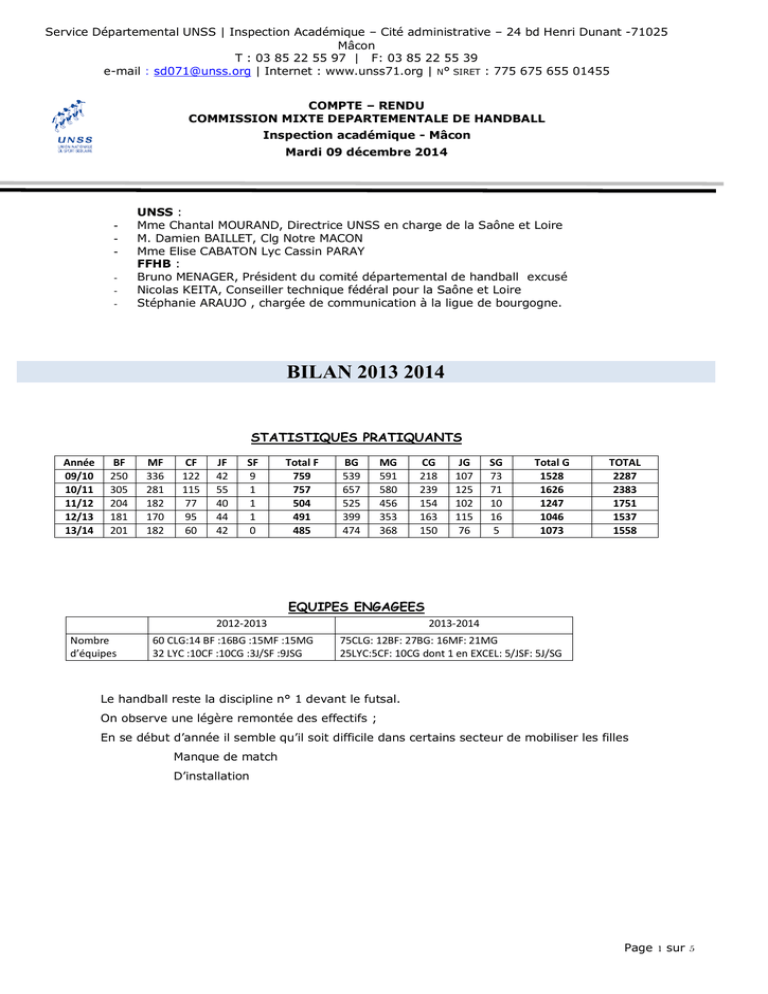 Service Départemental UNSS | Inspection Académique – Cité administrative – 24 bd Henri Dunant -71025 Mâcon T : 03 85 22 55 97 | F: 03 85 22 55 39 e-mail : [email protected] | Internet : www.unss71.org | N° SIRET : 775 675 655 01455 COMPTE – RENDU COMMISSION MIXTE DEPARTEMENTALE DE HANDBALL Inspection académique - Mâcon Mardi 09 décembre 2014 - UNSS : Mme Chantal MOURAND, Directrice UNSS en charge de la Saône et Loire M. Damien BAILLET, Clg Notre MACON Mme Elise CABATON Lyc Cassin PARAY FFHB : Bruno MENAGER, Président du comité départemental de handball excusé Nicolas KEITA, Conseiller technique fédéral pour la Saône et Loire Stéphanie ARAUJO , chargée de communication à la ligue de bourgogne. BILAN 2013 2014 STATISTIQUES PRATIQUANTS Année 09/10 10/11 11/12 12/13 13/14 BF 250 305 204 181 201 MF 336 281 182 170 182 CF 122 115 77 95 60 JF 42 55 40 44 42 SF 9 1 1 1 0 Total F 759 757 504 491 485 BG 539 657 525 399 474 MG 591 580 456 353 368 CG 218 239 154 163 150 JG 107 125 102 115 76 SG 73 71 10 16 5 Total G 1528 1626 1247 1046 1073 TOTAL 2287 2383 1751 1537 1558 EQUIPES ENGAGEES 2012-2013 Nombre d’équipes 60 CLG:14 BF :16BG :15MF :15MG 32 LYC :10CF :10CG :3J/SF :9JSG 2013-2014 75CLG: 12BF: 27BG: 16MF: 21MG 25LYC:5CF: 10CG dont 1 en EXCEL: 5/JSF: 5J/SG Le handball reste la discipline n° 1 devant le futsal. On observe une légère remontée des effectifs ; En se début d’année il semble qu’il soit difficile dans certains secteur de mobiliser les filles Manque de match D’installation Page 1 sur 5 CLG BG & BF CLG MG & MF LYCEES CADETS LYCEES CADETTES LYCEES JUNIORS G & F R.Vailland SANVIGNES BG/BF R.Boyer CUISEAUX MG / MF Balleure CHALON E.Gauthey CHALON LM.AUTUN +JF J.Prévert CHALON 3BG/BF L.Aragon CHATENOY MG / MF E.Gauthey CHALON+ EXCEL J.Wittmer CHAROLLES LEGTA FONTAINES JG +2JF J.Moulin MARCIGNY BG/BF D.N SENNECEY MG J.Wittmer CHAROLLESX2 H.Pariat MONTCEAU Mathias CHALON JG Copernic ST VALLIER BG/BF Copernic ST VALLIER 2MG / 2MF LM.AUTUN X2 LEGTA FONTAINES H.Parriat MONTCEAU JG/JF CM. AUTUN BG/BF Pasteur ST REMY2 MG / MF H.Pariat MONTCEAU Bonaparte AUTUN R.Cassin MACON JF L.Aragon CHATENOY 3 BG Le devoir CHALON MG LEGTA FONTAINES H.Vincenot LOUHANS 2BG/2 BF R.Doisneau CHALONMGEXCEL R.Boyer CUISEAUX BG T.Dumorey CHALON JG R.Cassin MACON Semprun GUEUGNON MG/MF Pasteur ST REMYBG/BF CM AUTUN MF/2 MG Semprun GUEUGNON BG P.Faure CHAUFFAILLES MG Bréart MACON BG ST GERMAIN du PLAIN MF N.Dame MACON 2BG/ BF Centre LE CREUSOT MG/MF J.Vilar CHALON BG N.Dame MACON MG/MF St Dominique CHALON 2BG Les Dîmes CUISERY MG/MF La Varandaine BUXY BG R.Vaillant SANVIGNES2 MF La Chataigneraie AUTUN BF ST Eupéry MONTCEAU 2MG Ste Marie LA CLAYETTE BF Prévert CHALON MG/MF R.Doisneau CHALON BG P.Prétan GIVRY MG Les Epontots LONTCENIS BF J.Vilar CHALON MG Les Epontots LONTCENIS MG St Gilbert MONTCEAU MG St Cyr MATOUR MF LES MEILLEURS RESULTATS ACADEMIQUE R.Boyer CUISEAUX MF 2ème ACADEMIQUE L.Aragon CHATENOY MG 2ème ACADEMIQUE R.Doisneau CHALON MG EXCEL 3ème H.Parriat MONTCEAU CF 4ème FRANCE E.Gauthey CHALON CG 15ème ACADEMIQUE LEGTA FONTAINES J/SG 4ème E.Gauthey CHALON CG 4ème EXCEL ACADEMIQUE FRANCE Les actions particulières: Match de gala + tournoi Benjamines (5 équipes 37 BF) et Minimes Filles (4 équipes) Jeunes officiels Année Nombre de JO HB 2010-2011 558 2011-2012 553 2012-2013 329 2013-2014 300 Page 2 sur 5 Niveau acquis en 2013-2014 et recensés sur OPUSS: 245 districts, 47 départementales, 6 académiques ,2 niveau national. Avec la réserve des JOFF non rentrés. Sur les 5 dernières années : Nombre de Jeunes officiels formés en Hand Ball 701 Rappel : un jeune officiel doit être non joueur à partir du niveau académique. Au niveau départemental, il peut être joueur Journée de Formation UNSS : DISTRICTS : A l’initiative des districts ou des établissements. DEPARTEMENTALE La journée départementale UNSS a eu lieu le mercredi 15 janvier 2014 sur le district de CHALON. L’intervention des membres du Comité a été très appréciée Constats pour programmer 2015 : pour la journée de formation départementale : La formation en janvier tombe très bien : formation à maintenir à cette période. La repousser d’une semaine 21 janvier - Beaucoup de monde, les professeurs ont du mal à se séparer de leurs élèves quand il faut aller sur plusieurs gymnases. - Récompenses : sifflets, tours de cou et cartons à poursuivre. Les plus grosses difficultés pour les jeunes arbitres restent les mêmes : se placer et se déplacer point important à travailler : communiquer et se faire comprendre. Donc reconnaître et signaler avec le bon geste : siffler instantanément, prise de décision rapide Problème : Comment augmenter les temps de pratique des JOFF pendant la formation et durant l’année pour les rendre efficaces et sur d’eux ? PROJET 2014-2015 JOURNEE DU SPORT SCOLAIRE 2014 A L’initiative des districts : Tournoi à l’initiative des établissements pour enclencher la pratique : 10 établissements environ nous l’on fait connaitre. Page 3 sur 5 JEUNES OFFICIELS - Niveau district avant les vacances de Noel : Autonomie des districts. - Niveau départementale: la journée de formation départementale aura lieu le mercredi 21 janvier 2015 sur le district de CHALON. Ouvert à qui ? A ceux qui ont déjà un niveau district ? Engagement nominatif sur OPUSS - Apport du comité. - Chaque Coordonnateur envoie à Nicolas ses matches et salles de début janvier pour une intervention avant le 21 janvier . ACTIONS PARTICULIERES : - Championnat UNSS : La commission arbitrage du Comité pourra assurer des formations / évaluations / suivis lors des Championnats UNSS en fonction des disponibilités. - Participation de l’UNSS aux stages d’arbitrage fédéraux : elle est toujours possible et à encourager. Stage ouvert aux jeunes de l'UNSS niveau 2. - Questionnaire construit par Damien sur le bilan des années antérieures. - Plaquette : à renouveler ci-pos