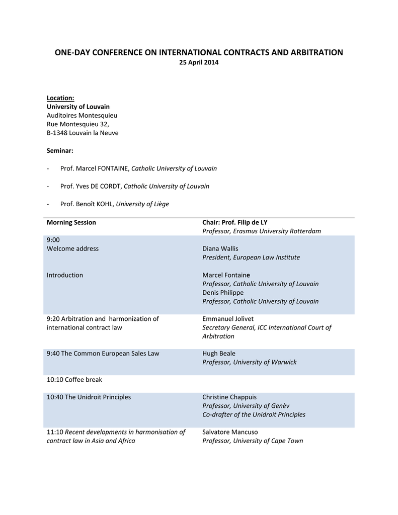 ONE-DAY CONFERENCE ON INTERNATIONAL CONTRACTS AND ARBITRATION 25 April 2014 Location: University of Louvain Auditoires Montesquieu Rue Montesquieu 32, B-1348 Louvain la Neuve Seminar: - Prof. Marcel FONTAINE, Catholic University of Louvain - Prof. Yves DE CORDT, Catholic University of Louvain - Prof. Benoît KOHL, University of Liège Morning Session 9:00 Welcome address Chair: Prof. Filip de LY Professor, Erasmus University Rotterdam Diana Wallis President, European Law Institute Introduction Marcel Fontaine Professor, Catholic University of Louvain Denis Philippe Professor, Catholic University of Louvain 9:20 Arbitration and harmonization of international contract law Emmanuel Jolivet Secretary General, ICC International Court of Arbitration 9:40 The Common European Sales Law Hugh Beale Professor, University of Warwick 10:10 Coffee break 10:40 The Unidroit Principles Christine Chappuis Professor, University of Genèv Co-drafter of the Unidroit Principles 11:10 Recent developments in harmonisation of contract law in Asia and Africa Salvatore Mancuso Professor, University of Cape Town 11:40 Panel Guy Horsmans, Professor, former Dean of the Louvain Law Faculty Patrick Wery Professor, University of Louvain Bernard Remiche, Professor at the University of Louvain Patrick Marchandise Corporate Counsel, former President of the Institut belge des juristes d’entreprise 12:30 Lunch Afternoon Session Chair: Benoît Kohl Professor, University of Liège 14:00 Relations civil law/common law Michele Schmiegelow Professor, University of Louvain 14:30 Ethics and international trade law Philippe Coppens Professor, University of Louvain 15:00 Arbitration J.F. Tossens Professor, University of Louvain J. Kleinheisterkamp Professor, London School of Economics and the University of Louvain 15:30 Coffee break 16:00 Panel G.A. Dal Professor, University of Louvain Guy Keutgen Professor, University of Louvain Didier Matray Professor, University of Liège 17:00 Closing remarks Marcel Fontaine Professor, Catholic University of Louvain Denis Philippe Professor, Catholic University of Louvain