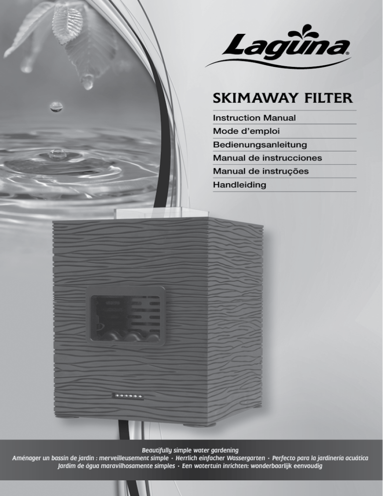 SKIMAWAY FILTER Instruction Manual Mode d’emploi Bedienungsanleitung Manual de instrucciones Manual de instruções Handleiding Beautifully simple water gardening Aménager un bassin de jardin : merveilleusement simple • Herrlich einfacher Wassergarten • Perfecto para la jardinería acuática Jardim de água maravilhosamente simples • Een watertuin inrichten: wonderbaarlijk eenvoudig ENGLISH As with all our pond products, the Laguna SkimAway Filter is designed to make your water gardening experience as simple and enjoyable as possible. Proper installation of this unit will provide several benefits, including clear and healthy pond water, low maintenance, and, of course, a pleasant water garden environment for you and your family to enjoy and be proud of. The SkimAway Filter is designed for ponds up to 500 U.S. gallons (1890 litres). If you have a larger pond, two or more units can be installed to increase the level of filtration. This manual covers all aspects of installing the SkimAway Filter, safeguards, how to maintain and store your filter as well as specific complementary products. Read and understand these instructions thoroughly before beginning installation. IMPORTANT SAFETY INSTRUCTIONS WARNING - To guard against injury, basic safety precautions should be observed, including the following: 1. READ AND FOLLOW ALL SAFETY INSTRUCTIONS and all the important notices on the pump before use. Failure to do so may result in damage to this pump. 2. DANGER –To avoid possible electric shock, special care should be taken since water is employed in the use of pond equipment. Do not attempt repairs yourself; return the appliance to an authorized service facility for service or discard the appliance. IMPORTANT: Electrical supply to the power adaptor should only be made though a GFCI outlet or protected circuit. If the GFCIGround Fault Current Interrupter trips disconnect the power adaptor’s supply cord from mains then remove the unit from the water. The power adaptor should be installed on a vertical surface a minimum of 12’’ (30.5 cm) above the ground, using the mounting holes provided on the power adaptor body. 3. Do not operate any appliance if it has a damaged cord or plug, or if it is malfunctioning or it is dropped or damaged in any manner. The power cord of this appliance cannot be replaced; if the cord is damaged, the appliance should be discarded. Never cut the cord. 4. WARNING – Close supervision is necessary when any appliance is used by or near children. This appliance is not intended for use by persons (including children) with reduced physical, sensory or mental capabilities, or lack of experience and knowledge, unless they have been given supervision or instruction concerning use of the appliance by a person responsible for their safety. Children should be supervised to ensure that they do not play with the appliance. 5. To avoid injury, do not touch moving or hot parts. 6. CAUTION – Always unplug or disconnect all electrical devices in the pond from the mains supply before placing hands in water, before putting on or taking off parts and whilst the equipment is being installed, maintained or handled. Never yank cord to pull plug from outlet. Grasp the plug and pull to disconnect. Always unplug the pump from the electrical outlet when not in use. 7. This is a submersible pond filter with pump. Do not use this appliance for other than its intended use (i.e.: do not use in swimming pools, bathrooms, etc.). The use of attachments not recommended or sold by the manufacturer may cause an unsafe condition. 8. Do not use this appliance in swimming pools or other situations where people are immersed. 9. This appliance is suitable for use in water temperatures up to 35 °C (95 ºF). 10. Do not use this appliance with inflammable or drinkable liquids. 11. This appliance is suitable for Indoor/Outdoor, domestic use only. 12. Do not install or store the appliance where it will be exposed to temperatures below freezing. 13. Make sure that the appliance is securely positioned before operating it. Do not allow pump to run dry. The pump must be immersed in water completely. The pump must never operate outside of water. 14. If an extension cord is necessary, a cord with proper outdoor use rating should be used. A cord rated for less amperes than the appliance rating, may overheat. Care should be taken to arrange the cord so that it will not be tripped over or pulled. 15. For the complete use and understanding of this product it is recommended that this manual is thoroughly read and understood. Failure to do so may result in damage to this product. 16. North American units only: WARNING – This appliance is equipped with a grounded type 3-wire cord (3-prong plug). This plug will only fit into an electrical outlet made for a 3-prong plug. This is a safety feature. If the plug should fail to fit the outlet, contact an electrician to replace the outlet. Do not attempt to defeat the safety purpose of the grounding pin. 17. CAUTION – The LED lights have been evaluated for use in fresh water or out of water use only. • DO NOT use in water intended for swimming, wading, immersion or bathing. • The lights are suitable for use in water temperatures up to 35 °C (95 ºF). • Do not use the lights with inflammable or drinkable liquids. SAVE THESE INSTRUCTIONS ADDITIONAL INSTRUCTIONS FOR U.K. ONLY The installation must conform to the regulations of the Local Electricity Authority which could include the use of a plastic or metal conduit to protect the cable. A 30 mA Residual. Current Device ‘RCD’ must be fitted to the mains supply. IMPORTANT - The wires in this mains lead are colored in accordance with the following code: BROWN - LIVE BLUE – NEUTRAL The Brown lead should be connected to the Live terminal, which may be marked with an ‘L’ or colored brown or red. The Blue lead should be connected to the Neutral terminal, which may be marked with an ‘N’ or colored blue o