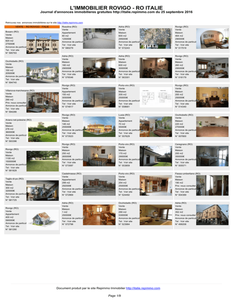 L'IMMOBILIER ROVIGO - RO ITALIE Journal d'annonces immobilieres gratuites http://italie.repimmo.com du 25 septembre 2016 Retrouvez nos annonces immobilières sur le site http://italie.repimmo.com VENTE - RO ROVIGO - ITALIE Bosaro (RO) Vente Maison 820 m2 275000€ Annonce de particulier Tel : Voir site N° 595793 Occhiobello (RO) Vente Maison 150 m2 205000€ Annonce de particulier Tel : Voir site N° 594740 Villanova-marchesana (RO) Vente Maison 290 m2 Prix: nous consulter Annonce de particulier Tel : Voir site N° 594286 Ariano-nel-polesine (RO) Vente Maison 278 m2 360000€ Annonce de particulier Tel : Voir site N° 593396 Rovigo (RO) Vente Maison 1100 m2 1500000€ Annonce de particulier Tel : Voir site N° 581828 Taglio-di-po (RO) Vente Maison 300 m2 320000€ Annonce de particulier Tel : Voir site N° 581725 Rovigo (RO) Vente Appartement 400 m2 590000€ Annonce de particulier Tel : Voir site N° 581290 Rosolina (RO) Vente Appartement 80 m2 125000€ Annonce de particulier Tel : Voir site N° 580279 Adria (RO) Vente Maison 600 m2 295000€ Annonce de particulier Tel : Voir site N° 572243 Rovigo (RO) Vente Maison 464 m2 290000€ Annonce de particulier Tel : Voir site N° 517519 Adria (RO) Vente Maison 180 m2 290000€ Annonce de particulier Tel : Voir site N° 576546 Adria (RO) Vente Maison 600 m2 300000€ Annonce de particulier Tel : Voir site N° 563301 Rovigo (RO) Vente Maison 260 m2 295000€ Annonce de particulier Tel : Voir site N° 516179 Rovigo (RO) Vente Appartement 150 m2 305000€ Annonce de particulier Tel : Voir site N° 574817 Porto-viro (RO) Vente Maison 205 m2 250000€ Annonce de particulier Tel : Voir site N° 558681 Rovigo (RO) Vente Maison 200 m2 250000€ Annonce de particulier Tel : Voir site N° 514340 Rovigo (RO) Vente Maison 146 m2 255000€ Annonce de particulier Tel : Voir site N° 573523 Lusia (RO) Vente Appartement 70 m2 55000€ Annonce de particulier Tel : Voir site N° 557629 Occhiobello (RO) Vente Maison 220 m2 270000€ Annonce de particulier Tel : Voir site N° 507800 Rovigo (RO) Vente Maison 250 m2 265000€ Annonce de particulier Tel : Voir site N° 573087 Porto-viro (RO) Vente Maison 170 m2 290000€ Annonce de particulier Tel : Voir site N° 553859 Ceregnano (RO) Vente Maison 200 m2 350000€ Annonce de particulier Tel : Voir site N° 505571 Castelmassa (RO) Vente Appartement 299 m2 292000€ Annonce de particulier Tel : Voir site N° 572869 Porto-viro (RO) Vente Maison 254 m2 250000€ Annonce de particulier Tel : Voir site N° 524492 Fiesso-umbertiano (RO) Vente Maison 190 m2 Prix: nous consulter Annonce de particulier Tel : Voir site N° 504389 Adria (RO) Vente Maison 1 m2 250000€ Annonce de particulier Tel : Voir site N° 572798 Occhiobello (RO) Vente Maison 290 m2 530000€ Annonce de particulier Tel : Voir site N° 523984 Adria (RO) Vente Maison 352 m2 Prix: nous consulter Annonce de particulier Tel : Voir site N° 499208 Document produit par le site Repimmo Immobilier http://italie.repimmo.com Page 1/9 L'IMMOBILIER ROVIGO - RO ITALIE Journal d'annonces immobilieres gratuites http://italie.repimmo.com du 25 septembre 2016 Rosolina (RO) Vente Maison 150 m2 Prix: nous consulter Annonce de particulier Tel : Voir site N° 497152 Rovigo (RO) Vente Maison 160 m2 280000€ Annonce de particulier Tel : Voir site N° 493355 Rosolina (RO) Vente Maison 250 m2 Prix: nous consulter Annonce de particulier Tel : Voir site N° 492118 Lendinara (RO) Vente Maison 400 m2 Prix: nous consulter Annonce de particulier Tel : Voir site N° 489812 Rosolina (RO) Vente Maison 180 m2 Prix: nous consulter Annonce de particulier Tel : Voir site N° 497060 Polesella (RO) Vente Maison 1066 m2 Prix: nous consulter Annonce de particulier Tel : Voir site N° 493250 Rosolina (RO) Vente Maison 180 m2 Prix: nous consulter Annonce de particulier Tel : Voir site N° 492025 Rovigo (RO) Vente Maison 210 m2 Prix: nous consulter Annonce de particulier Tel : Voir site N° 489316 Porto-viro (RO) Vente Maison 180 m2 Prix: nous consulter Annonce de particulier Tel : Voir site N° 497028 Adria (RO) Vente Maison 210 m2 Prix: nous consulter Annonce de particulier Tel : Voir site N° 493129 Occhiobello (RO) Vente Maison 216 m2 Prix: nous consulter Annonce de particulier Tel : Voir site N° 491102 Adria (RO) Vente Maison 165 m2 Prix: nous consulter Annonce de particulier Tel : Voir site N° 489239 Rovigo (RO) Vente Maison 385 m2 Prix: nous consulter Annonce de particulier Tel : Voir site N° 494208 Rosolina (RO) Vente Maison 140 m2 Prix: nous consulter Annonce de particulier Tel : Voir site N° 492916 Taglio-di-po (RO) Vente Maison 400 m2 Prix: nous consulter Annonce de particulier Tel : Voir site N° 490949 Rovigo (RO) Vente Appartement 190 m2 Prix: nous consulter Annonce de particulier Tel : Voir site N° 488718 Rosolina (RO) Vente Appartement 140 m2 Prix: nous consulter Annonce de particulier Tel : Voir site N° 494019 Rovigo (RO) Vente Maison 450 m2 Prix: nous consulter Annonce de particulier Tel : Voir site N° 492806 Adria (RO) Vente Maison 240 m2 Prix: nous consulter Annonce de particulier Tel : Voir site N° 490901 Rosolina (RO) Vente Maison 200 m2 Prix: nous consulter Annonce de particulier Tel : Voir site N° 488694 Rosolina (RO) Vente Maison 150 m2 Prix: nous consulter Annonce de particulier Tel : Voir site N° 493608 Lendinara (RO) Vente Maison 150 m2 Prix: nous consulter Annonce de particulier Tel : Voir site N° 492266 Porto-viro (RO) Vente Maison 200 m2 Prix: nous consulter Annonce de particulier Tel : Voir site N° 490834 Rosolina (RO) Vente Maison 250 m2 Prix: nous consulter Annonce de particulier Tel : Voir site N° 488464 Lendinara (RO) Vente Maison 220 m2 Prix: nous consulter Annonce de particulier Tel : Voir site N° 493558 Rosolina (RO) Vente Maison 150 m2 Prix: nous consulter Annonce de particulier Tel : Voir site N° 492254 Rosolina (RO) Vente Maison 130 m2 Prix: nous consulter Annonce de particulier Tel : Voir site N° 490786 Contarina (RO) Vente Maison 150 m2 P