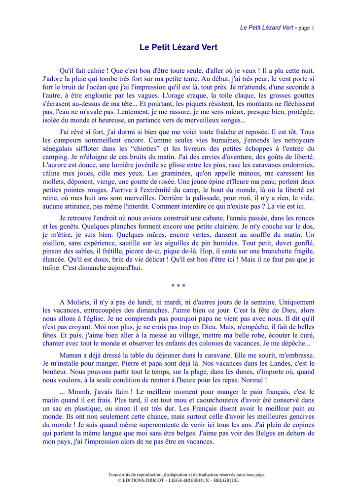 Le Petit Lézard Vert - page 1 Le Petit Lézard Vert Qu'il fait calme ! Que c'est bon d'être toute seule, d'aller où je veux ! Il a plu cette nuit. J'adore la pluie qui tombe très fort sur ma petite tente. Au début, j'ai très peur, le vent porte si fort le bruit de l'océan que j'ai l'impression qu'il est là, tout près. Je m'attends, d'une seconde à l'autre, à être engloutie par les vagues. L'orage craque, la toile claque, les grosses gouttes s'écrasent au-dessus de ma tête... Et pourtant, les piquets résistent, les montants ne fléchissent pas, l'eau ne m'avale pas. Lentement, je me rassure, je me sens mieux, presque bien, protégée, isolée du monde et heureuse, en partance vers de merveilleux songes... J'ai rêvé si fort, j'ai dormi si bien que me voici toute fraîche et reposée. Il est tôt. Tous les campeurs sommeillent encore. Comme seules vies humaines, j'entends les nettoyeurs sénégalais siffloter dans les “chiottes” et les livreurs des petites échoppes à l'entrée du camping. Je m'éloigne de ces bruits du matin. J'ai des envies d'aventure, des goûts de liberté. L'aurore est douce, une lumière juvénile se glisse entre les pins, rase les caravanes endormies, câline mes joues, cille mes yeux. Les graminées, qu'on appelle minous, me caressent les mollets, déposent, vierge, une goutte de rosée. Une jeune épine effleure ma peau; perlent deux petites pointes rouges. J'arrive à l'extrémité du camp, le bout du monde, là où la liberté est reine, où mes huit ans sont merveilles. Derrière la palissade, pour moi, il n'y a rien, le vide, aucune attirance, pas même l'interdit. Comment interdire ce qui n'existe pas ? La vie est ici. Je retrouve l'endroit où nous avions construit une cabane, l'année passée, dans les ronces et les genêts. Quelques planches forment encore une petite clairière. Je m'y couche sur le dos, je m'étire, je suis bien. Quelques mûres, encore vertes, dansent au souffle du matin. Un oisillon, sans expérience, sautille sur les aiguilles de pin humides. Tout petit, duvet gonflé, pinson des sables, il frétille, picore de-ci, pique de-là. Hop, il saute sur une branchette fragile, élancée. Qu'il est doux, brin de vie délicat ! Qu'il est bon d'être ici ! Mais il ne faut pas que je traîne. C'est dimanche aujourd'hui. *** A Moliets, il n'y a pas de lundi, ni mardi, ni d'autres jours de la semaine. Uniquement les vacances, entrecoupées des dimanches. J'aime bien ce jour. C'est la fête de Dieu, alors nous allons à l'église. Je ne comprends pas pourquoi papa ne vient pas avec nous. Il dit qu'il n'est pas croyant. Moi non plus, je ne crois pas trop en Dieu. Mais, n'empêche, il fait de belles fêtes. Et puis, j'aime bien aller à la messe au village, mettre ma belle robe, écouter le curé, chanter avec tout le monde et observer les enfants des colonies de vacances. Je me dépêche... Maman a déjà dressé la table du déjeuner dans la caravane. Elle me sourit, m'embrasse. Je m'installe pour manger. Pierre et papa sont déjà là. Nos vacances dans les Landes, c'est le bonheur. Nous pouvons partir tout le temps, sur la plage, dans les dunes, n'importe où, quand nous voulons, à la seule condition de rentrer à l'heure pour les repas. Normal ! ... Mmmh, j'avais faim ! Le meilleur moment pour manger le pain français, c'est le matin quand il est frais. Plus tard, il est tout mou et caoutchouteux d'avoir été conservé dans un sac en plastique, ou sinon il est très dur. Les Français disent avoir le meilleur pain au monde. Ils ont non seulement cette chance, mais surtout celle d'avoir les meilleures gencives du monde ! Je suis quand même supercontente de venir ici tous les ans. J'ai plein de copines qui parlent la même langue que moi sans être belges. J'aime pas voir des Belges en dehors de mon pays, j'ai l'impression alors de ne pas être en vacances. Tous droits de reproduction, d'adaptation et de traduction réservés pour tous pays. © EDITIONS DRICOT – LIEGE-BRESSOUX – BELGIQUE. Le Petit Lézard Vert - page 2 Mais je me perds dans mes pensées et il faut me préparer pour la messe... Que c'est agréable ! Quitter mon maillot et me glisser, pour la première fois depuis une semaine, dans une petite culotte douce et propre; moelleux sur la peau; une robe légère, de jolies chaussettes blanches, je parais encore plus bronzée. L'église du village est toute simple. J'ai beau savoir qu'il y fait frais, j'ai toujours la même sensation en entrant. Un frisson me parcourt tout le corps, la chair de poule hérisse mes bras. Peut-être est-ce l'émotion d'être de la fête. Ou d'entendre les chants répétés avant la cérémonie. Je me colle à ma jolie maman, maquillée et sérieuse. Je me sens bien. J'aime bien écouter ce curé. Pas seulement pour son accent ensoleillé, mais aussi pour ses mots percutants, ses phrases de combattant, pour sa foi et son Dieu. Quelques chaises devant moi, un garçon semble très attentif au sermon. Je vois ses longs cheveux blonds rire de temps en temps. Je voudrais voir son visage, s'il est joli. En tout cas, je préfère le regarder lui, de dos, que ces sots des colonies qui se pincent en rigolant. La fin de la messe, déjà. Il part vite. Un short bleu et un tee-shirt jaune s'éloignent, je ne vois toujours pas sa figure, tant pis ! Le dernier chant s'élève. Ici, tout le monde chante avec élan et ferveur. C'est même agaçant parfois de les voir rivaliser de cœur, s'exhiber leur joie, sourire leur force, s'unir de leur foi. Tout cela me semble trop fort et trop visible pour être sincère. Mais je peux me tromper. La différence est tellement flagrante par rapport aux messes, chez nous, en Belgique où tous s'ennuient à mourir (ou font bien semblant). Debout, assis, debout, assis, quelques phrases murmurées, quelques notes susurrées, et ouf, fini ! Par ici la sortie, un paquet de bonnes résolutions sous le bras et le devoir accompli. Je ne sais pas pourquoi cette passivit